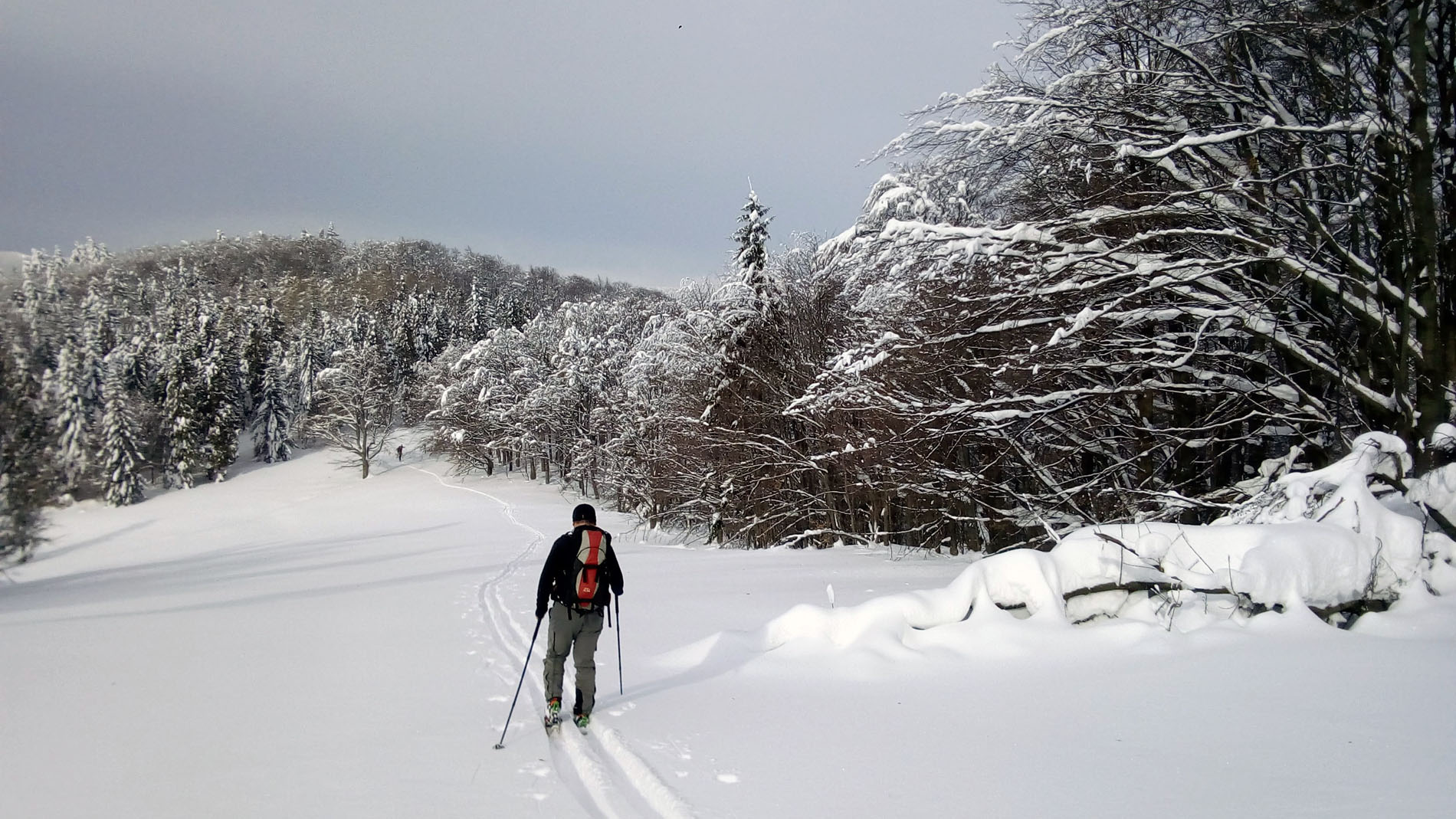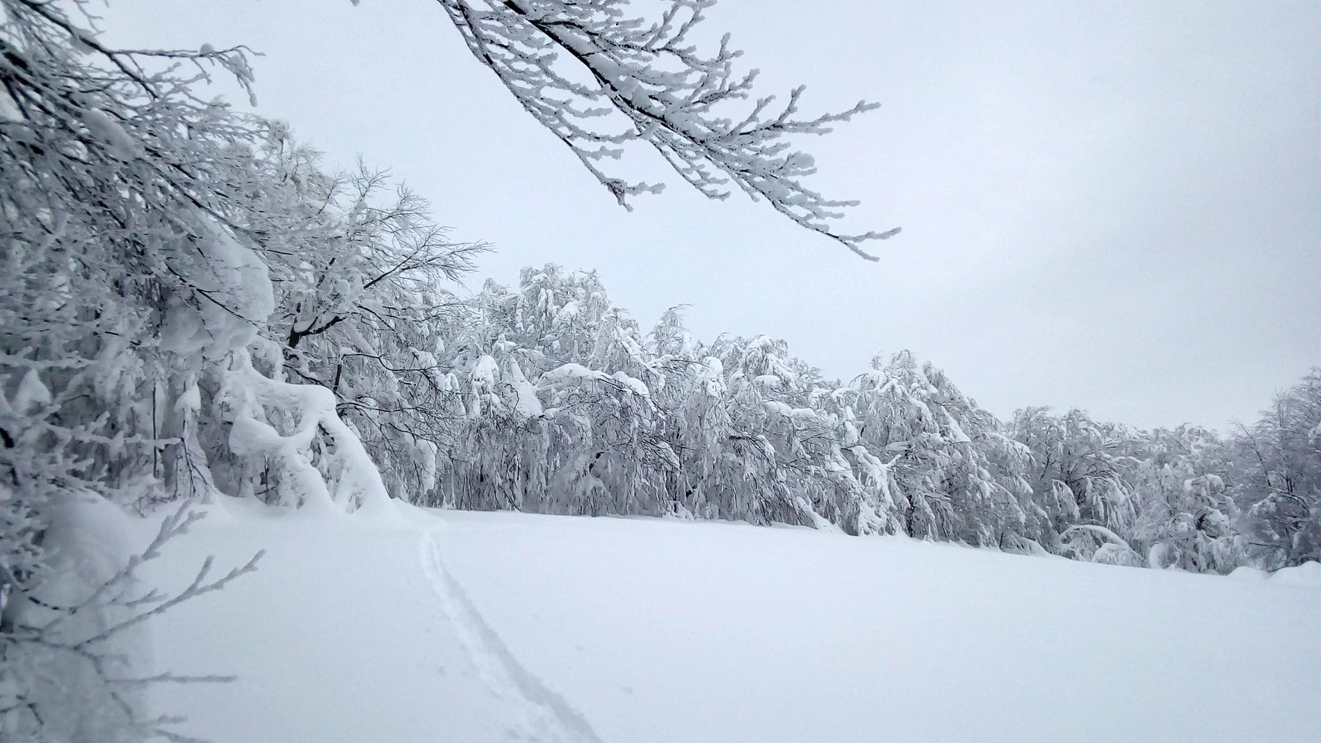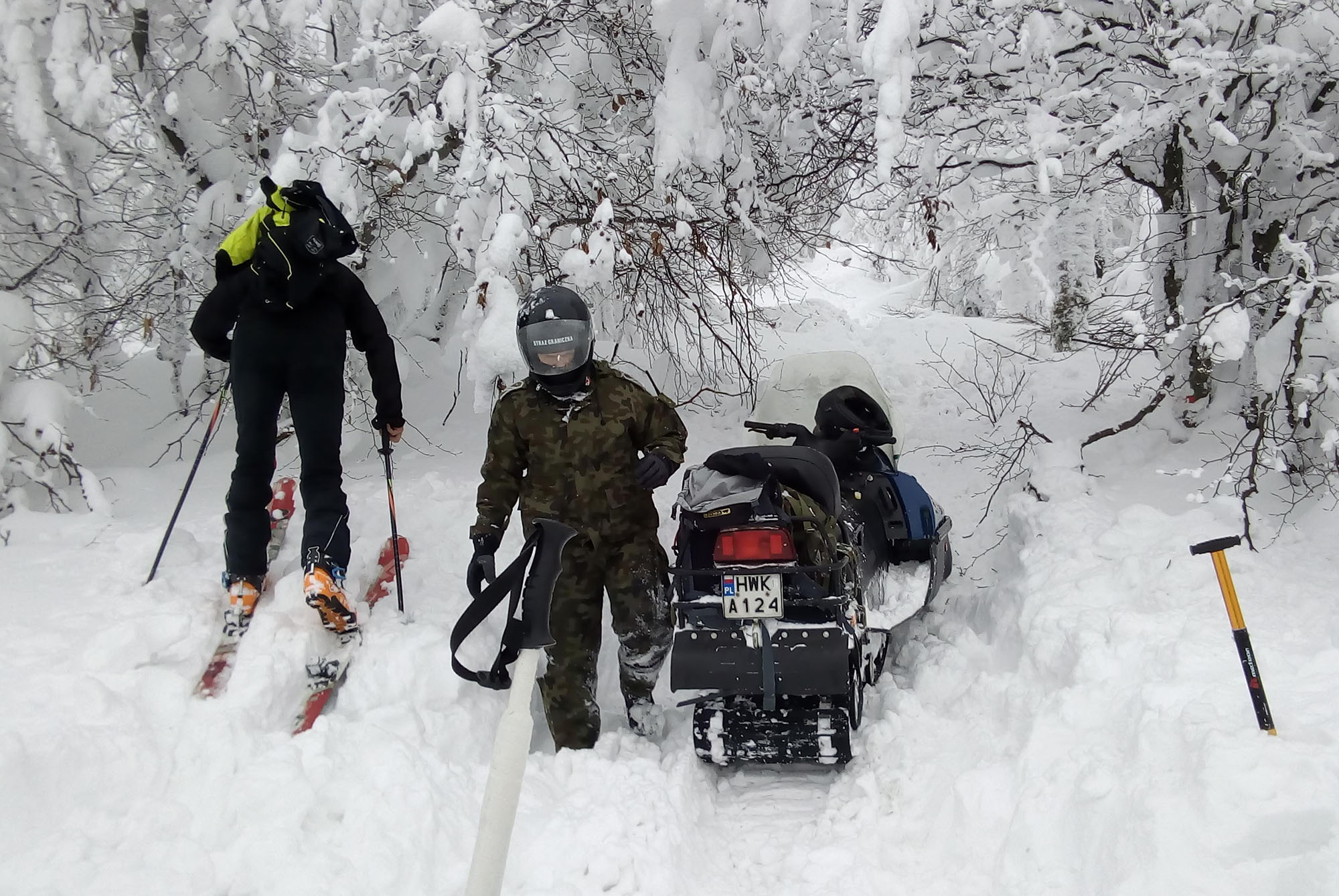 Naokolo, ale stále mierne do kopca. Snehu pribúda, bukový prales sa postupne mení na neuveriteľnú nonstop zimnú rozprávku. Za Čierťažou 1071 m n.m., už na poľsko-slovenskej hranici konečne narazíme na dlho sľubovanú čerstvú skútrovku. Radosť končí po 500 m, kde dvaja poľskí vojaci vyhrabávajú svoj skúter zo snehu. "Pekná romantická robota jazdiť po horách na skútri" vravím im.