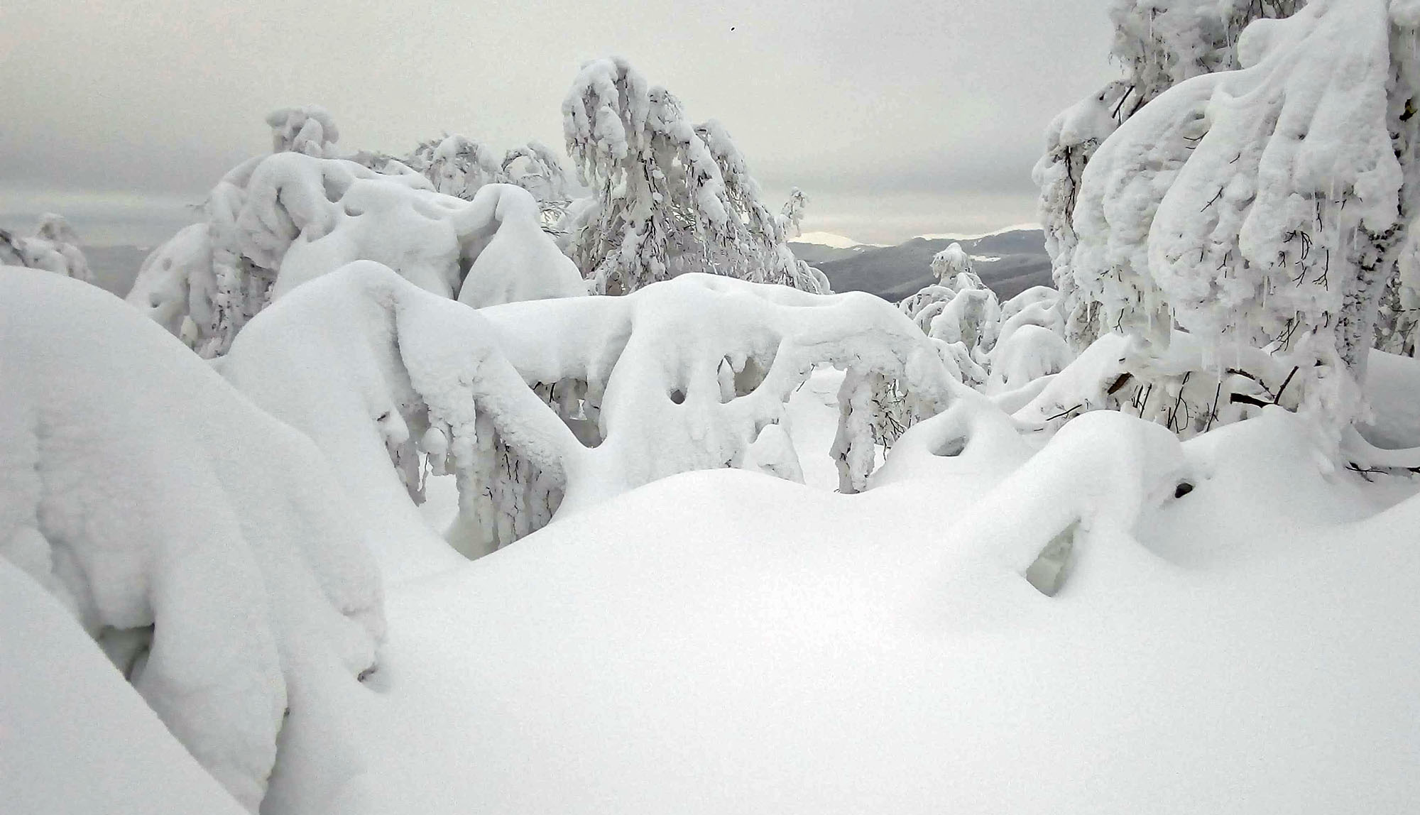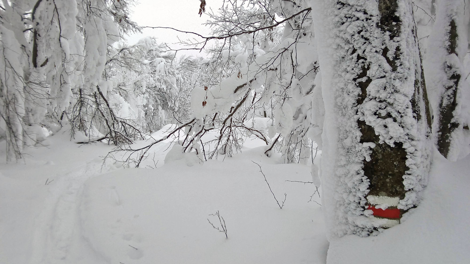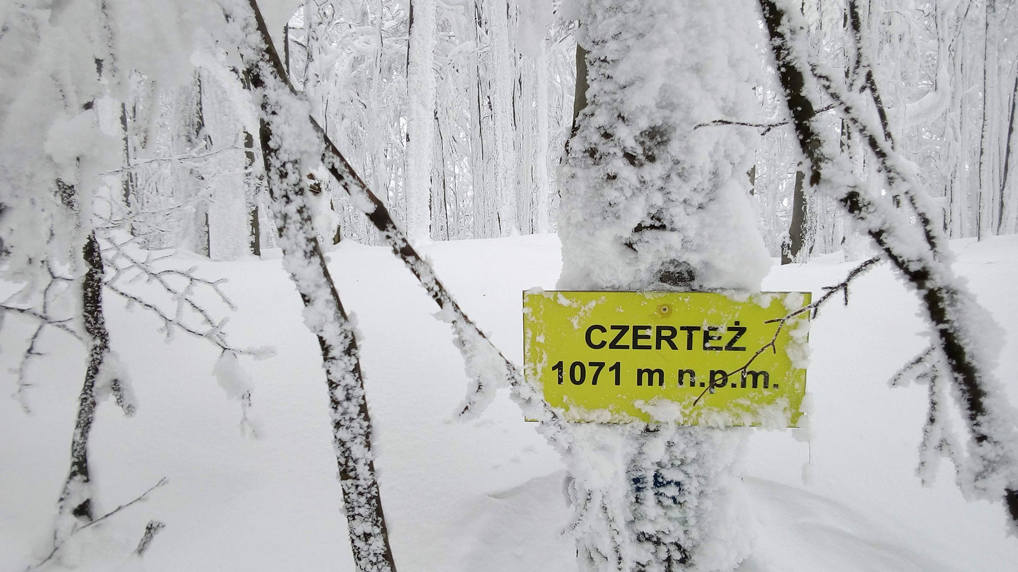 Dva metre snehu dokonale zakryli okolité lesy zapísané v UNESCO, všetko okrem kamenného stĺpu a orientačných tabuliek. Aby toho nebolo málo, len pár km odtiaľ na ukrajinskej strane pri obci Kňahyňa v roku 1966 spadol 500 kg meteorit. Možno ako akýsi vesmírny pozdrav tomuto čarovnému miestu...