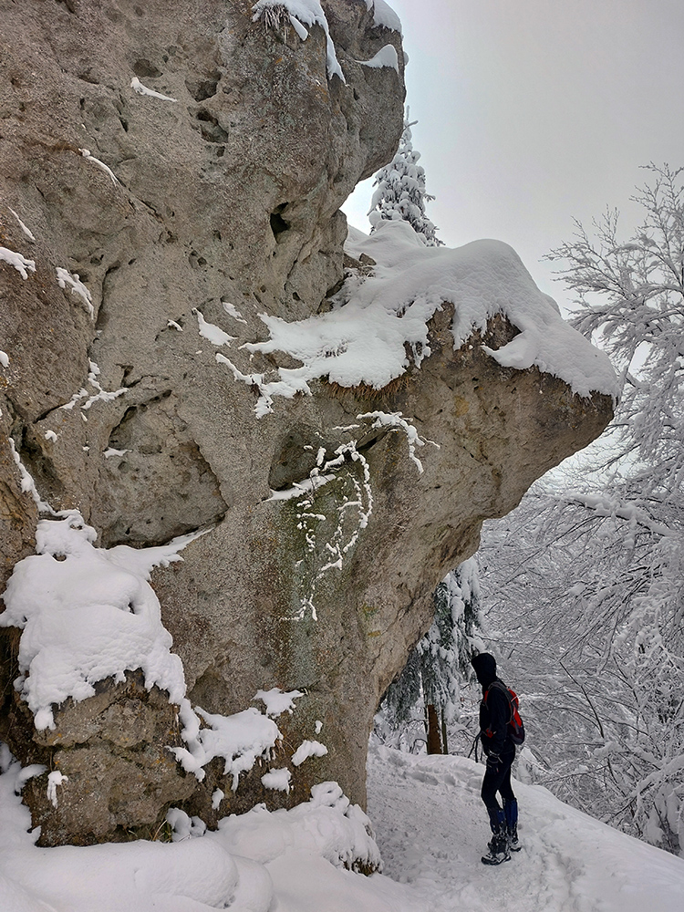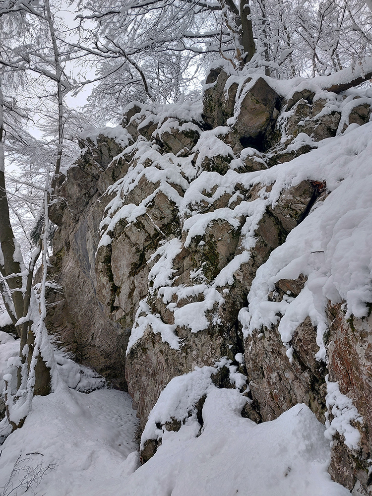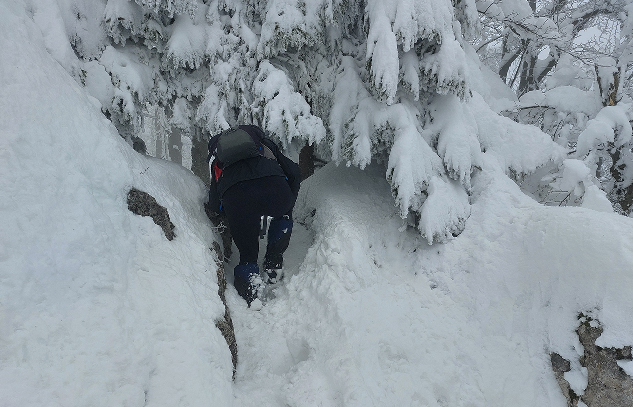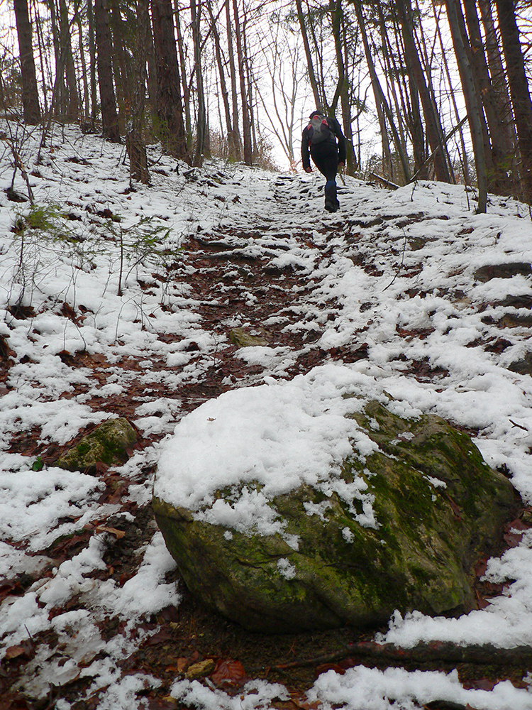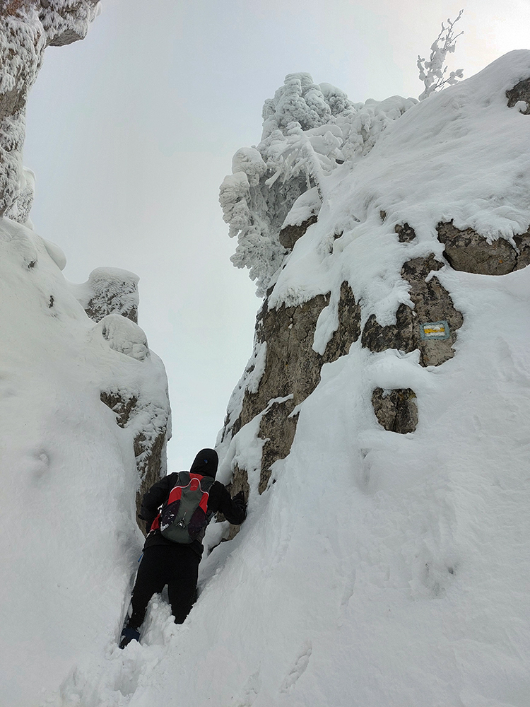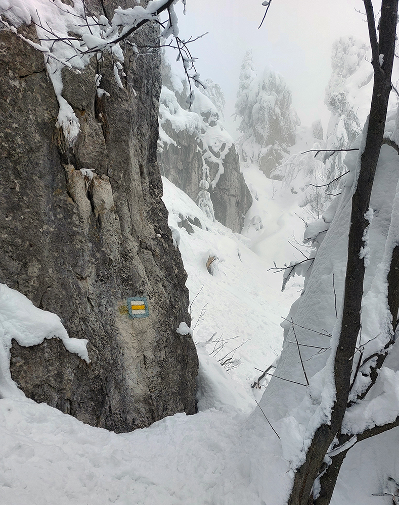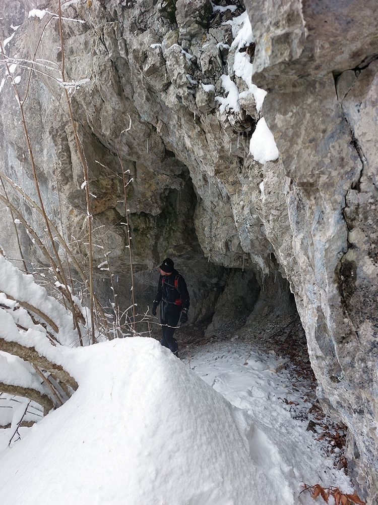 Po obhliadke sme sa teda pobrali - čoraz vyššie a nohami čoraz hlbšie. Žltú sme síce na chvíľu hneď na začiatku stratili, potom ale už bez pochýb až do konca – stromy našťastie nemali snehom obalené kmene, len koruny. Ešte sme si vychutnali krátku (značenú) odbočku a návštevu jednej z mnohých jaskyniek v tomto vápencovom masíve, a nasledovala dlhá, strmá a výživná robota až ku krížu.