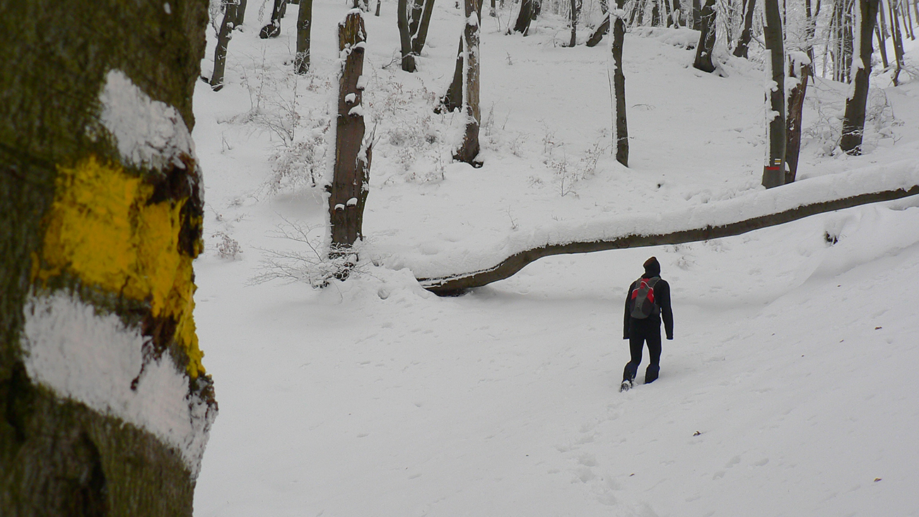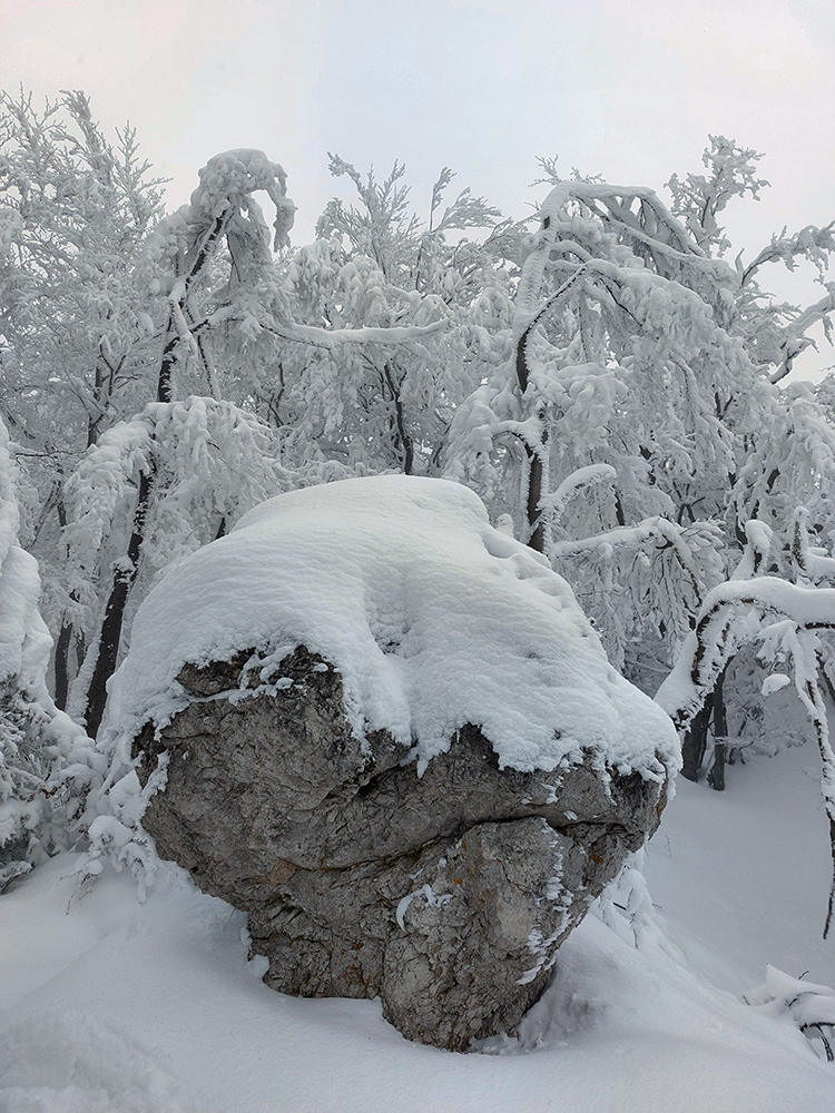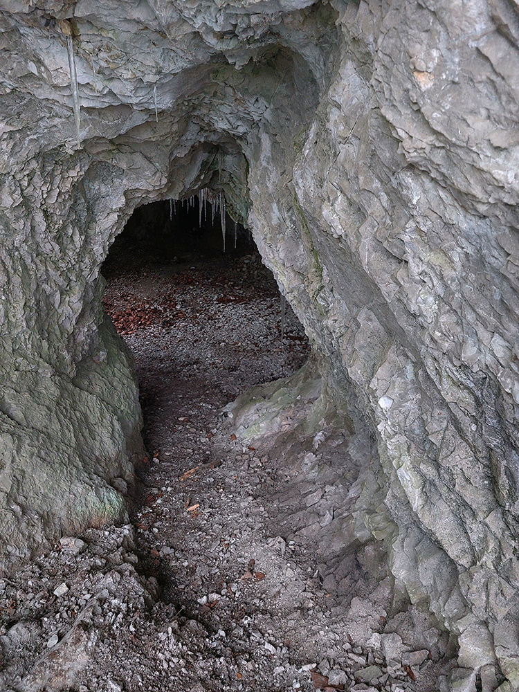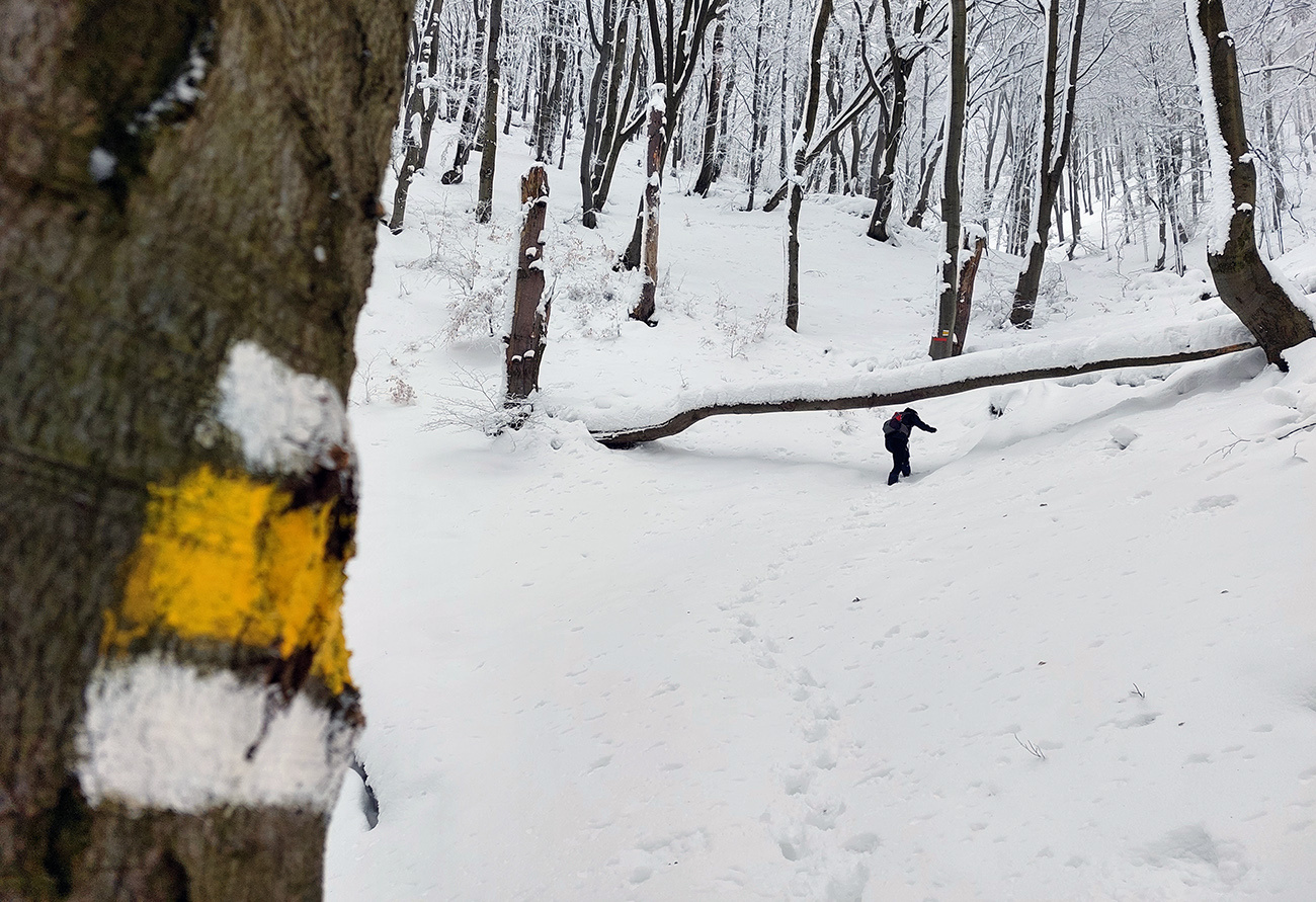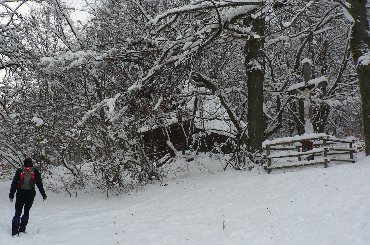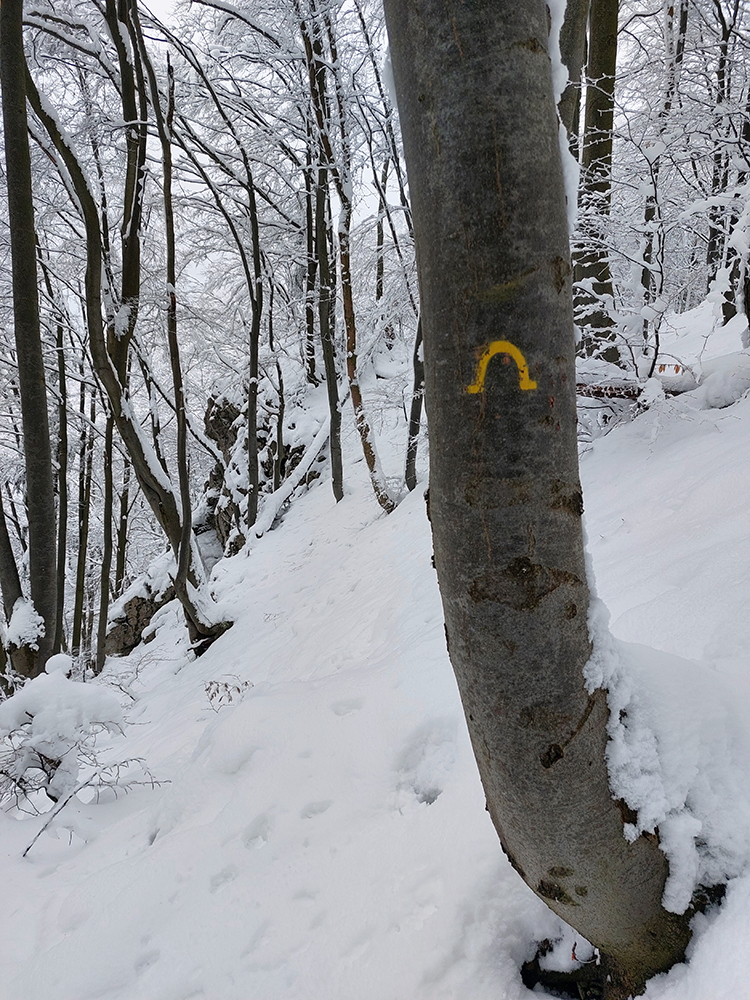 Po obhliadke sme sa teda pobrali - čoraz vyššie a nohami čoraz hlbšie. Žltú sme síce na chvíľu hneď na začiatku stratili, potom ale už bez pochýb až do konca – stromy našťastie nemali snehom obalené kmene, len koruny. Ešte sme si vychutnali krátku (značenú) odbočku a návštevu jednej z mnohých jaskyniek v tomto vápencovom masíve, a nasledovala dlhá, strmá a výživná robota až ku krížu.