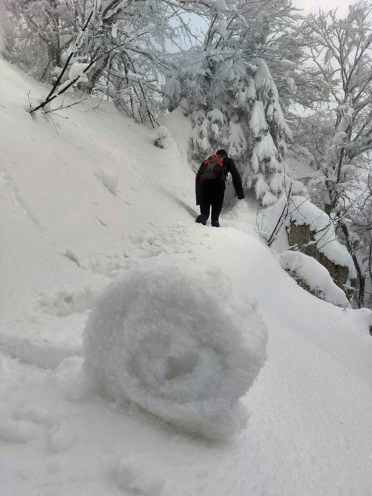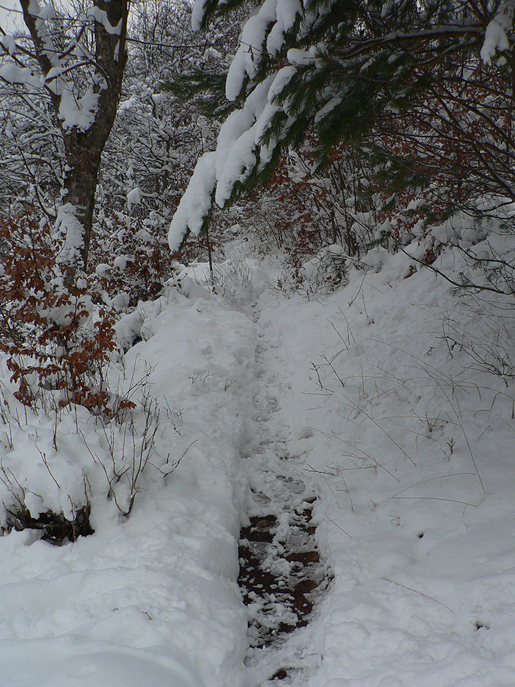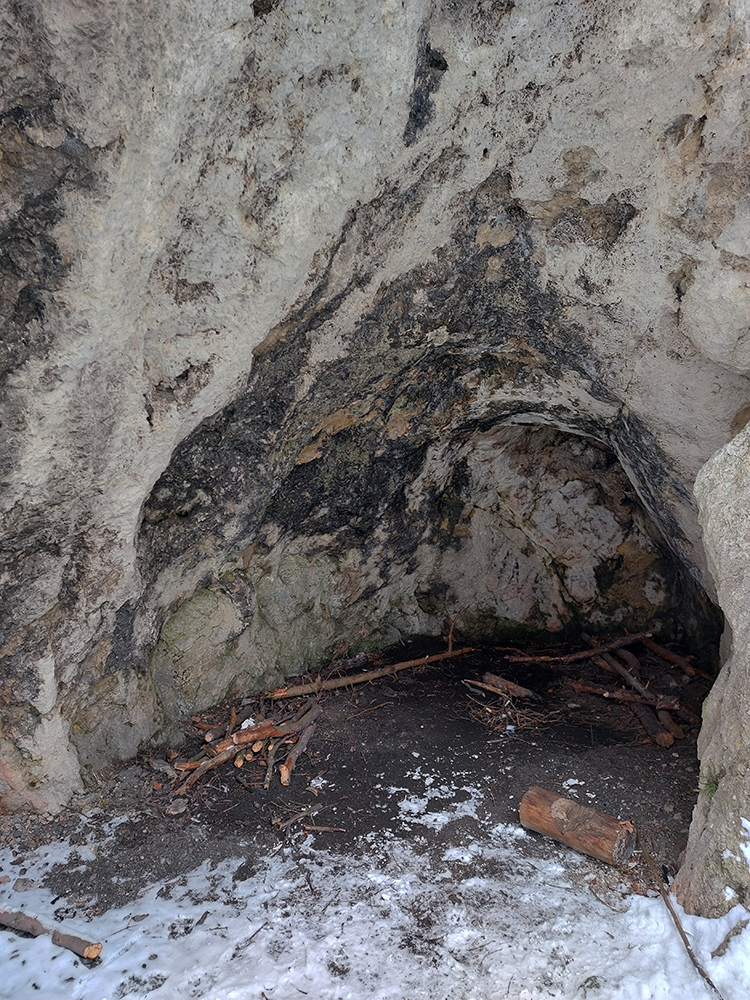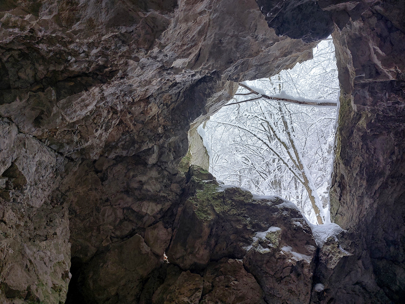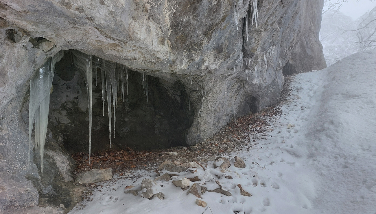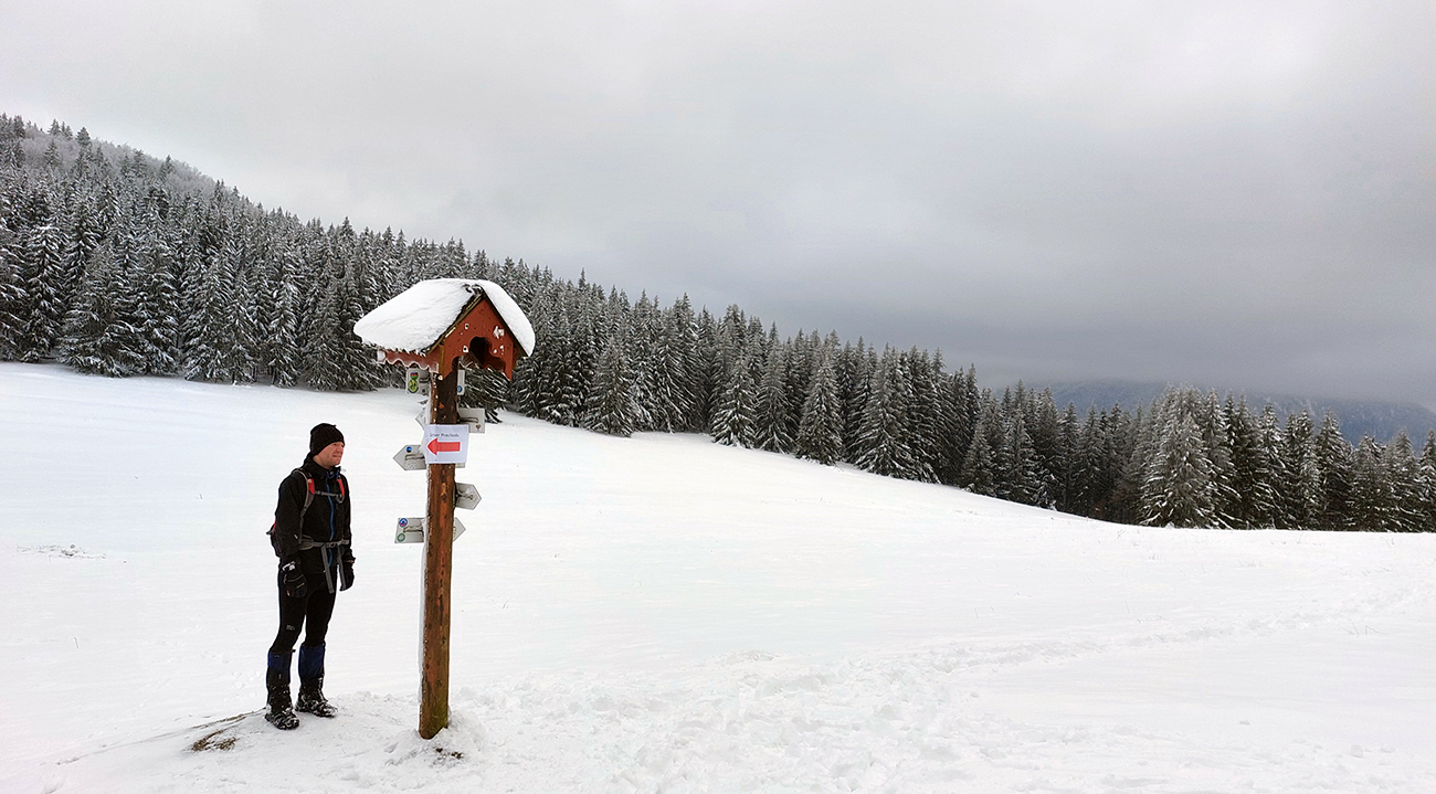 Po obhliadke sme sa teda pobrali - čoraz vyššie a nohami čoraz hlbšie. Žltú sme síce na chvíľu hneď na začiatku stratili, potom ale už bez pochýb až do konca – stromy našťastie nemali snehom obalené kmene, len koruny. Ešte sme si vychutnali krátku (značenú) odbočku a návštevu jednej z mnohých jaskyniek v tomto vápencovom masíve, a nasledovala dlhá, strmá a výživná robota až ku krížu.