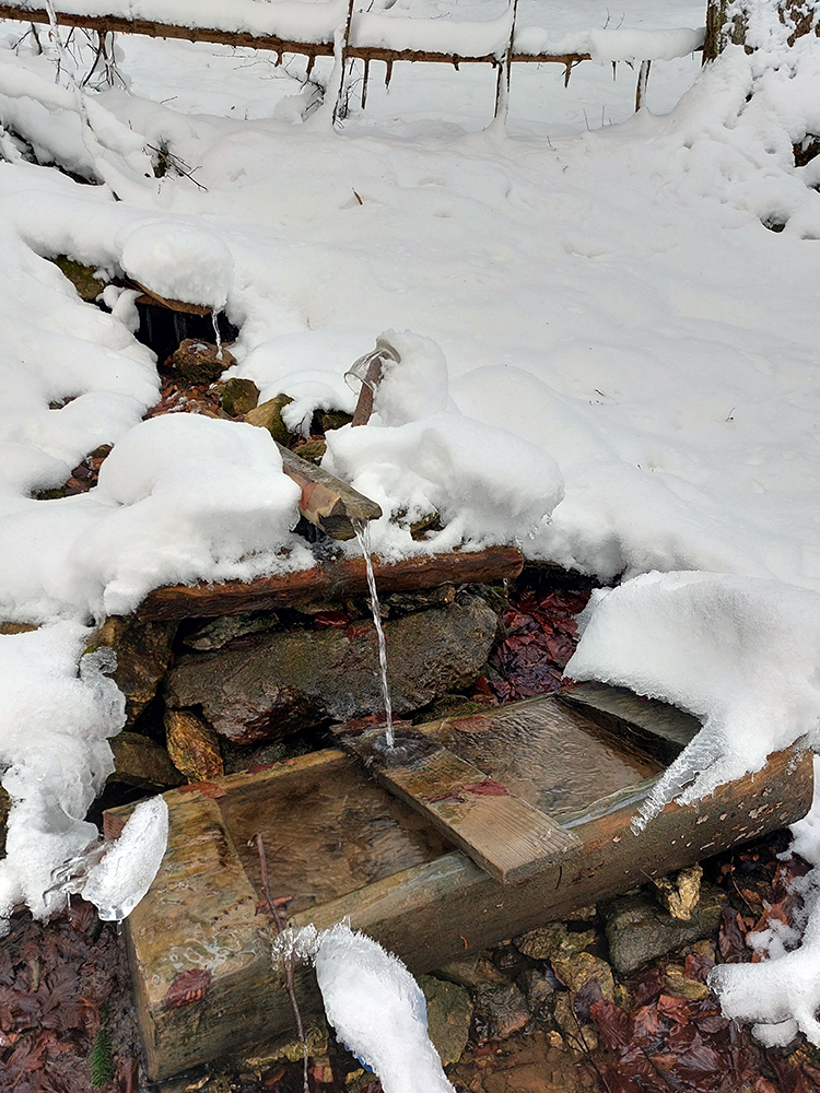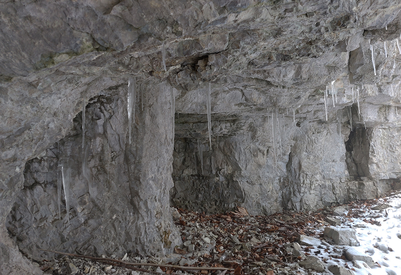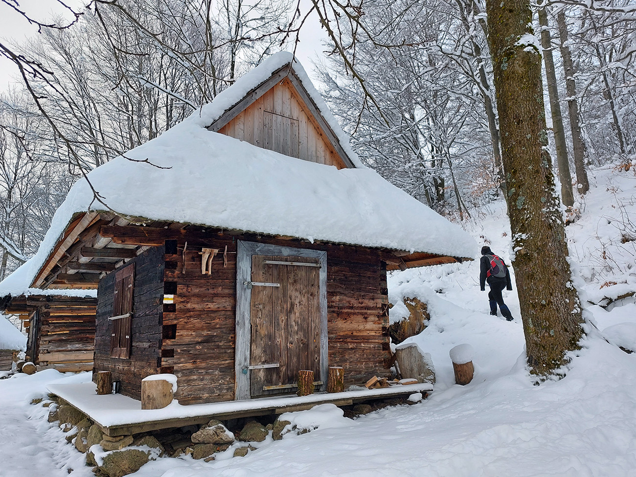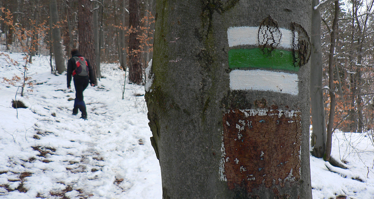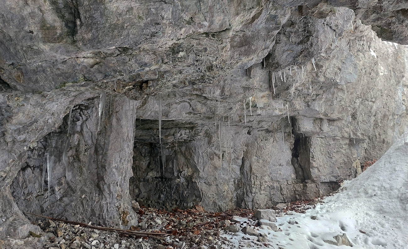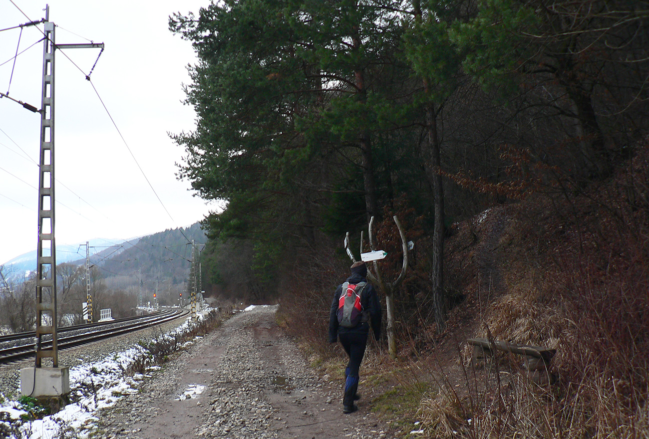Po obhliadke sme sa teda pobrali - čoraz vyššie a nohami čoraz hlbšie. Žltú sme síce na chvíľu hneď na začiatku stratili, potom ale už bez pochýb až do konca – stromy našťastie nemali snehom obalené kmene, len koruny. Ešte sme si vychutnali krátku (značenú) odbočku a návštevu jednej z mnohých jaskyniek v tomto vápencovom masíve, a nasledovala dlhá, strmá a výživná robota až ku krížu.