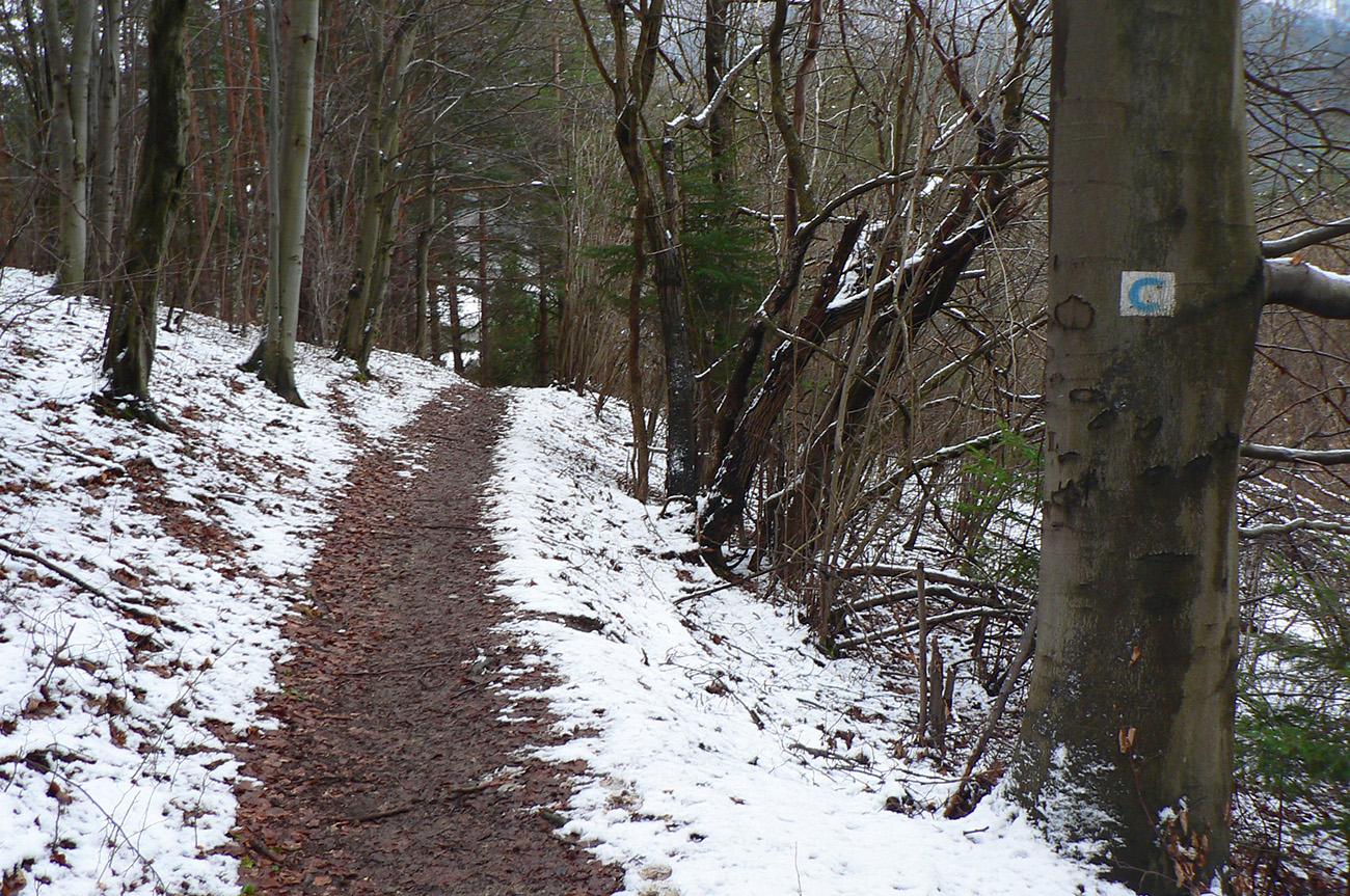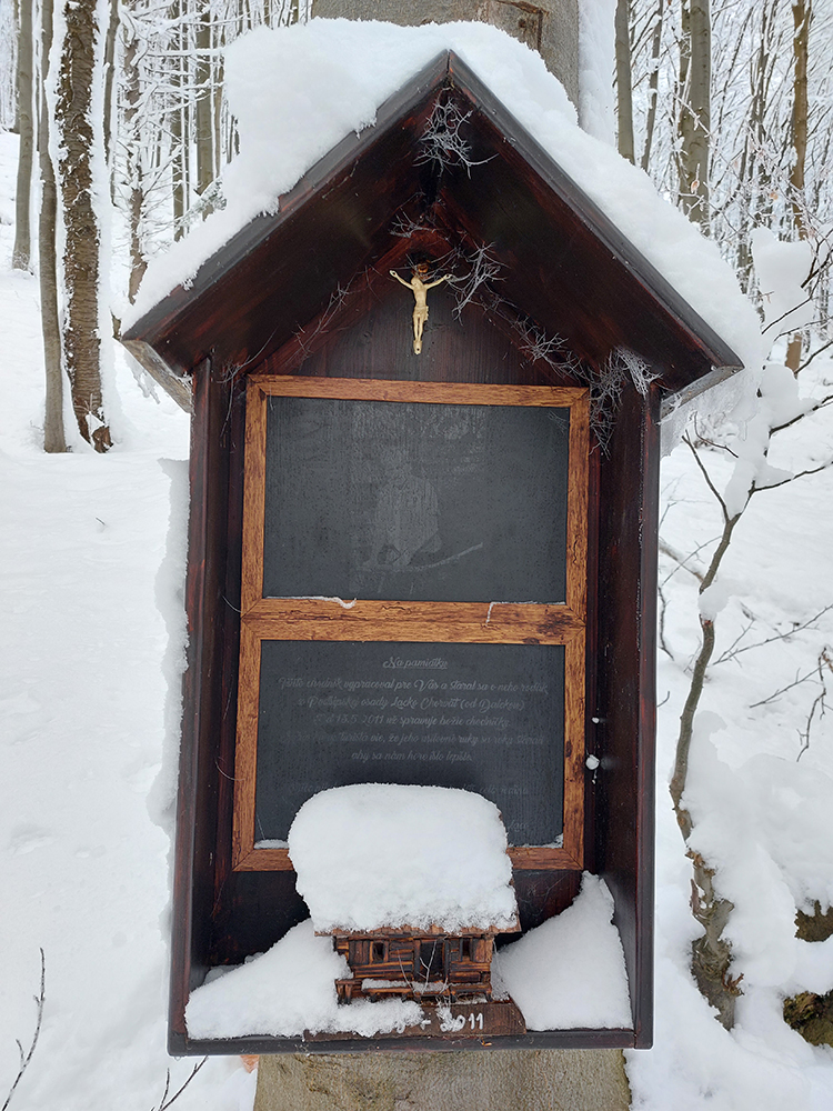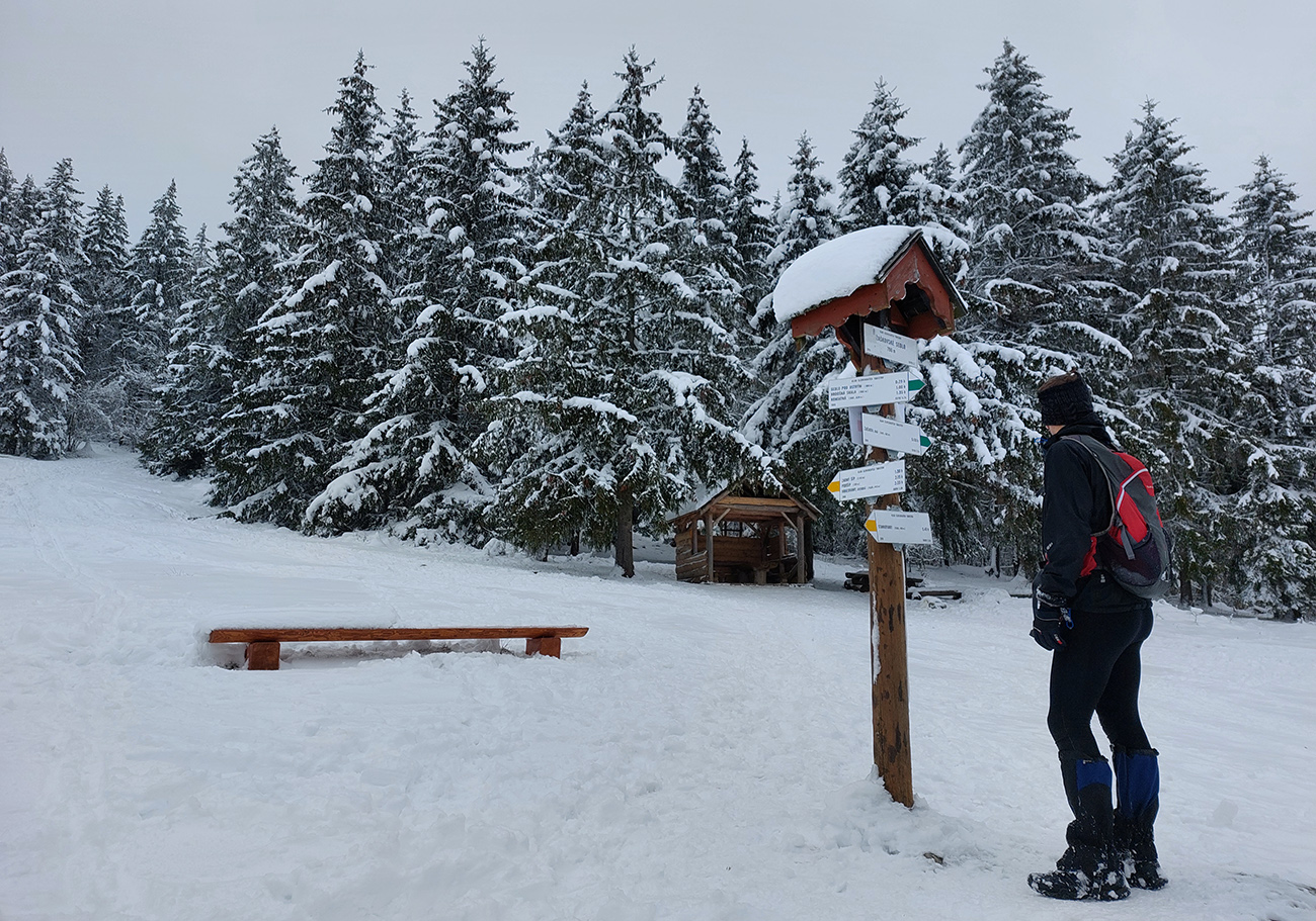 Takže sme sa striedali dvaja, celkom to išlo, našťastie bol ten sneh ešte suchý, čo už o pár dní prestalo platiť. Bola by to iná sranda v mokrom alebo v kôrke, ktorej sme mali celkom dosť aj na tých pár posledných metroch pod krížom. A pritom aký kontrast – dole v dedine suché cesty, na chodníku na Podšíp ledva trochu mokrého snehu a stopa pekne prechodená. Predčasne sme sa ale cestou tešili na stopu až hore, končila akoby uťal - pri dreveniciach. Tam inak končí aj zelená značka zo Stankovian, už pár rokov oficiálne značená. Aj cykloznačky sú tu stále, len stále nikde nevisí upozornenie, že je to cyklotrasa len jednosmerná a pre zjazdárov :-)
