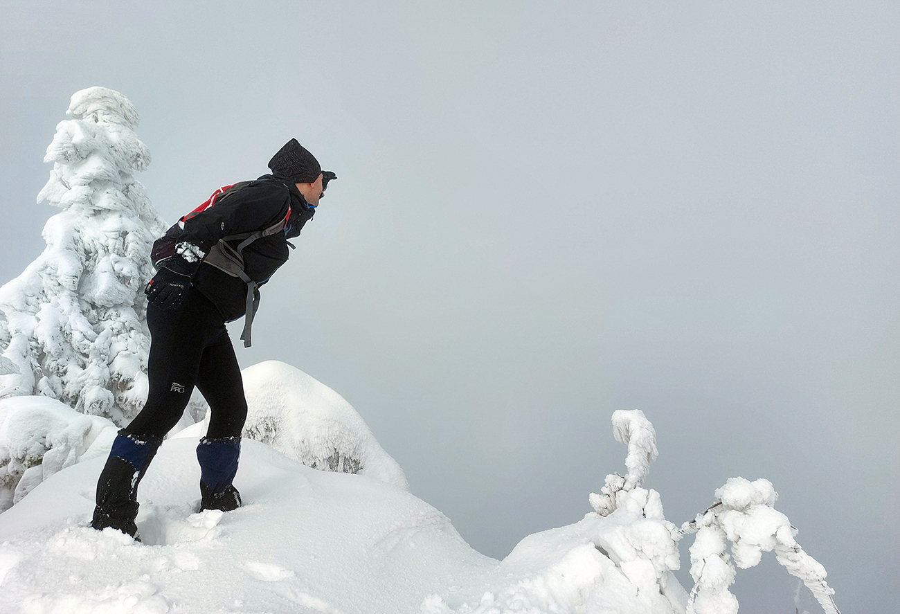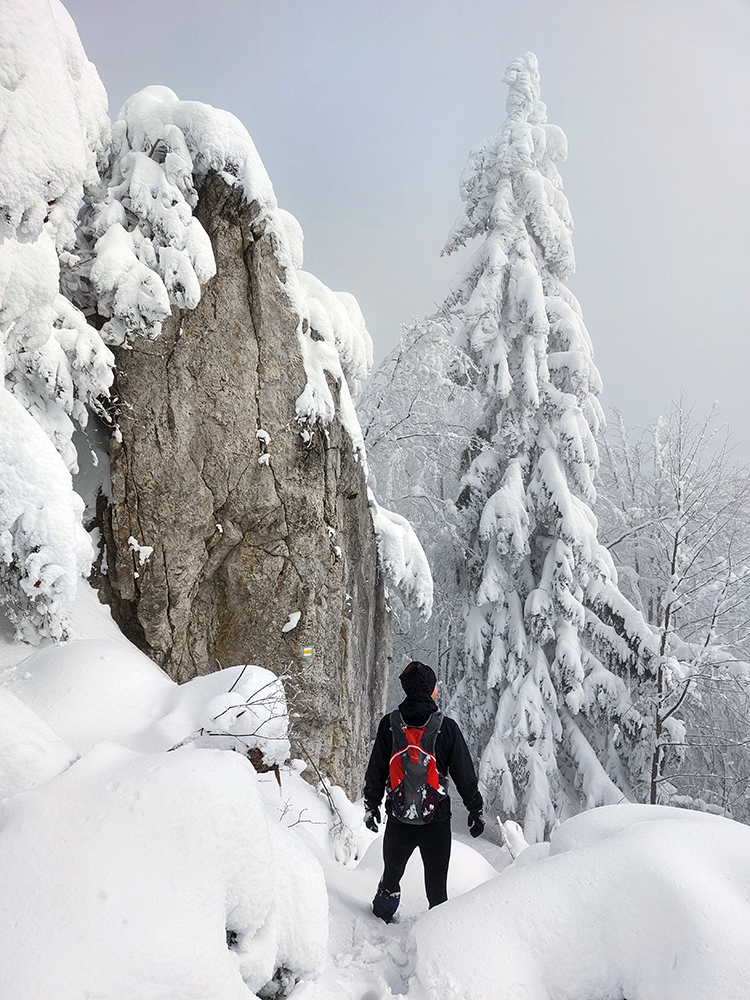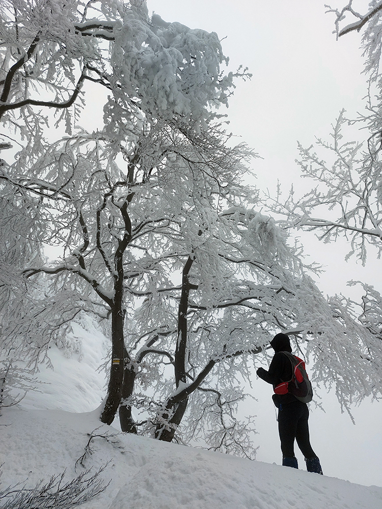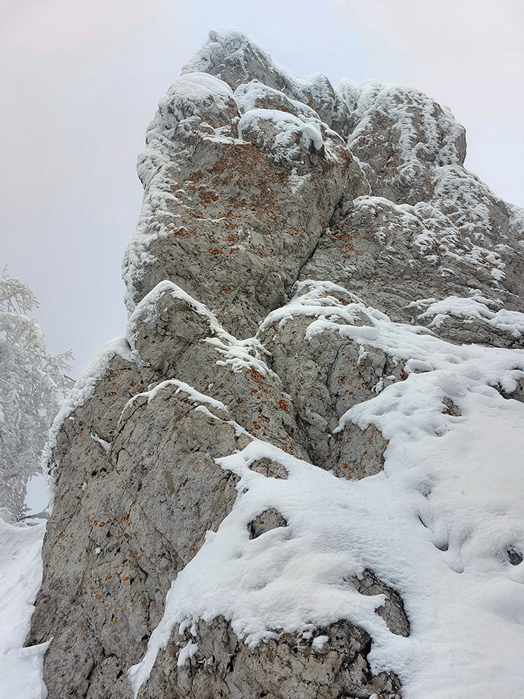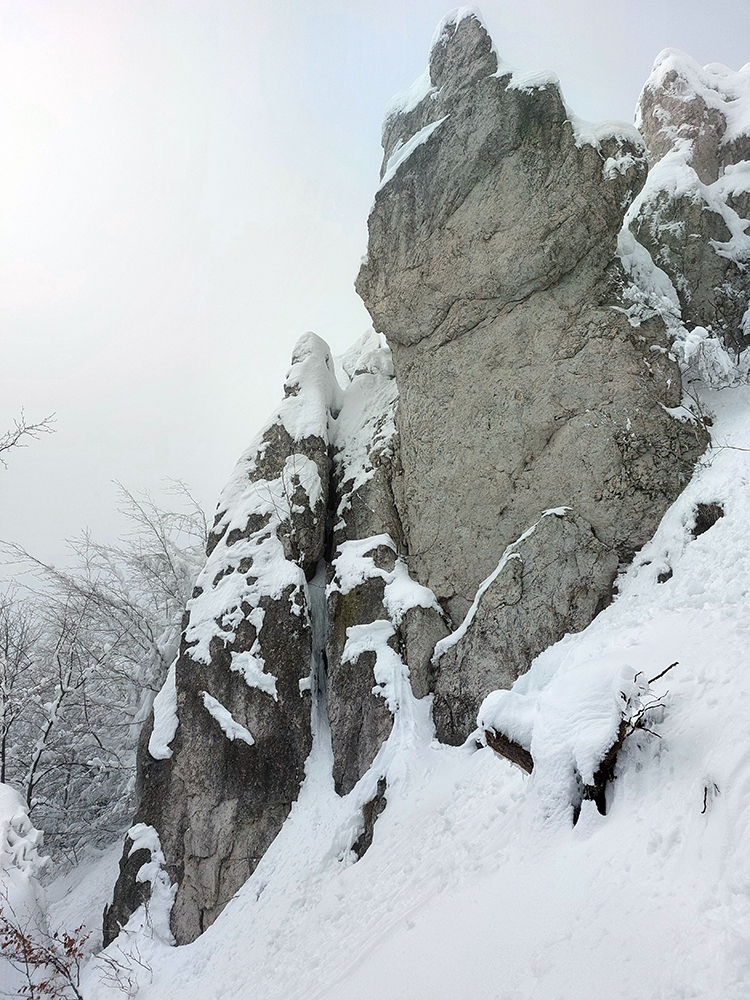Netreba sa diviť, prečo nebol z tejto strany a o tomto čase chodník prechodený – je to superstrmý výstup, náročný aj za sucha. Obielené stromy a s výškou pribúdajúce skalky, bralá a vežičky mu ale teraz dodávali osobitné čaro, a keďže sme sa neponáhľali, bolo pri vydýchavaní aj napriek hmle a čiernobielemu svetu stále na čo pozerať.