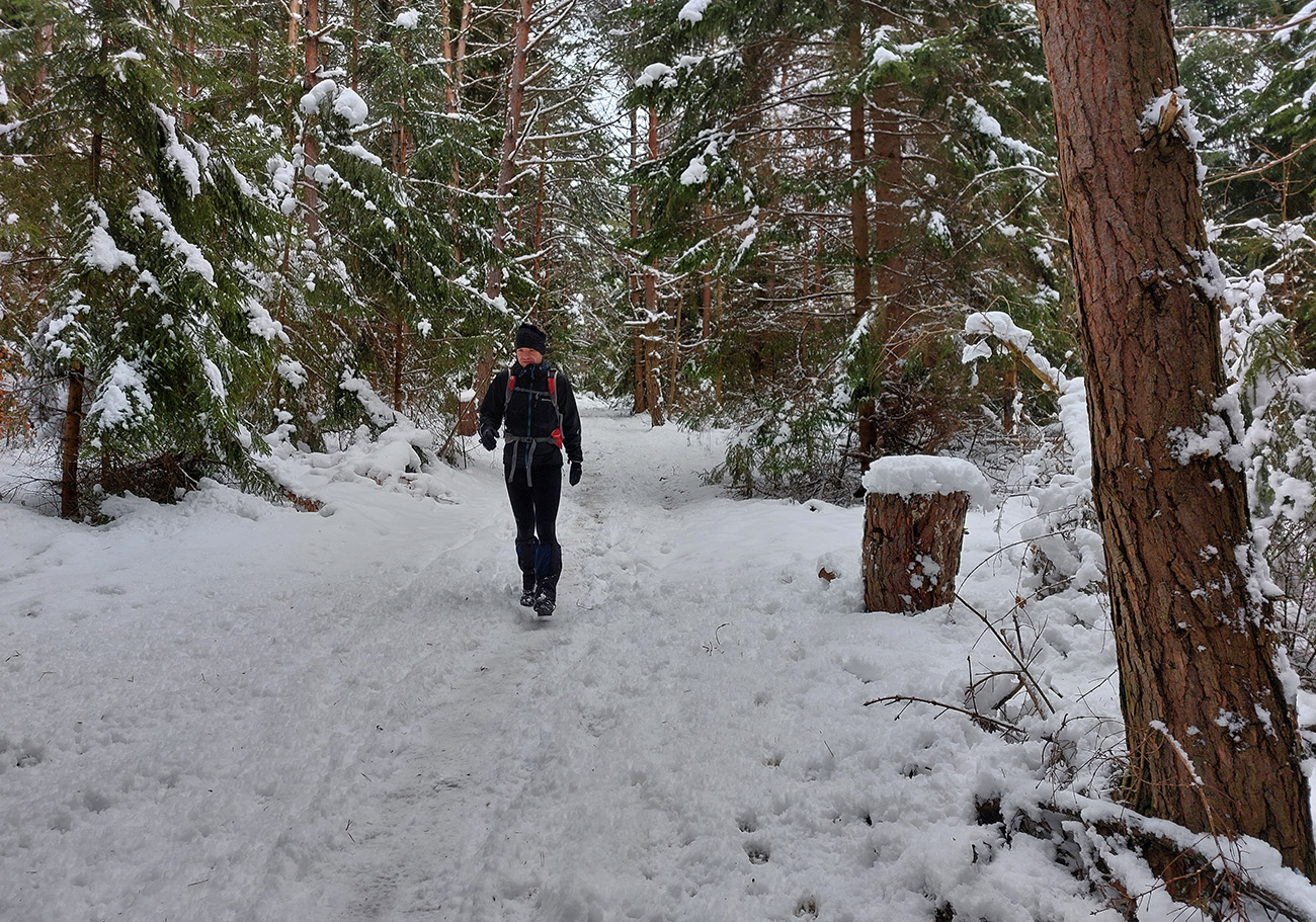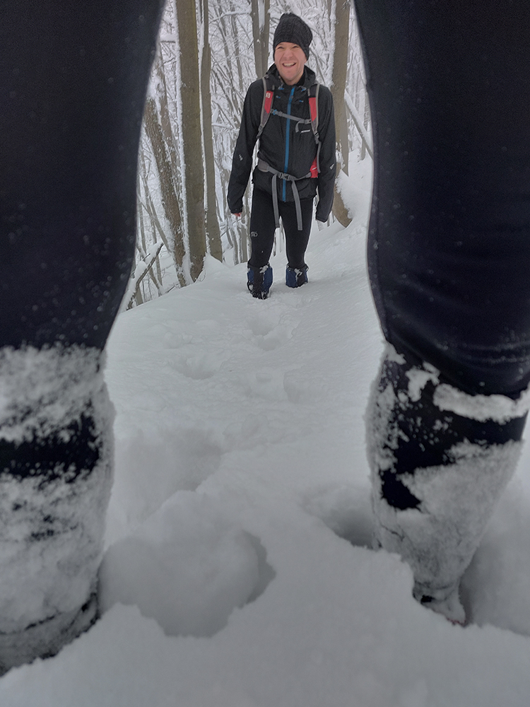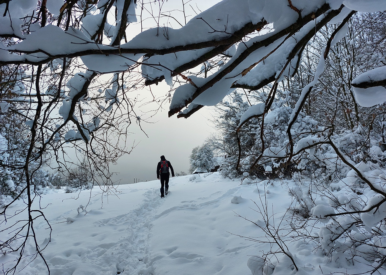 Netreba sa diviť, prečo nebol z tejto strany a o tomto čase chodník prechodený – je to superstrmý výstup, náročný aj za sucha. Obielené stromy a s výškou pribúdajúce skalky, bralá a vežičky mu ale teraz dodávali osobitné čaro, a keďže sme sa neponáhľali, bolo pri vydýchavaní aj napriek hmle a čiernobielemu svetu stále na čo pozerať.