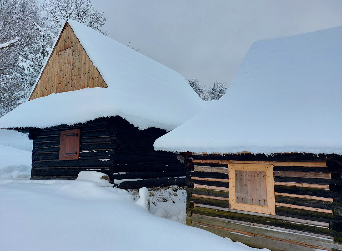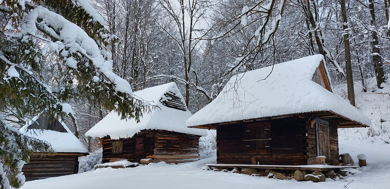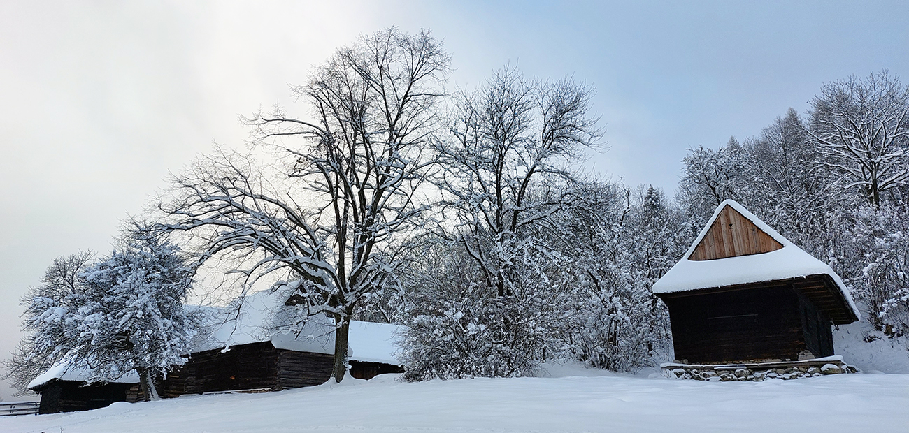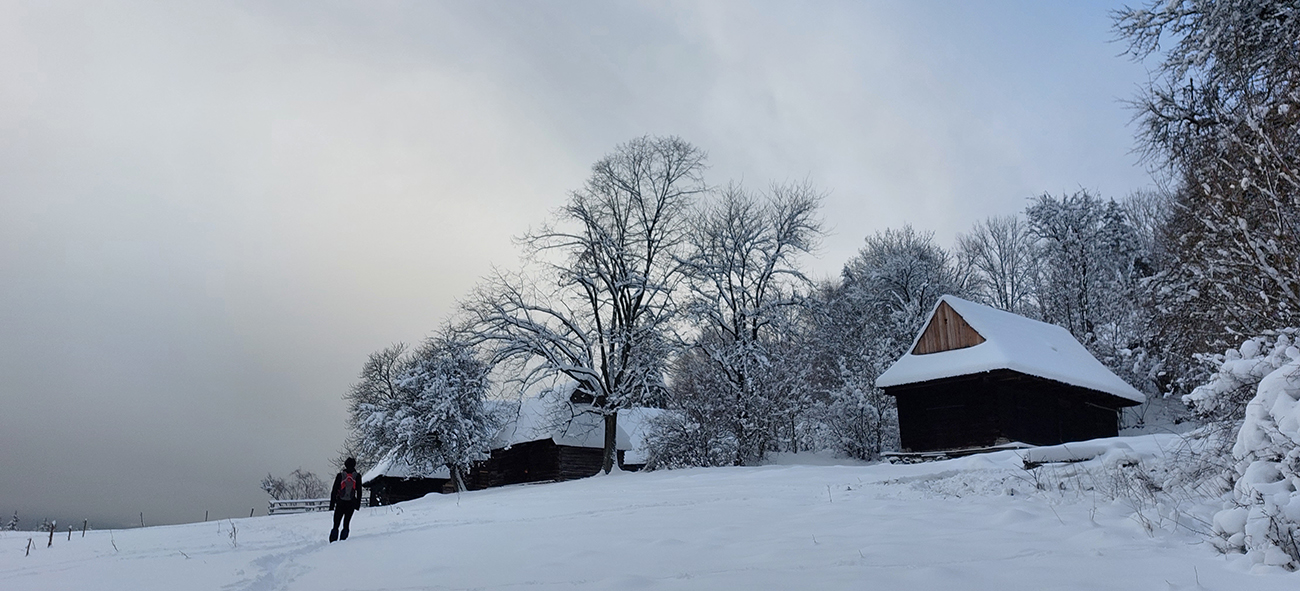 Takže Podšíp: v pravej zimnej atmosfére s kopami snehu mala známa dreveničkárska osada neskutočnú atmosféru, ako z reklamy na pravé slovenské vianoce :-) Len o kúsok nižšie nám to pod nohami čvachtalo a sneh sa striedal s blatom, medzi chalúpkami sme už ale našli ozajstnú zimnú rozprávku. Nikde nikto a to ticho! Už len tie výhľady na Krivánsku Fatru chýbali.