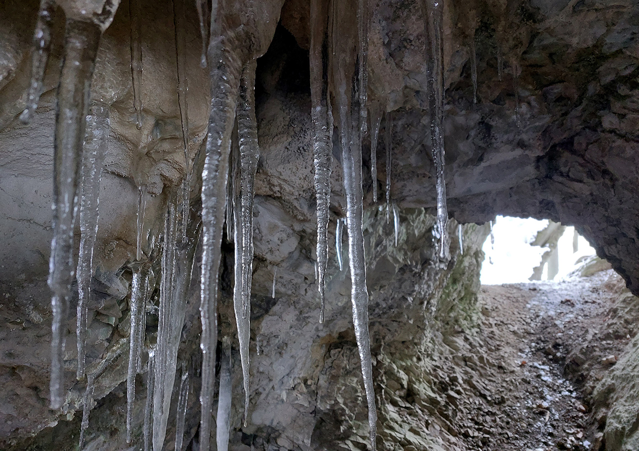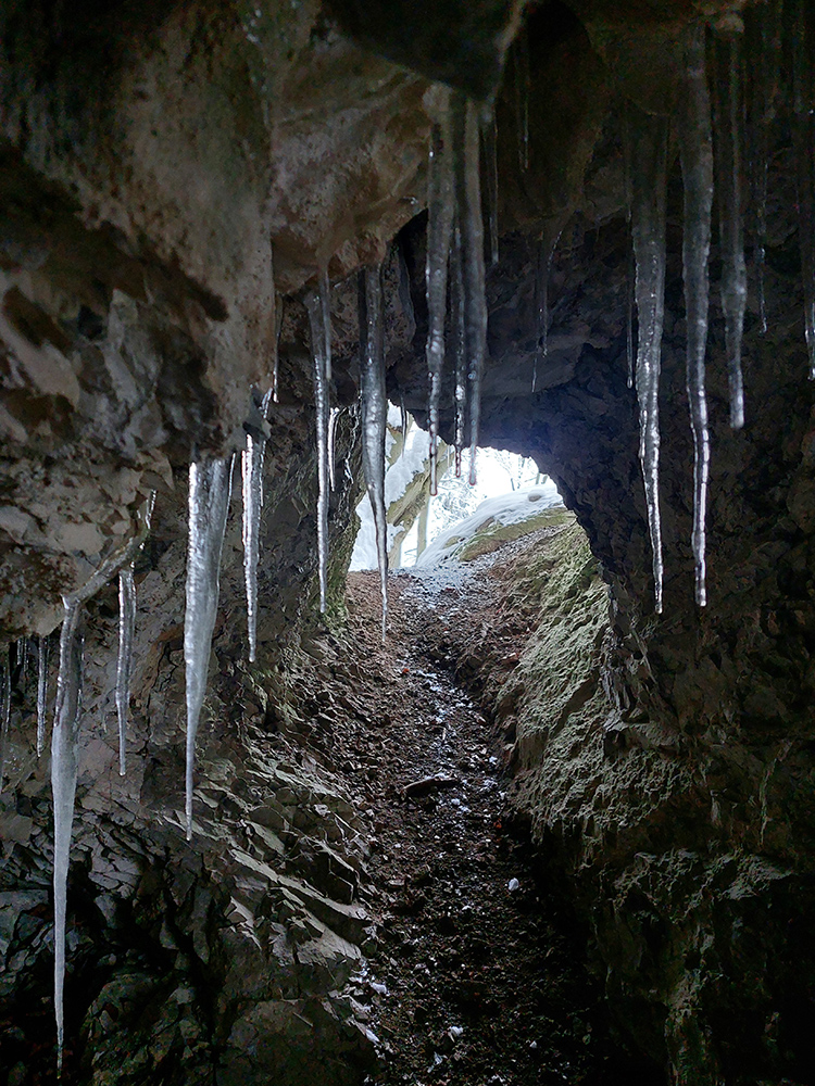 Takže cesta dole – už jedna báseň. Ale neodpustili sme si zachádzku k jaskyniam a previsom pod bralom. K najväčšiemu previsu s ľadovou výzdobou, ktorá isto mala grandiózne rozmery, sme sa cez klzké snehové nánosy radšej neštverali, ale susedné, menšie jaskynky a portáliky to sčasti vynahradili.