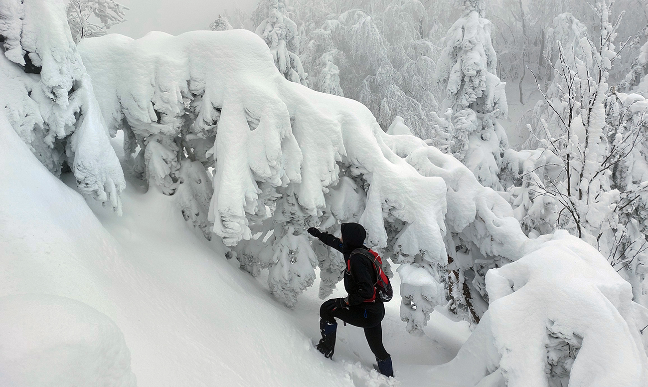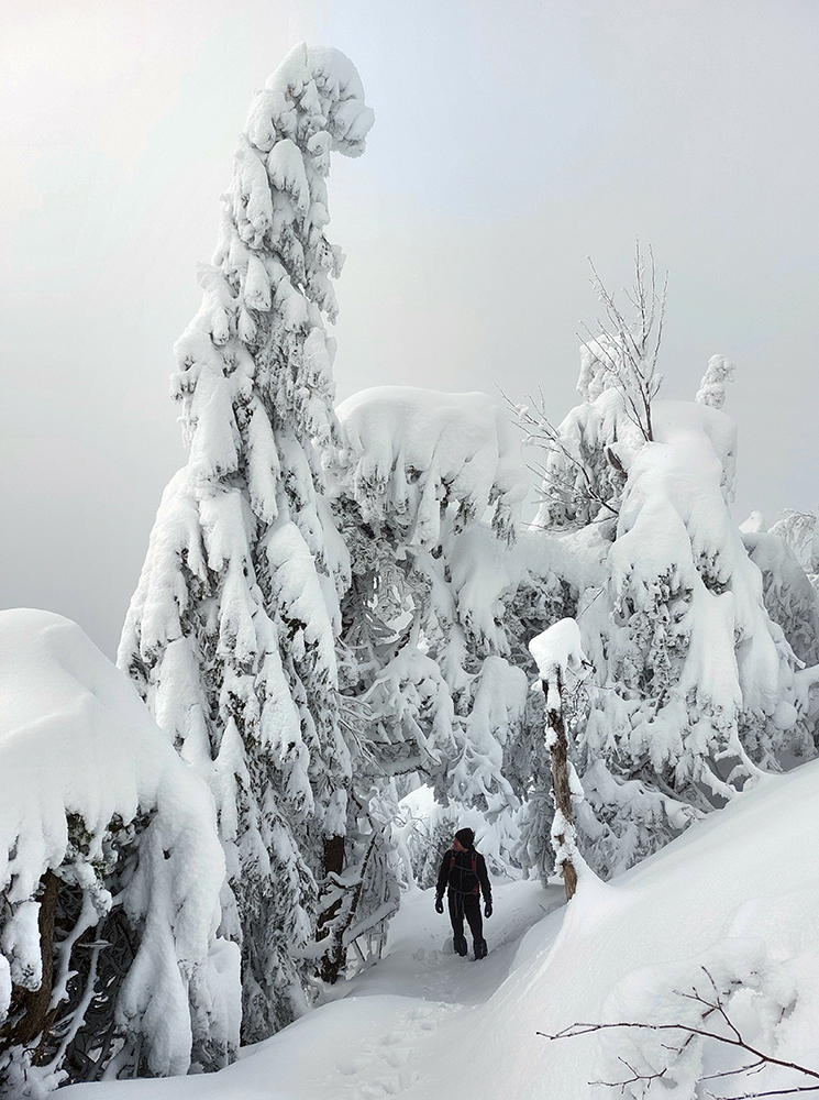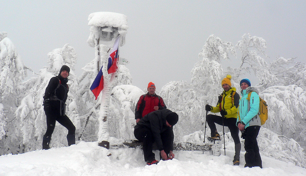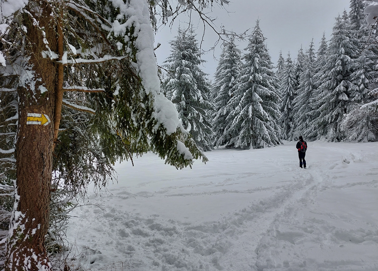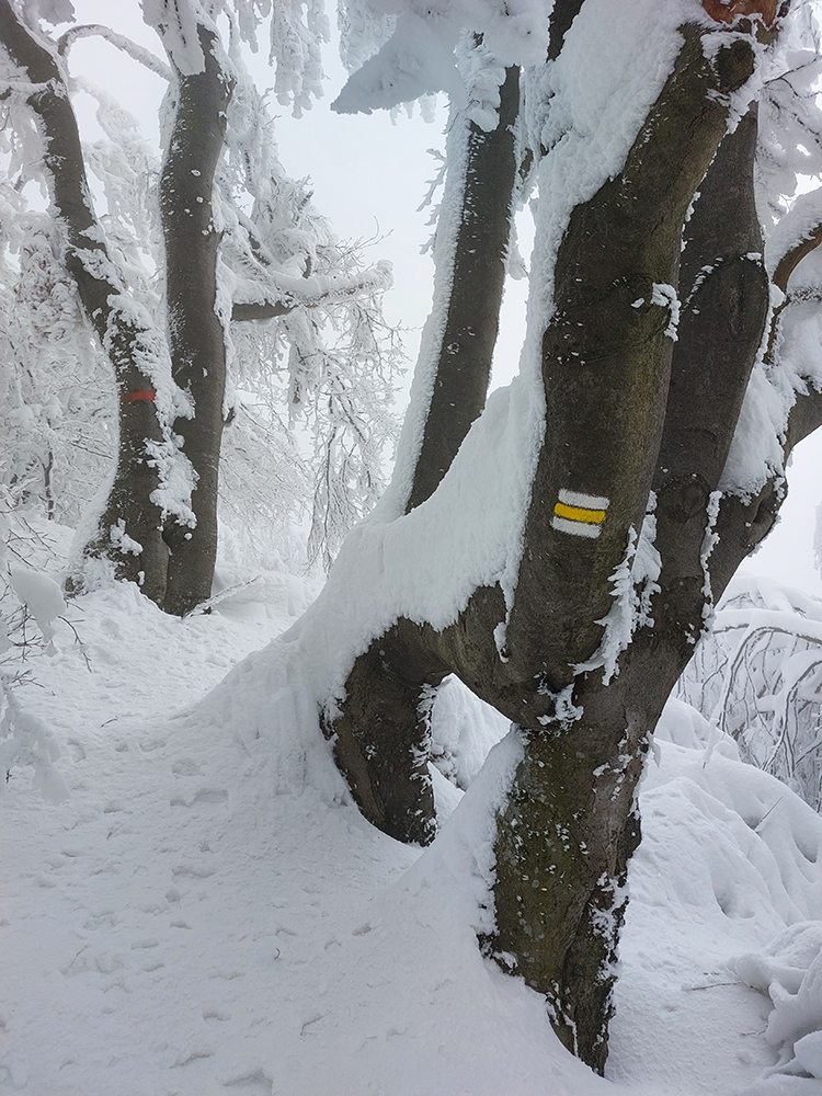 Aj hore pri kríži mlieko, tak sme si užili len „akustický“ výhľad do zvukov civilizácie, doliehajúcich ako vždy z doliny. A úplne odlišná bola (stále neprešliapaná) cesta po hrebeni na ten hlavný, vyšší, ale menej nápadný Šíp. Správny smer okrem neporušenej snehovej periny zatajovali aj konáre, sklonené pod snehovými závažiami často až k zemi. Tu hore už vietor olepil snehom všetko, tak ani značky moc vidieť nebolo. Ale múdre telefóny, intuícia a náznaky chodníka nás takmer presne previedli zase iným typom rozprávkovej, zimnej krajiny. Okrem iného bolo treba viac sa zohýbať :-)