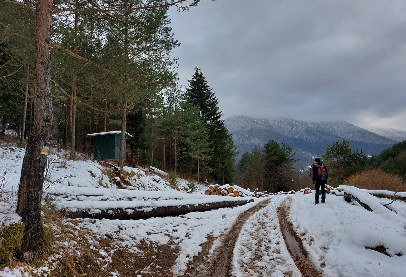 Potom už len pohodlný zošup dole lesom do Žaškovského sedla, po mäkkom snehu, miestami ako v bobovom tobogáne. Aj sme trochu kopli do vrtule, pre istotu, žeby nám vlak neušiel. V sedle na lúkach čisto bielo, len ojedinelé stopy na obe strany do dedín. A pod lesom relatívne nový prístrešok – vidno, že miestni turisti sa starajú.