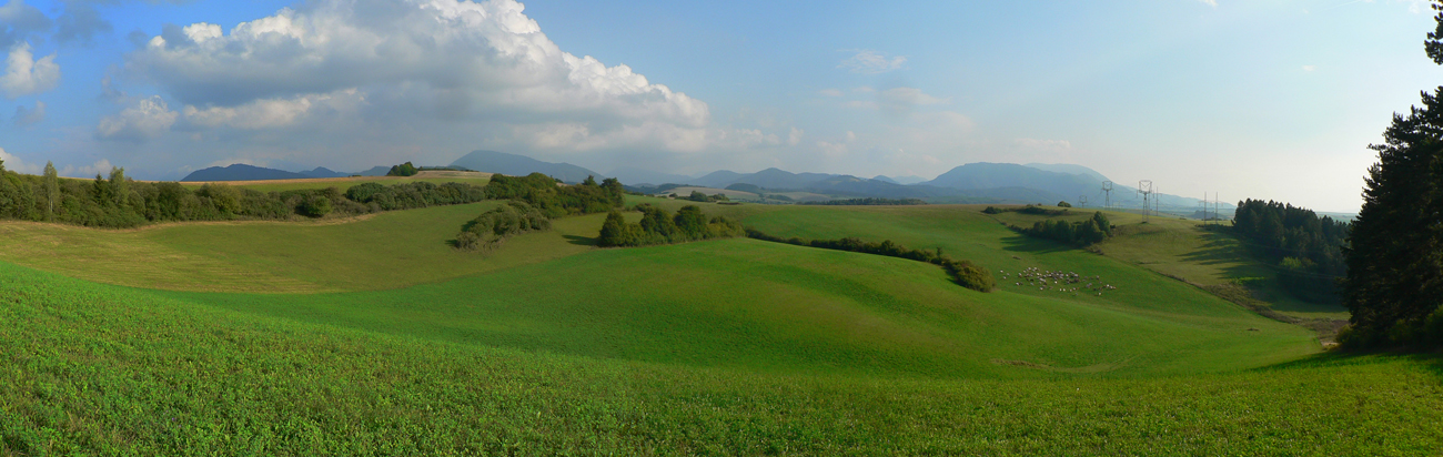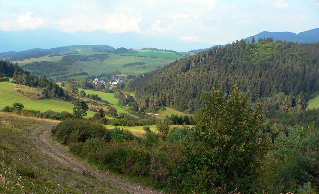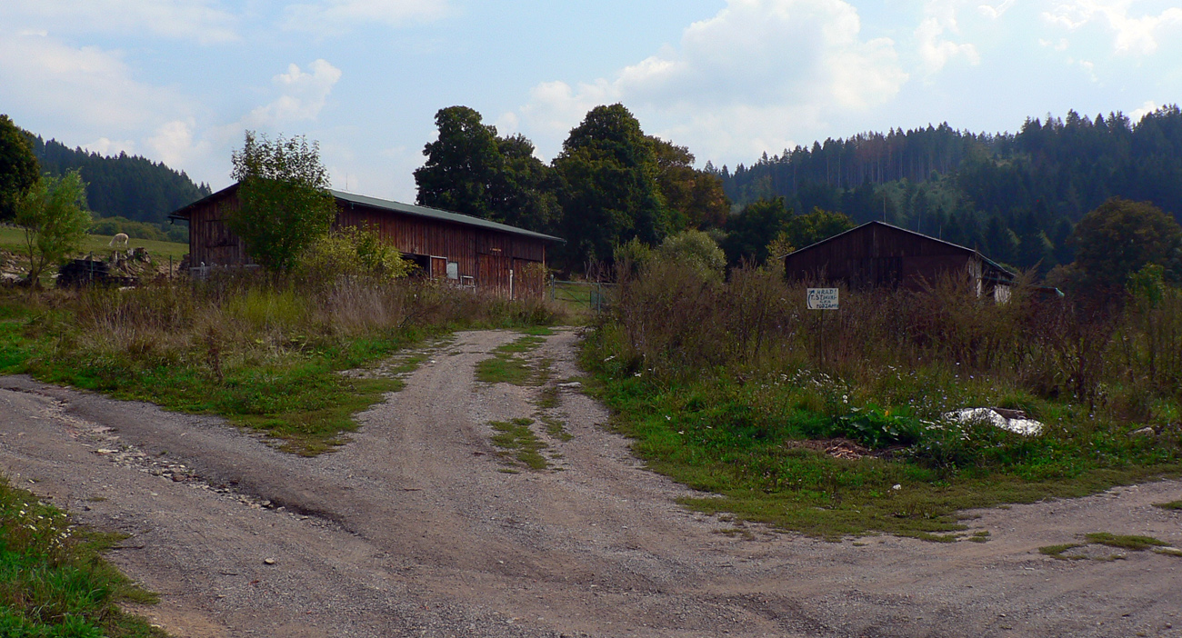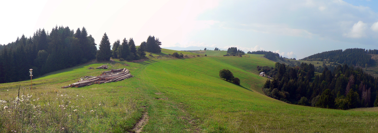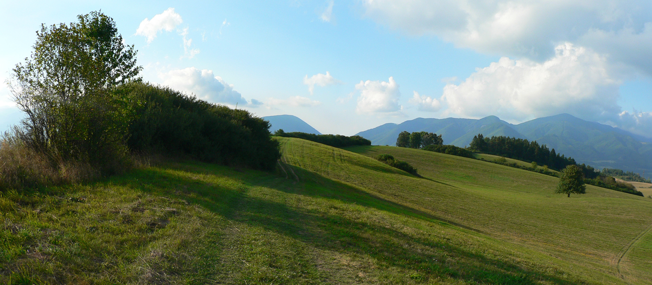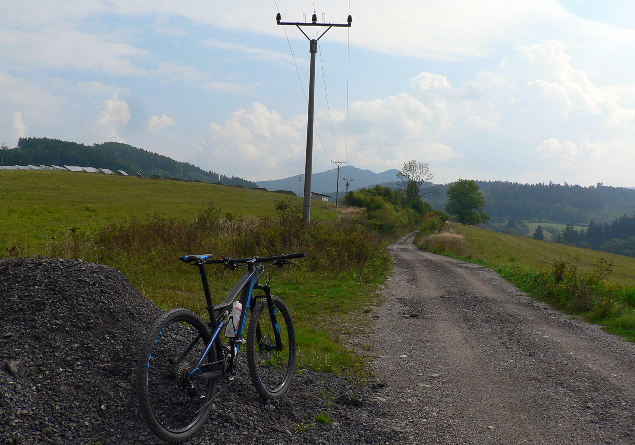 Tak záver už len po parádnych lúčnych cestách. Valím smer Sklabiňa, tu je viac možností, opísané sú v tom druhom článku. Zo Sklabine, z dolinky, zas do kopca pomedzi domy na ďalšie lúky, družstevníci tu majú dokonca asfaltky naťahané. Zjazdík popod elektrické stožiare, intuitívne križujem cestu kúsok za Starou Bôrovou presne na tom mieste, kde som chcel - aby som mohol dať posledný krátky výšľap na paralelný trávnatý hrebienok. Lebo nazad po ceste cez mláky, vysypané tými škridlami, sa mi už druhý raz nechce.