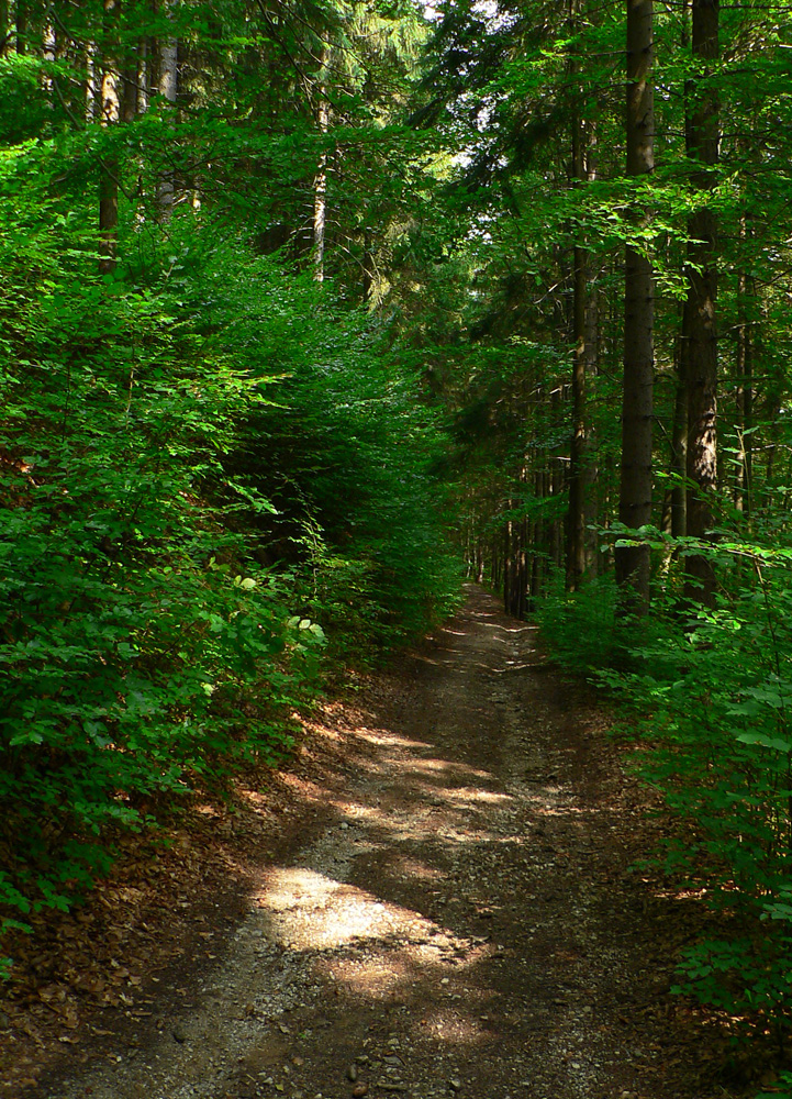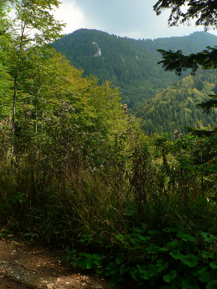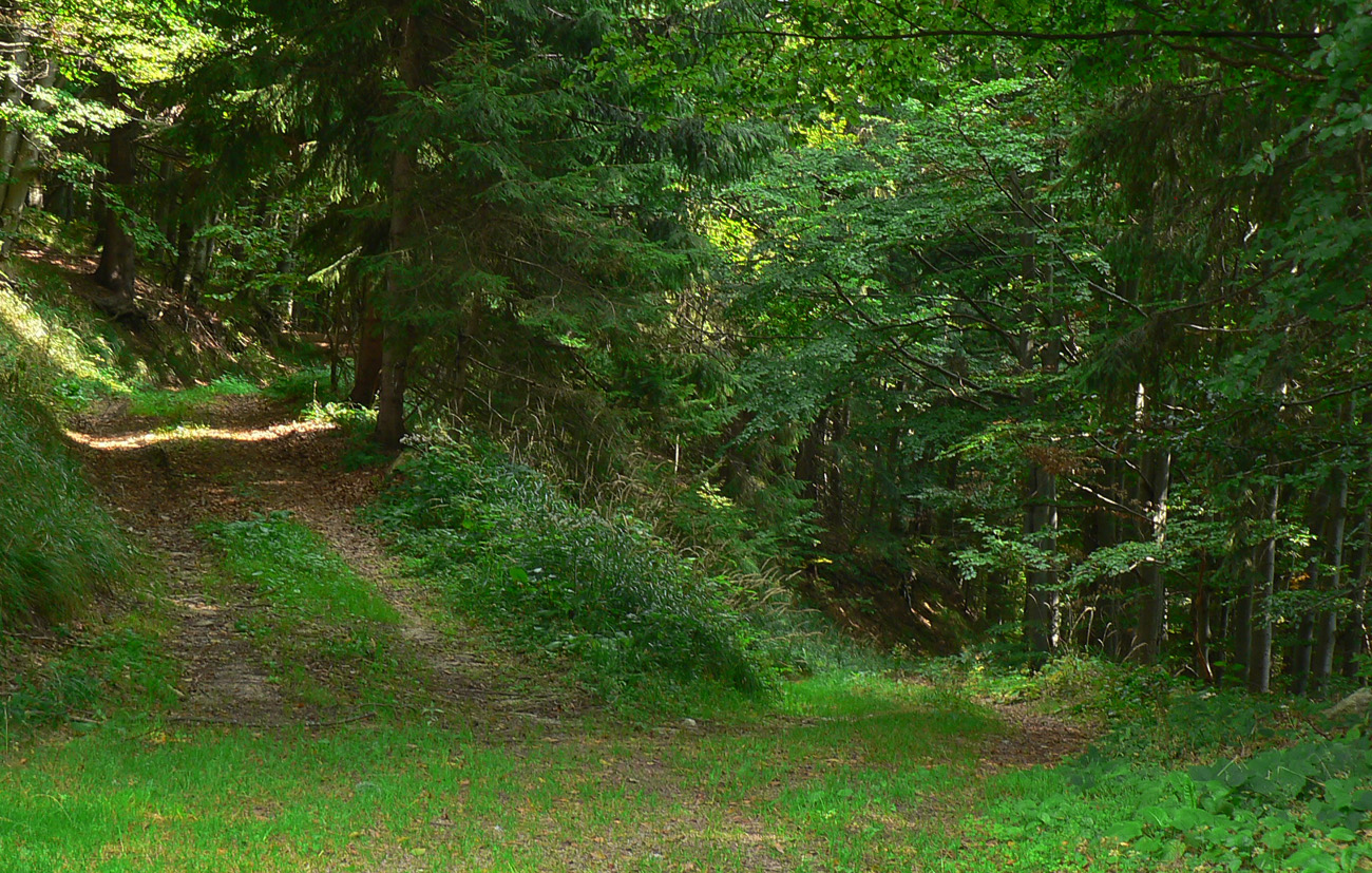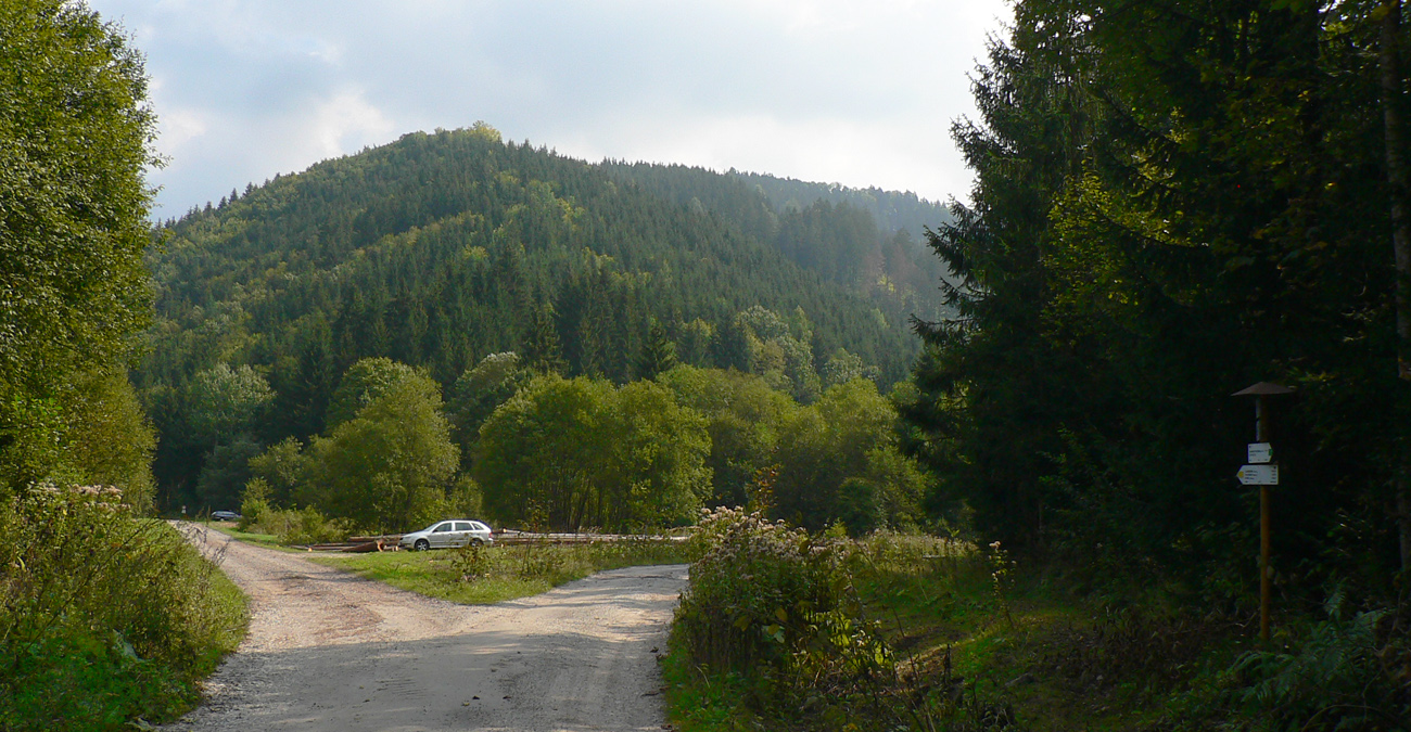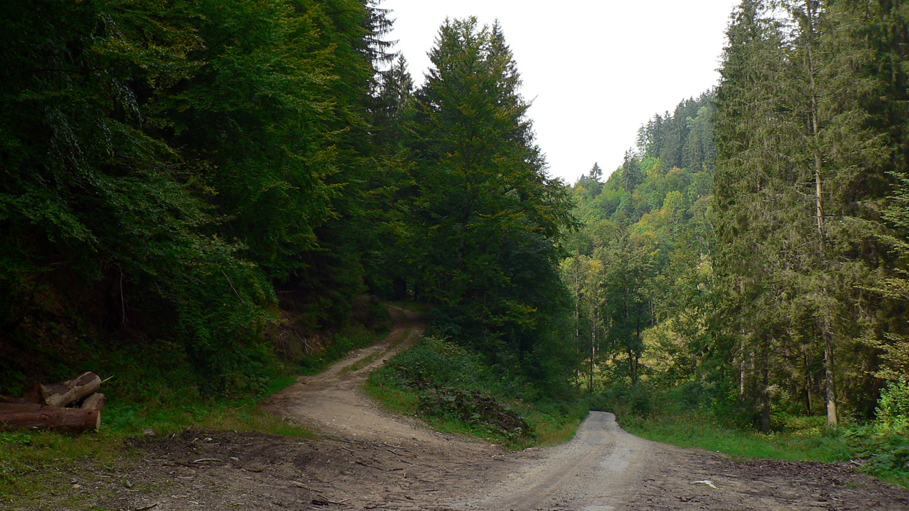 Keď sa žltá odpojí od zvážnice, je to už len asi kilák strmšieho stúpania. Potom hore – dole popod hrebeň. Pod Vyšnou Lipovou malé sedielko, lesácka chatka a odtiaľ už len dolu. Povrch cesty parádny, aj keď aj tu sa v okolí ťaží. Len trochu blata na drevosklade v závere v južnej vetvy Kantorskej doliny (tu sa napájam na zelenú značku) a o chvíľu už som pri pomníku SNP.