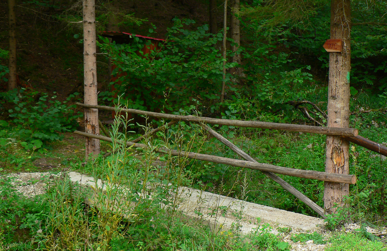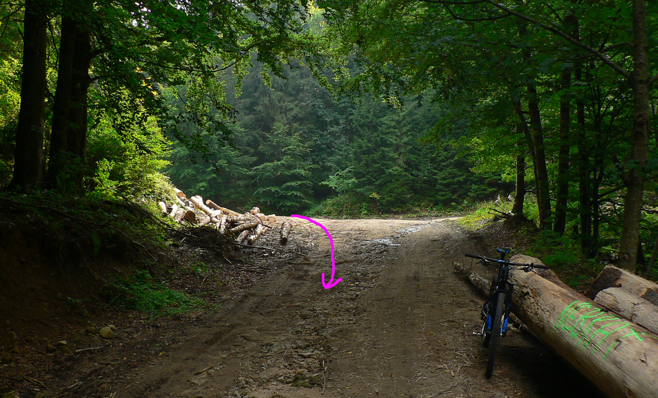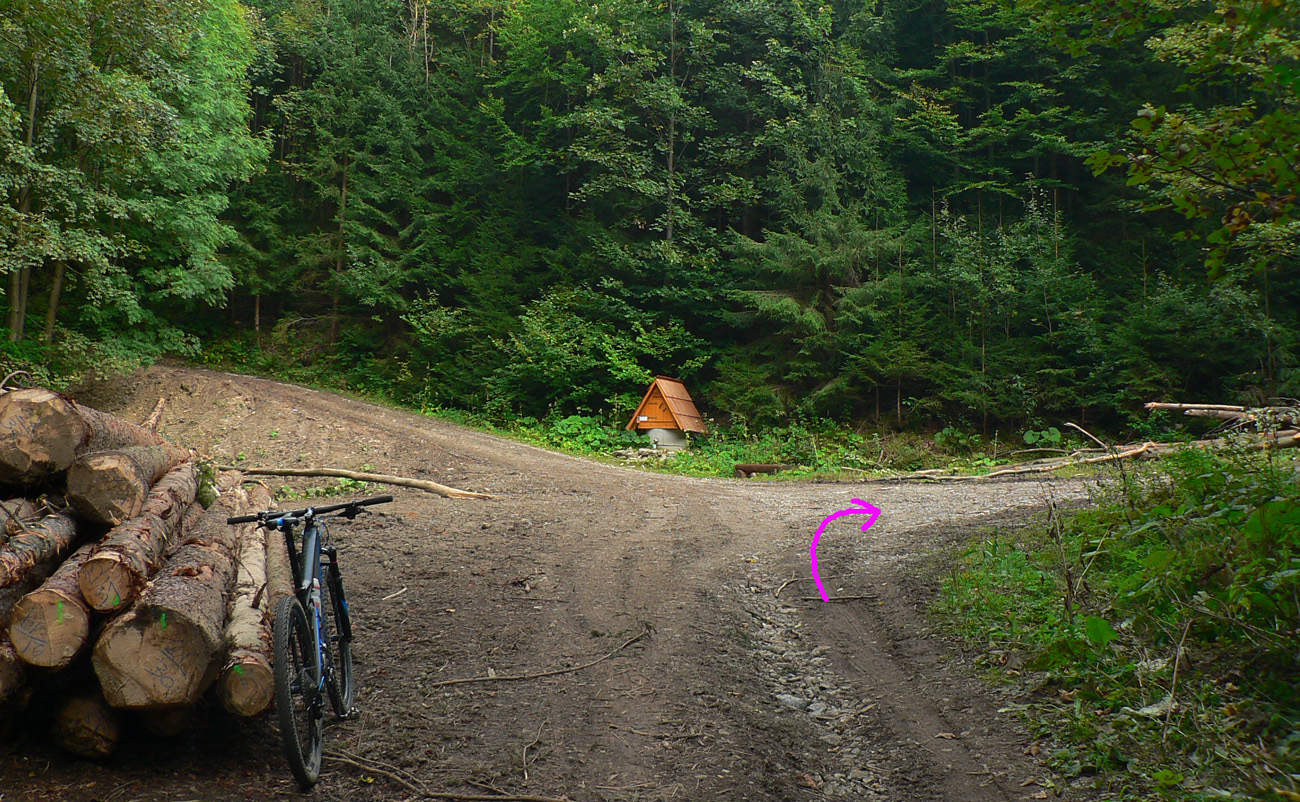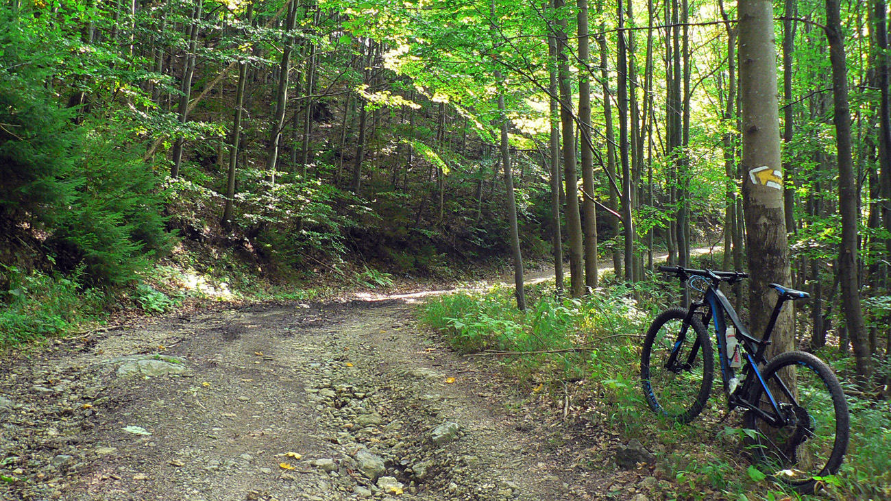 Zosvištím dolinou a moja by mala byť prvá výrazná odbočka doľava, popod Lučenec. Mala by ma doviesť na žltú značku a po nej dole do Sklabinskej doliny (ku smerovníku Medzi mníchmi). Tak aj je, odbočka sa nedá minúť. Len tu už je o dosť viac blata, raz aj prenášať musím. Potom žltá - chvíľu na parádu, ale akonáhle sa skloní do strminy, je to katastrofa, tankodrom a mordor. Zjazdné len v tomto smere, aj to len tak – tak. Dole studnička a zatáčam doľava, hore Sklabinskou dolinou, po modrej. Malo by to už byť v pohode.