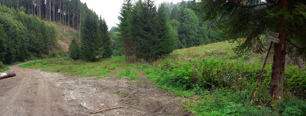 Pekná lesná cesta ma vypľúva pri potoku na hornom okraji parku v Turčianskej Štiavničke. Park už je pár rokov oplotený a nepriechodný, ale aj tak idem opačným smerom. Asfaltujem do Sklabinského Podzámku a ďalej Kantorskou dolinou – jej severnejšou vetvou, po žltej pod Kľak. Sklon rastie, asfaltu ubúda, rúbanísk pribúda. Sklon sa zmierni, keď cesta prudko zatočí z doliny do traverzu. Cez rúbane sa otvárajú výhľady na vyholené stráne pod Prieložnicou:
