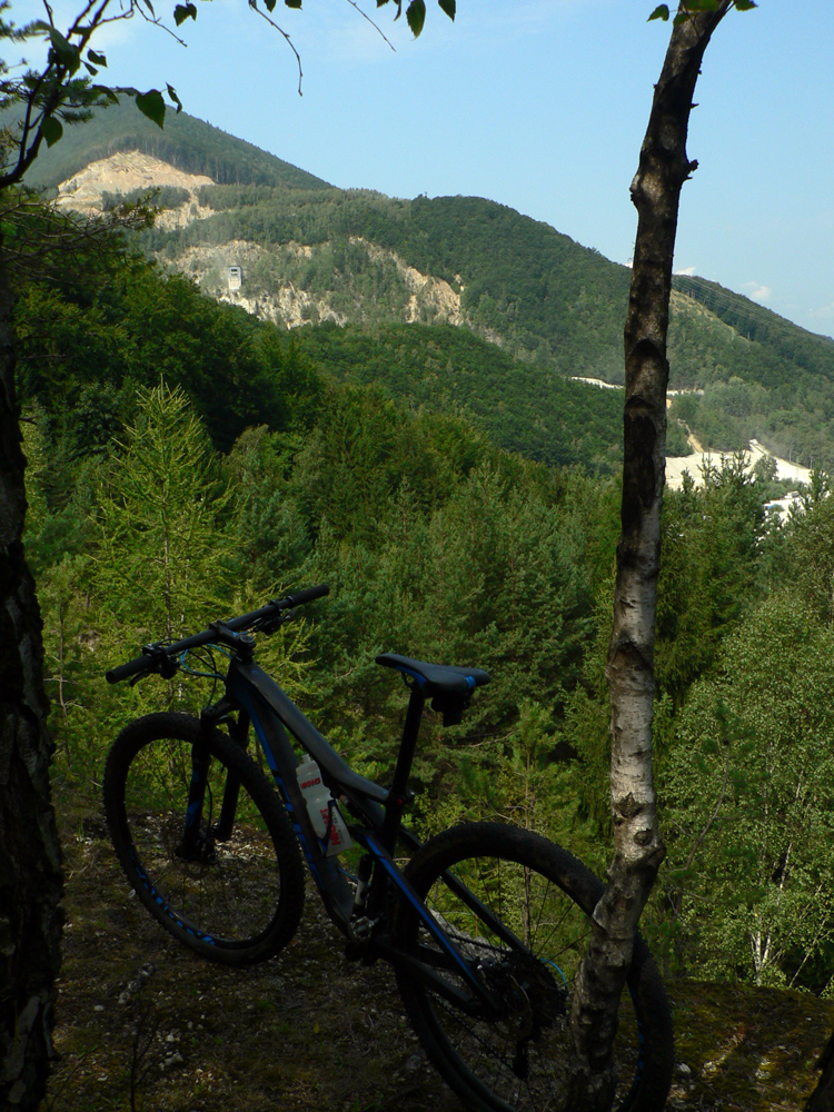 V lese sa cesta síce rýchlo mení na chodník a pre kolesá nezdatného technika je tu trochu viac bordelu a sklonu ako by bolo pohodlné, ale dá sa dostať až na borovicami zarastenú plošinku bývalého lomu. Stade viac počuť ako vidieť ruch na diaľničnej križovatke pred budúcim východným portálom tunela. Zato kameňolom Dubná skala čnie majestátne. Miesto je to pekné, len ten hluk...
