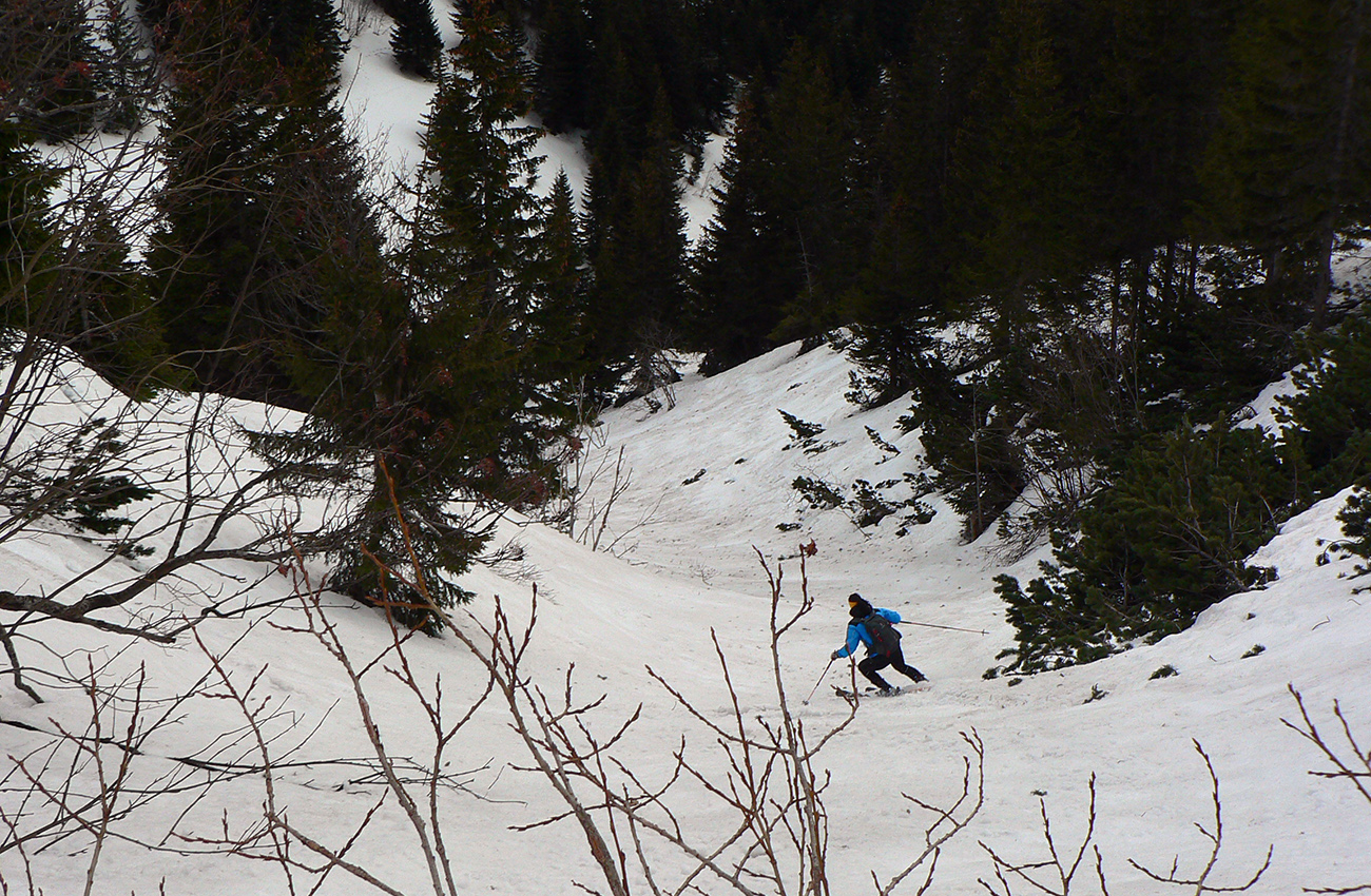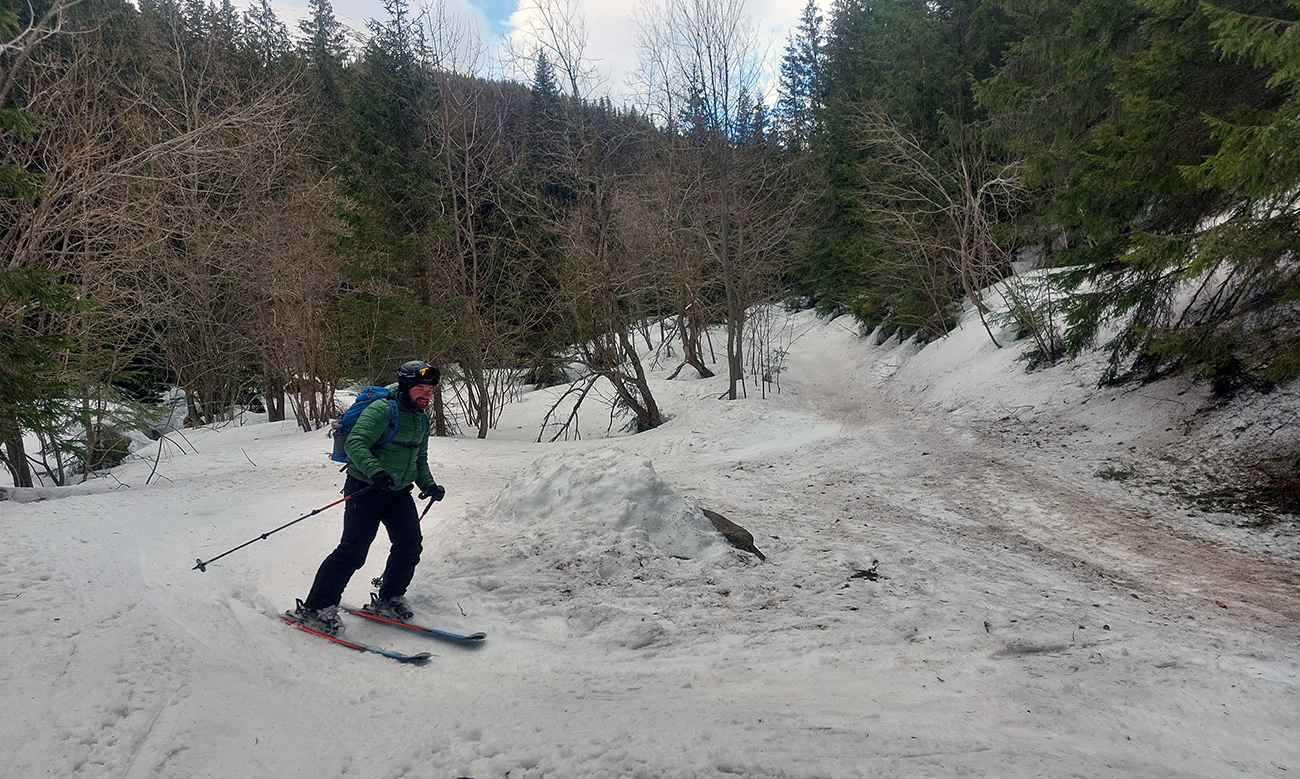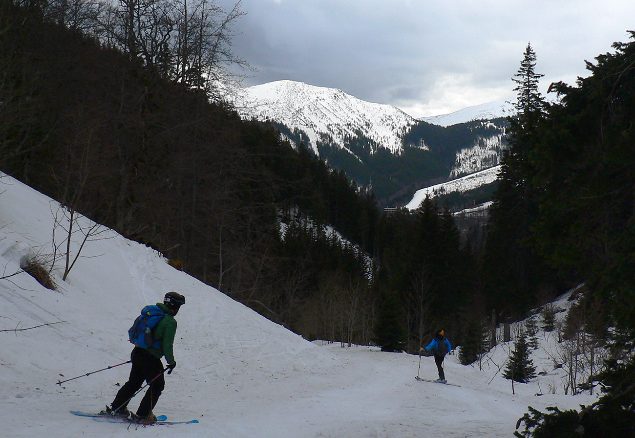 A bol čas to teda dotiahnuť na ten Ďumbier, keď už sme tam pod ním stáli. Odhlasovali sme si to 3:1, slabší kus kvôli bolesti v kolene to radšej neriskoval. A dobre spravil, lebo posledná lyžba, do Halašovej jamy, to bola zvrchu hnusná vytriasačka na drssssnom betónovom firne. Nižšie sa k drsnosti pridali zamrznuté ryhy a hrče a až dole v lese to už bolo jarne mäkké a hravé, lebo aj vyšmýkané.