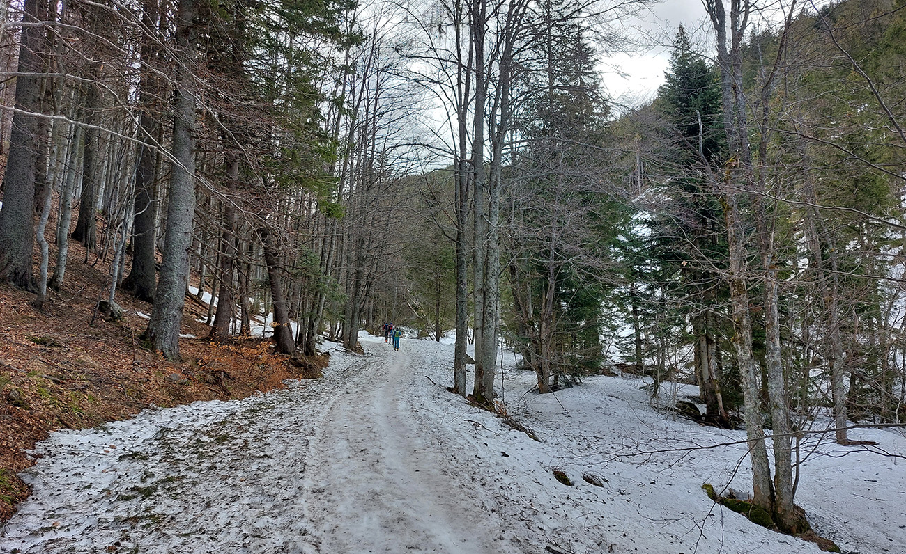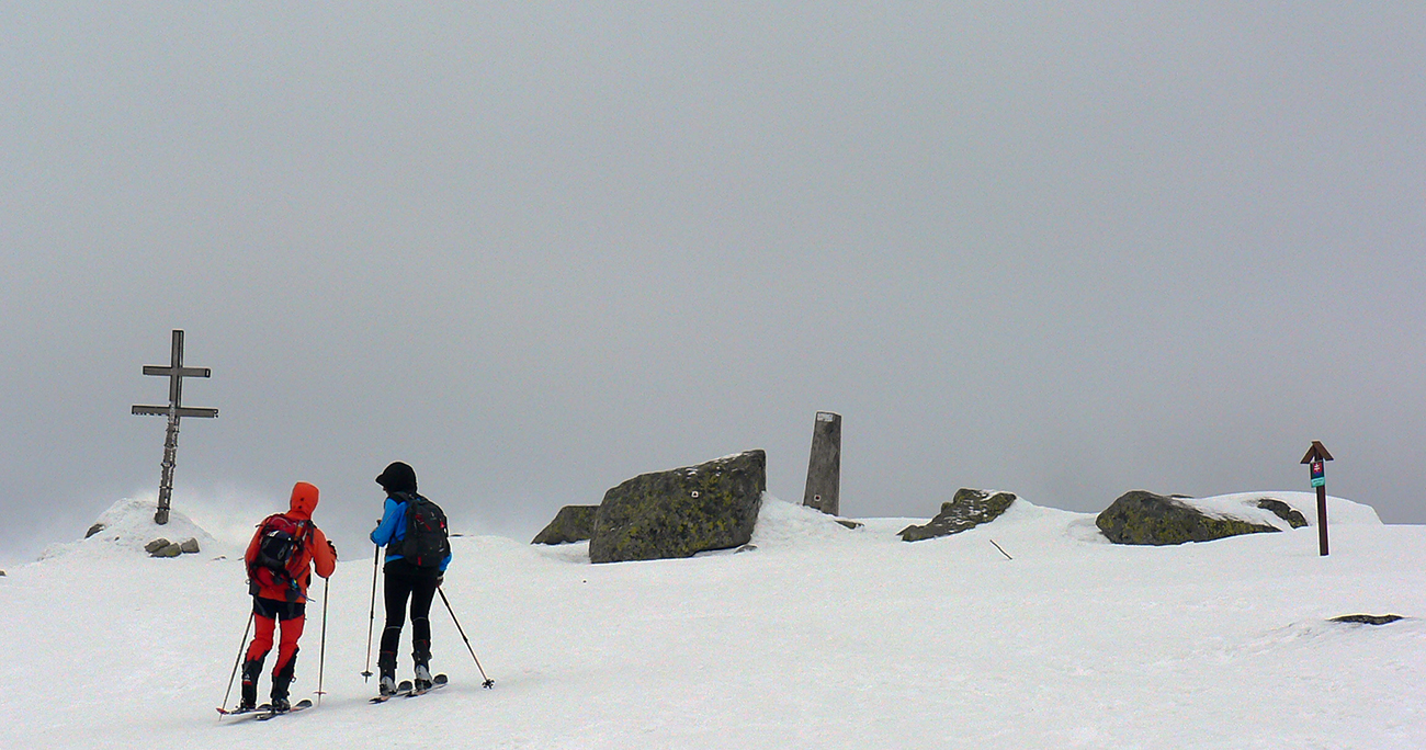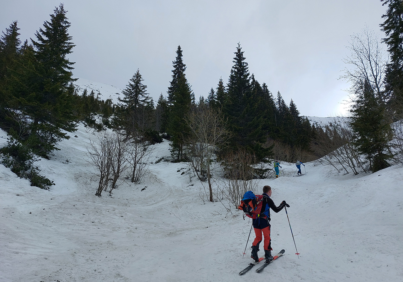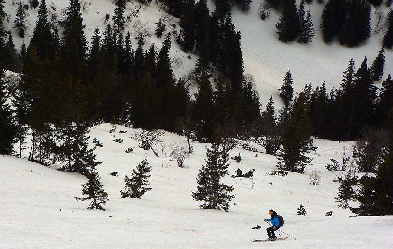 A bol čas to teda dotiahnuť na ten Ďumbier, keď už sme tam pod ním stáli. Odhlasovali sme si to 3:1, slabší kus kvôli bolesti v kolene to radšej neriskoval. A dobre spravil, lebo posledná lyžba, do Halašovej jamy, to bola zvrchu hnusná vytriasačka na drssssnom betónovom firne. Nižšie sa k drsnosti pridali zamrznuté ryhy a hrče a až dole v lese to už bolo jarne mäkké a hravé, lebo aj vyšmýkané.