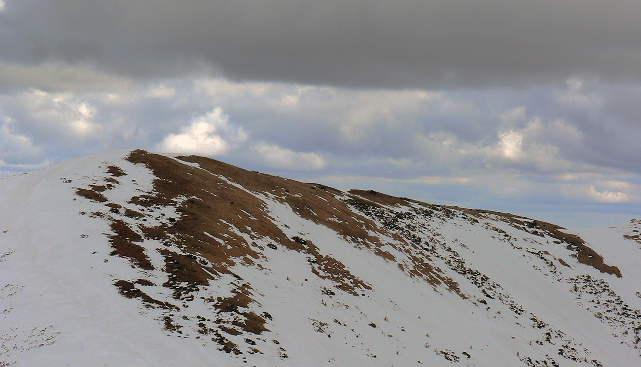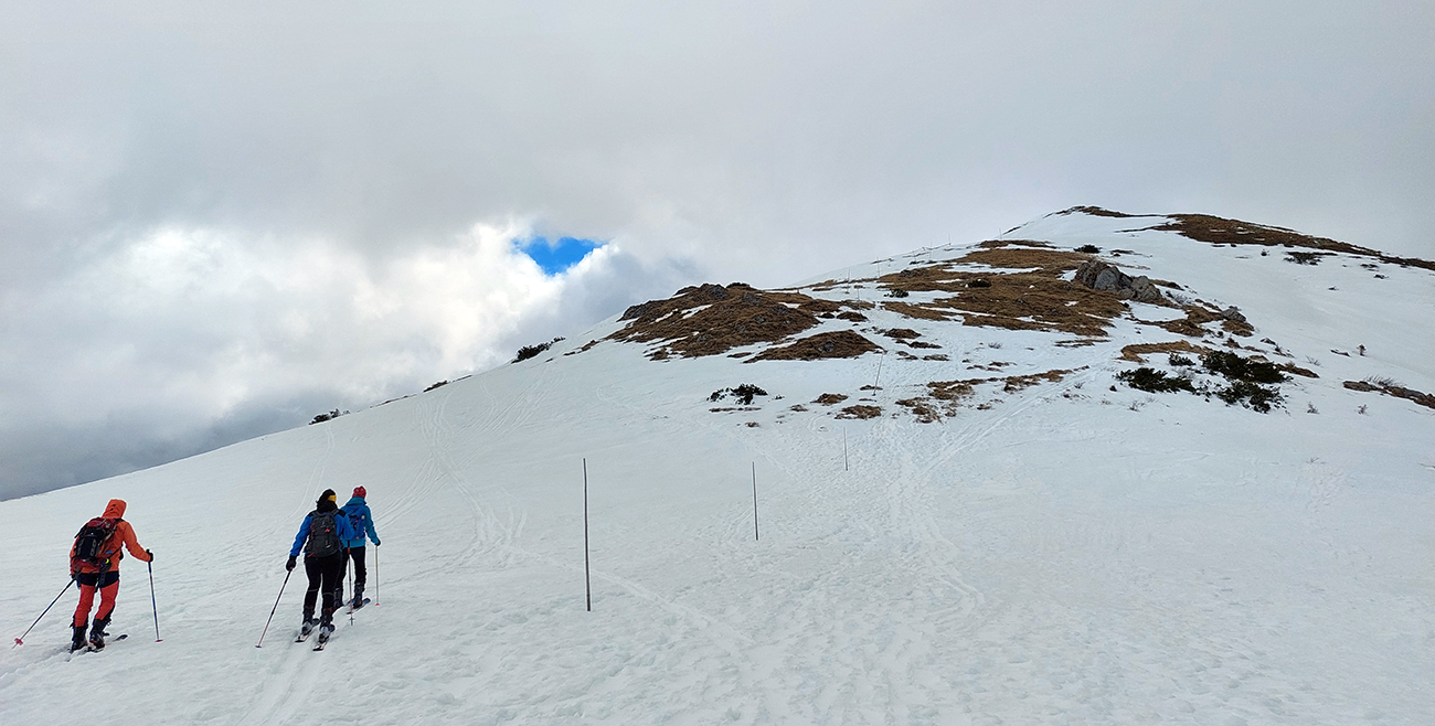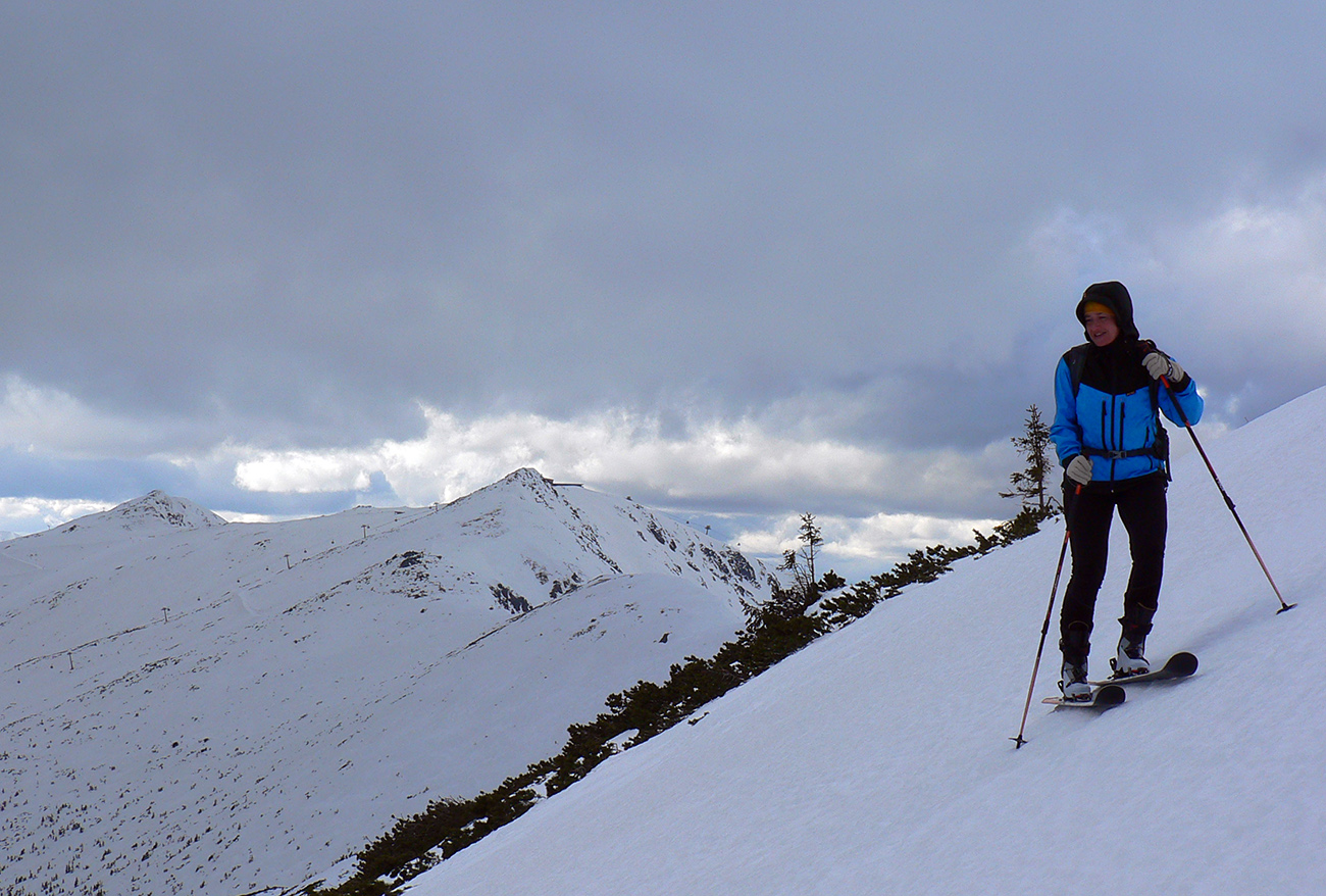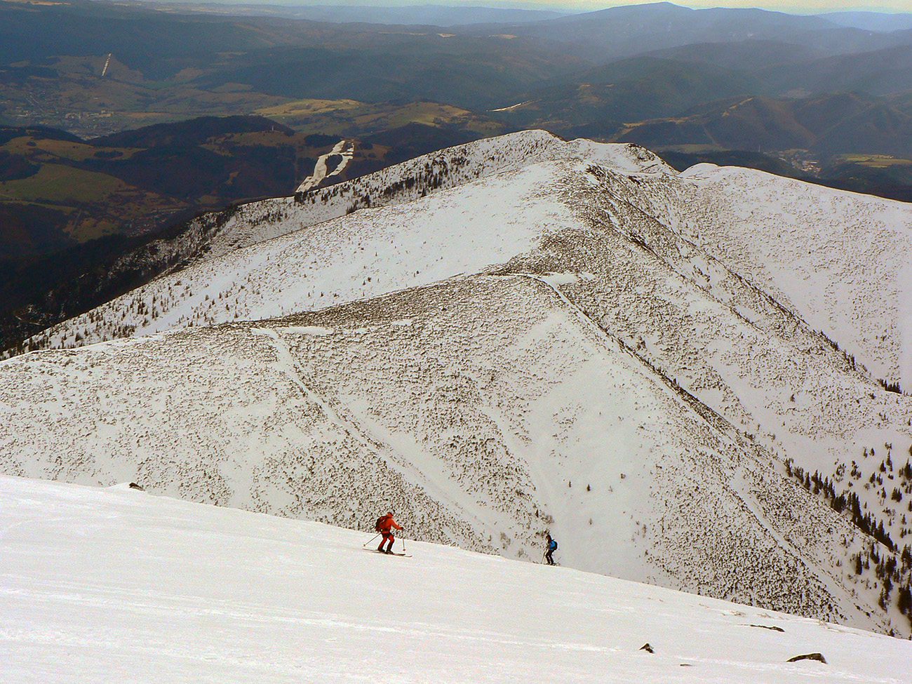 Kolo obeda sme sa potom kadejako stuhnutí vyhrabali cez Králičku pod Besnú, pekne po hrebeni, aj nejaké fľaky bez snehu sme poobchádzali, aj do južných zjazdoviek zhora nahliadli (keď slnko vyšlo na chvíľu spoza mraku, aj sa zdali byť prívetivo natopené), aj sme odtrh až na základ pod Štiavnicou obzreli, cestou nazad.