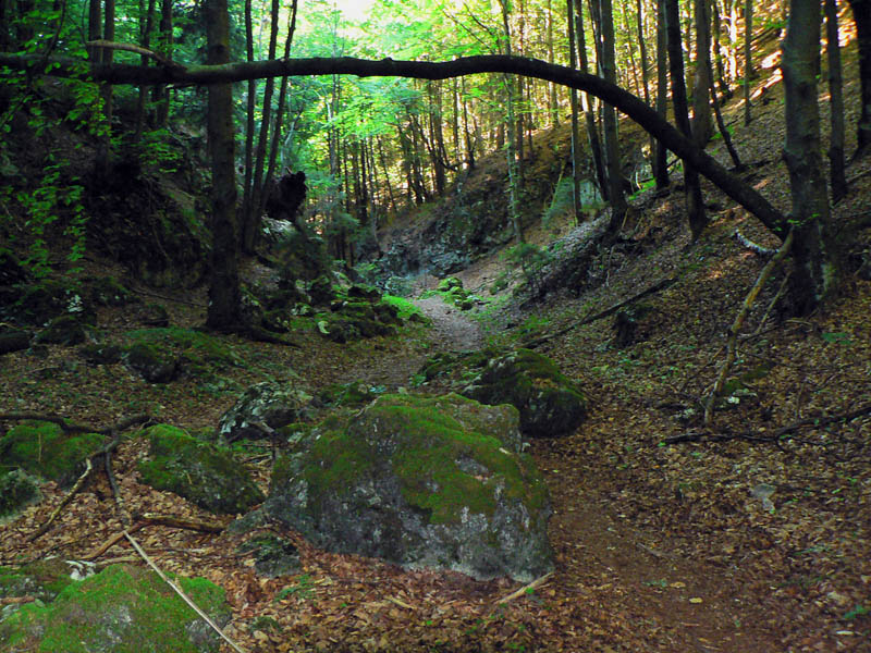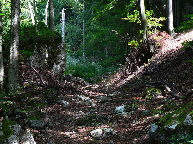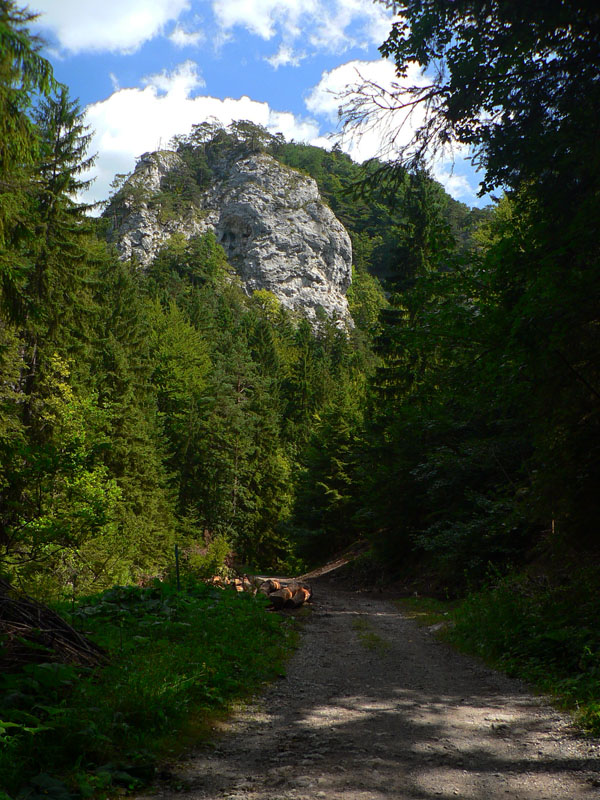 Hodinu od ústia žltá odbočka do doliny Juriašovo znamená koniec prechádzkovej srandy. Na Ostrú je blízko, ale ako hore strechou! A ešte južným svahom, v lete dokonalá rozkoš :-) Ešte že v tieni lesa. Po pár sto metroch posledná možnosť dotankovať – z bočnej dolinky vyteká čosi, ale len taký cícerok. Inak je Juriašova suchá, chodník riadne prašný, rozchodený na kašu, len zopár odpočinkových serpentínok na obídenie skalných prahov. Najkrajší je keď opadnú listy, to vidieť žiarivo biele steny naokolo.