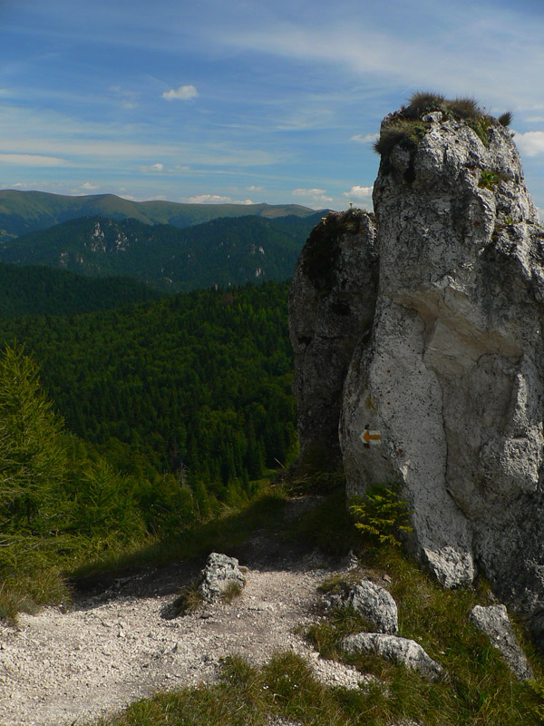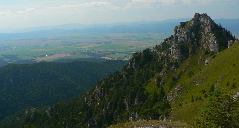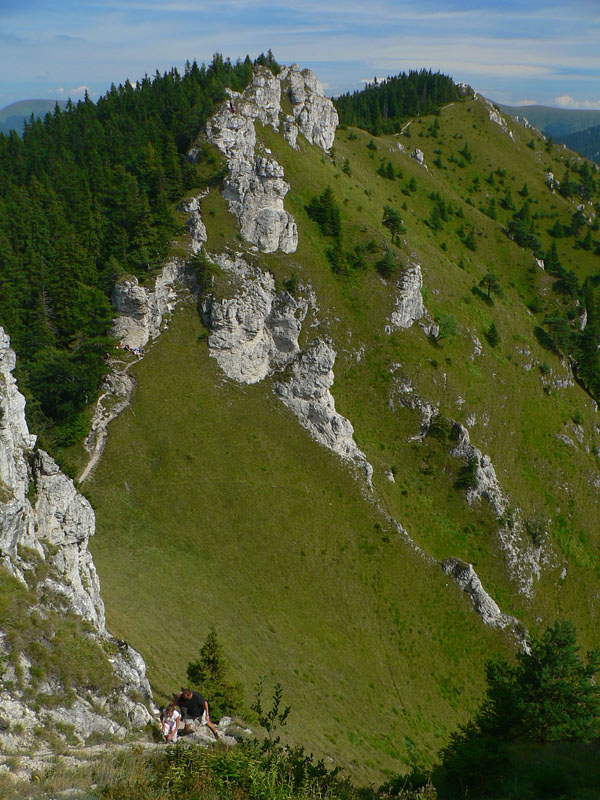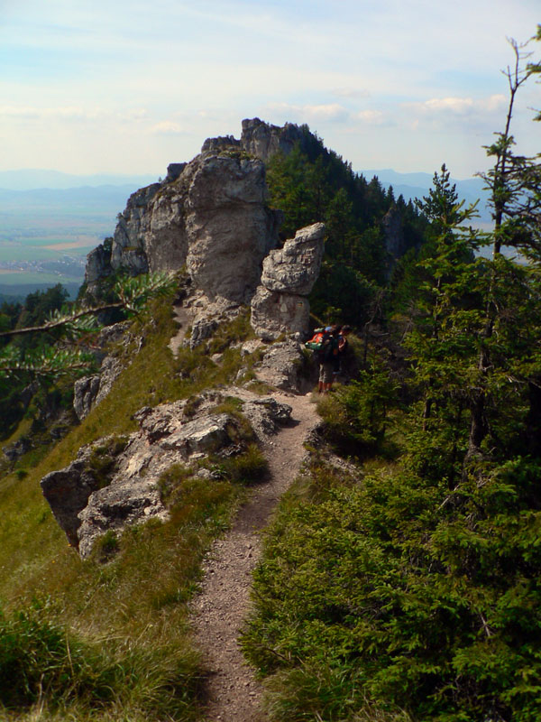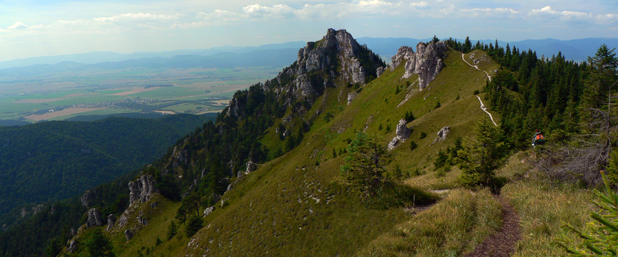 Pod sedlom Misa sklon už menší, chodník lezie z lesa a nad sedlom sa otvárajú výhľady – najmä dozadu na hlavný hrebeň. Zadná Ostrá už je na skok, kľučkovaním pomedzi bralká a stromy. A z nej hrebeň, ostrý ako britva, na tú hlavnú Ostrú (1247m). Na záver výstupu spestrenie – schody ako do neba, pár metrov reťazí a prielez skalným oknom. A zhora rozhľad: rovných 360! Len ľudí je tu vždy ako hadov.