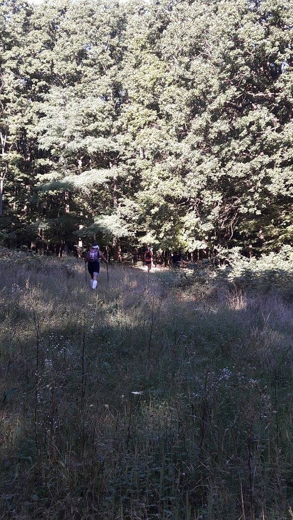 Vyškriabeme sa na Karanč, chvíľku pauza a odtiaľ taký padák na suchej hline, ktorá pod topánkami rovno mizne. Sem-tam voľné kamene ako bonus. Cesta je nekonečná, bez výhľadov, trocha sa vyrovnáva, ale je to riadna psychiatria. Človek by povedal, že na tom mieste už bol. Monotónosť lesa a hraničných kameňov striedajú iba tabule náučeného chodníka s mapkou, kde sa človek nachádza. Pohľad na ňu po ubehnutej vzdialenosti je depresívny. Veď my sa takmer nehýbeme! Vody je menej a menej, človek by chcel piť, ale môže si dať iba dúšok a pokračovať. Po dlhšej dobe sa les preruší lúčkou a znova nasleduje depresívny pohľad, kedy si uvedomujeme, ako sa hranica krúti, keď po ubehnutej vzdialenosti a výškových metroch, stojíme znova takmer vedľa Karanča.
