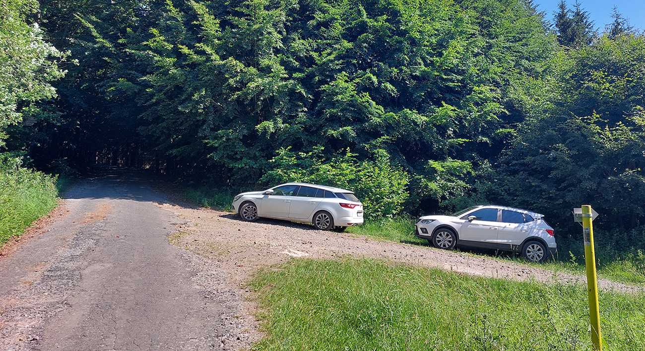 Takže radšej pekne pohodlne v tieni lesa, aj keď po poriadne vymrvenom asfalte. Aspoň ten prepadnutý úsek je už opravený. Za prvou prudšou zákrutou (doprava), pod mínometom, sa dá tiež okolo cesty parkovať. Len pozor, pľac nad cestou slúži aj ako drevosklad.