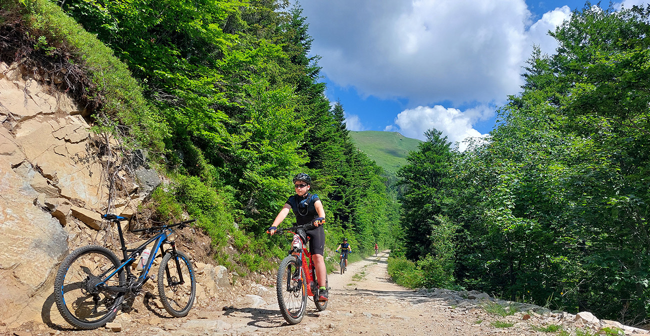 Míňame prívetivo sa tváriacu odbočku doľava – je to tá akože skratka, ktorou sa dá dostať k zelenej značke na drevosklade, ale neodporúčam ani z tohto smeru. Je na nej dosť hnusných, zle jazditeľných úsekov – strmo stúpajú a sú plné voľných šutrov a šišiek, zadné kolo na nich nepríjemne odskakuje. Len jej úvod sa tvári takto nevinne: