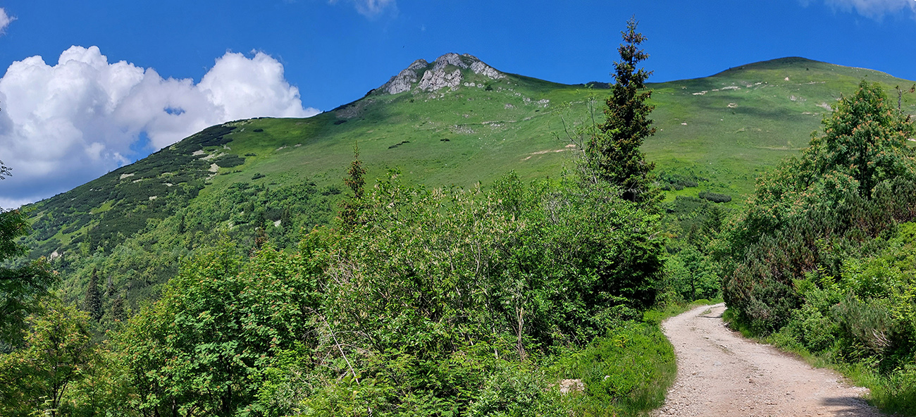 Cesta na nasledujúcom úseku výrazne opeknieva, lemujú ju početné skalky a stienky. Za prvou prudšou serpentínou (doľava) sa na chvíľu ukáže vpredu (no stále vysokoooo) nezameniteľný, bralnatý Chleb.