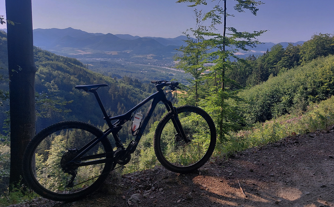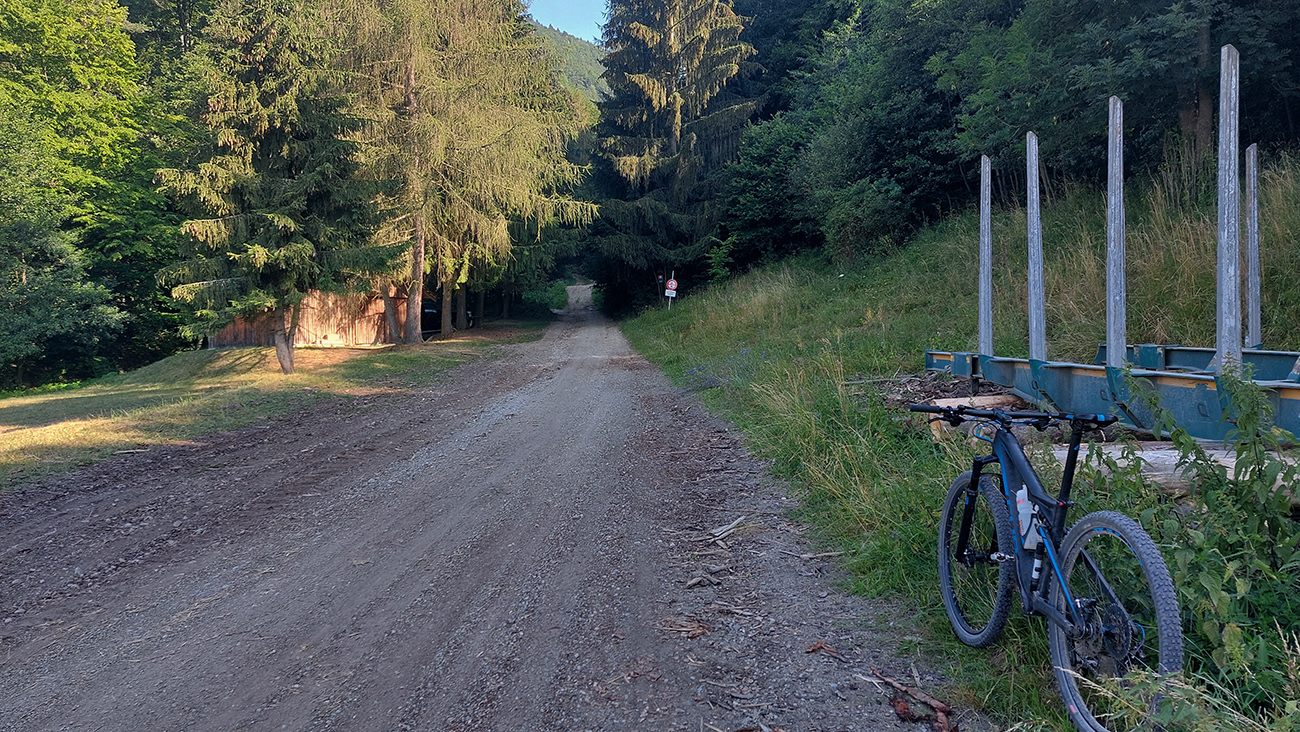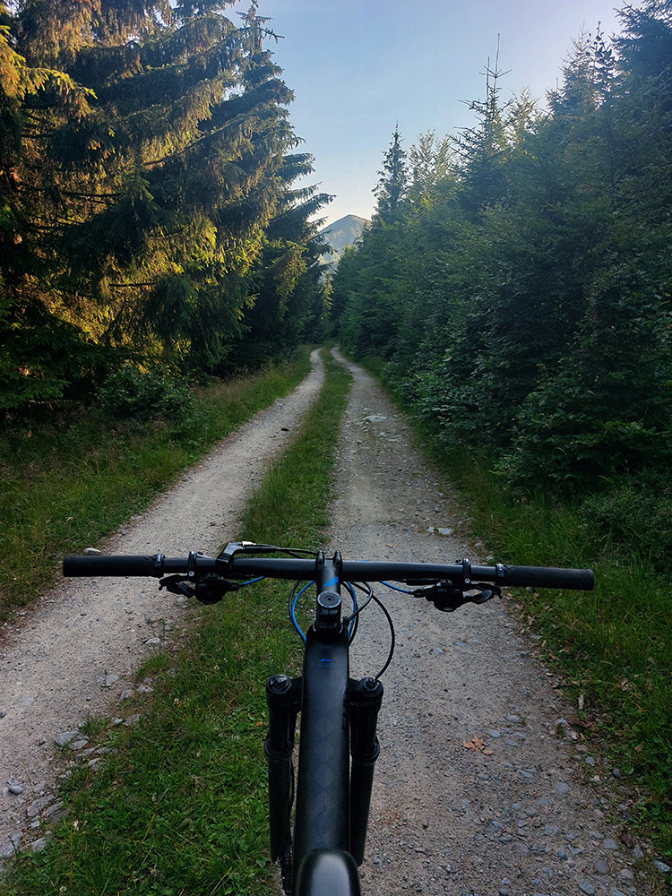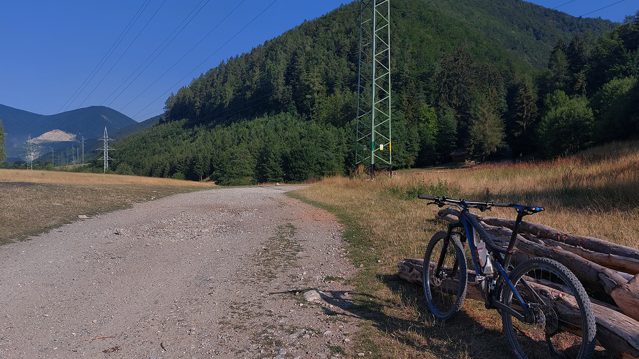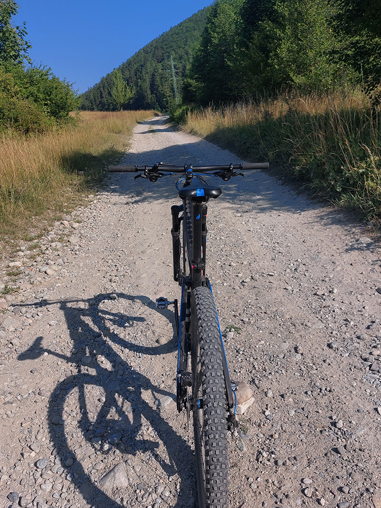 Výjazd na bajku „na Maguru“ je z tých troch najkratší a asi aj najpríjemnejší – podľa Stravy 11,5 km a 730 výškových, ale najmä príjemné škvrčanie relatívne rovnej šotoliny pod kolesami po celý čas. Cesta väčšinou suchá, aj nedlho po daždi, to sa skôr prášiť bude (ako na jednej fotke výborne vidno). Takmer celý čas vedie v príjemnom tieni, aj keď cez početné rúbaniská sú tu otvory na juh, do kotliny. Sklon ľudský, len „cieľová rovinka“ nad sedlom Príslop je na niekoľkých miestach strmšia a aj v kombinácii s väčšími kameňmi pod kolesami môže slabšieho technika trochu vyškoliť. No a posledné metre na terasu pred chatou sú najstrmšie a najhrboľatejšie z celej trasy, ale tam sa vždy veľa ľudí prizerá, tam sa už jednoducho treba hecnúť a nedať sa zahanbiť :-)