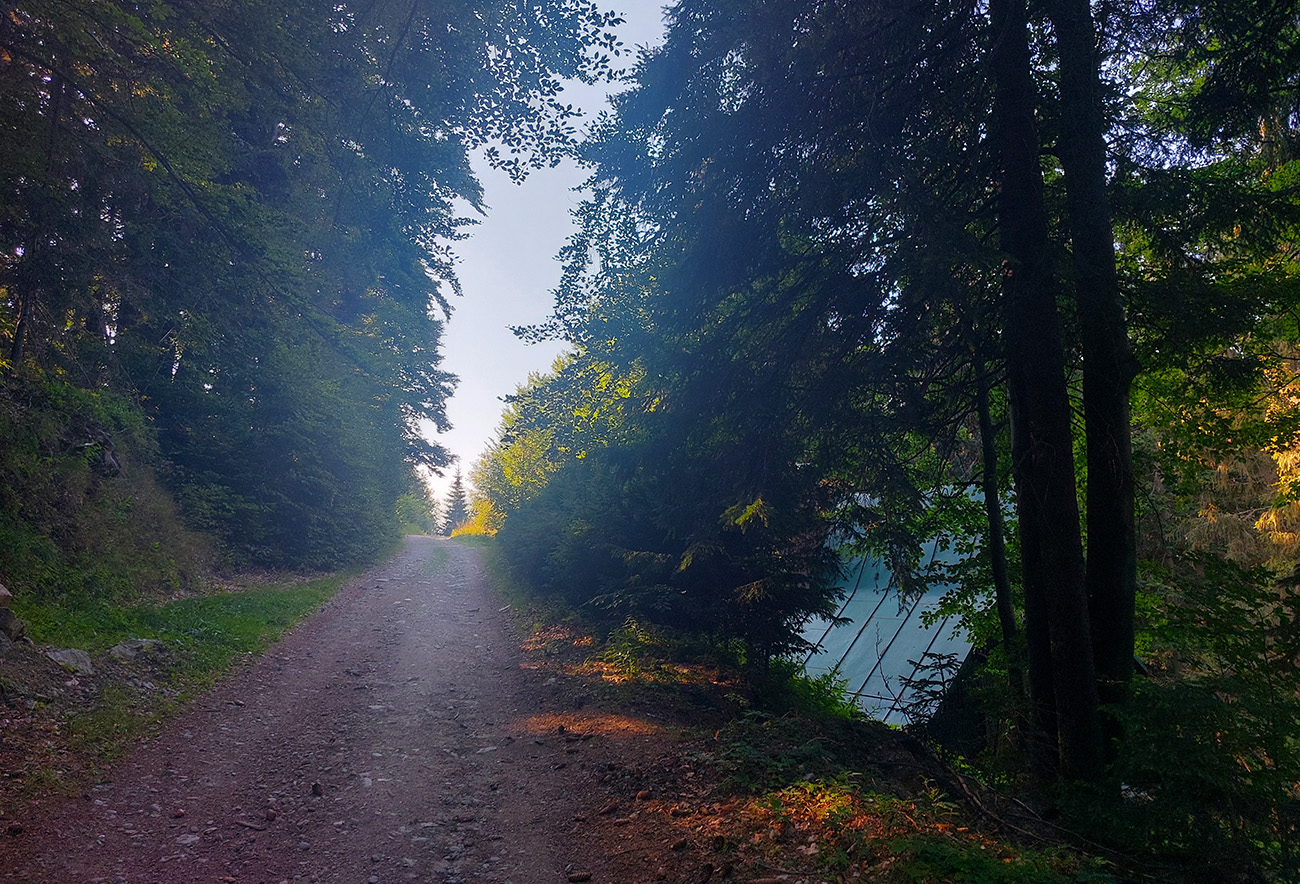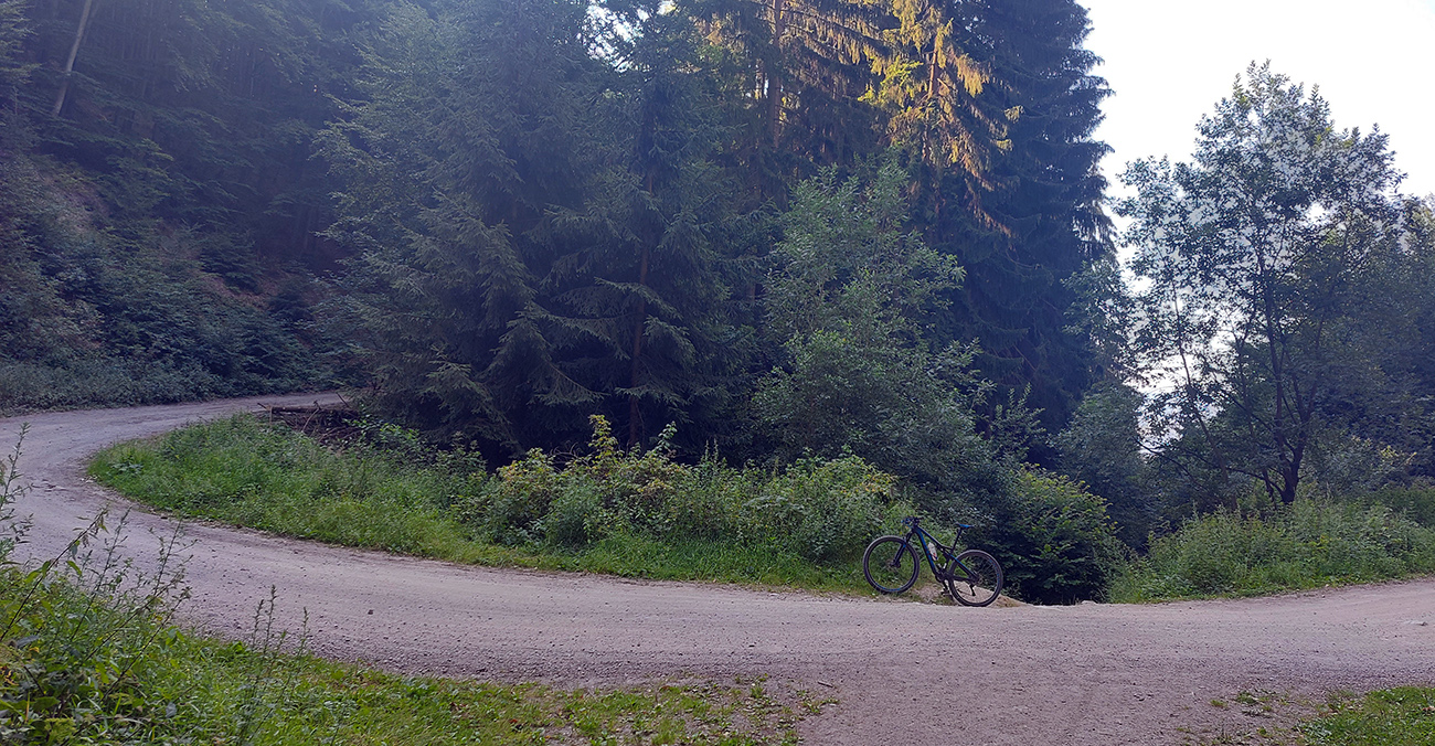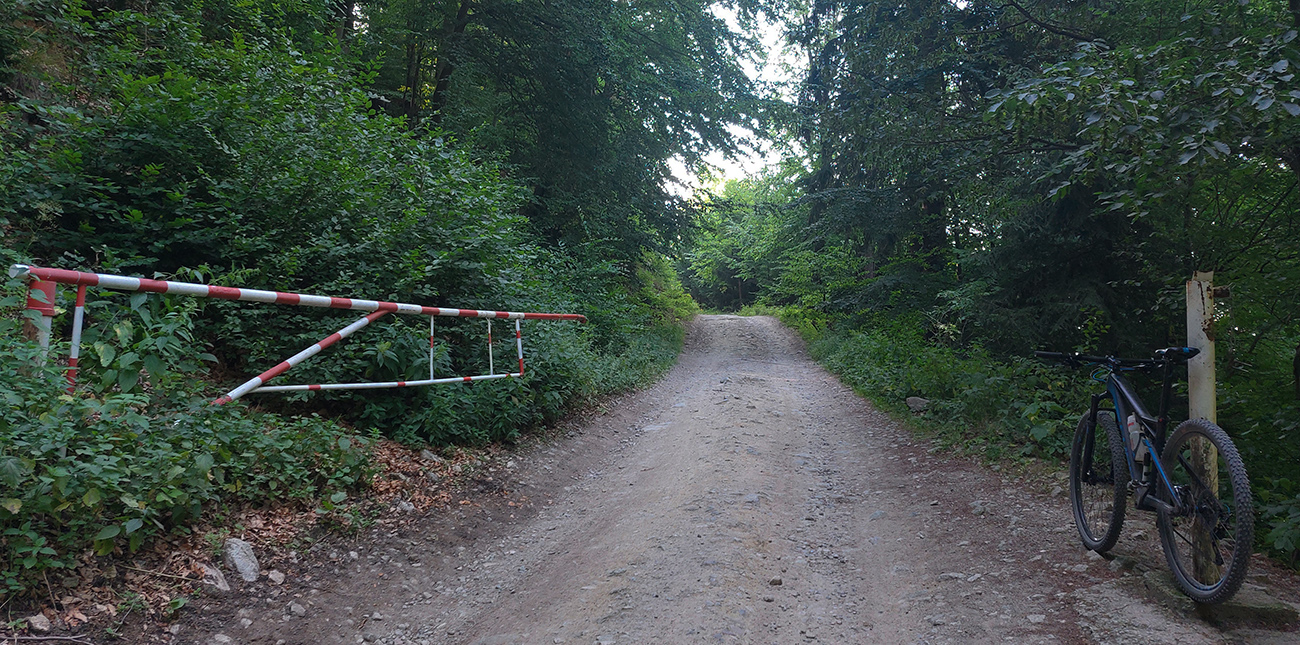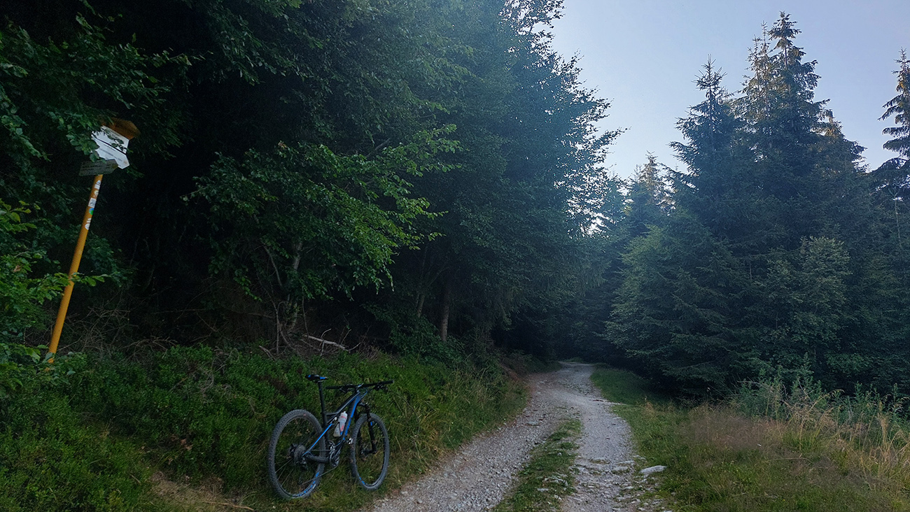 Výjazd na bajku „na Maguru“ je z tých troch najkratší a asi aj najpríjemnejší – podľa Stravy 11,5 km a 730 výškových, ale najmä príjemné škvrčanie relatívne rovnej šotoliny pod kolesami po celý čas. Cesta väčšinou suchá, aj nedlho po daždi, to sa skôr prášiť bude (ako na jednej fotke výborne vidno). Takmer celý čas vedie v príjemnom tieni, aj keď cez početné rúbaniská sú tu otvory na juh, do kotliny. Sklon ľudský, len „cieľová rovinka“ nad sedlom Príslop je na niekoľkých miestach strmšia a aj v kombinácii s väčšími kameňmi pod kolesami môže slabšieho technika trochu vyškoliť. No a posledné metre na terasu pred chatou sú najstrmšie a najhrboľatejšie z celej trasy, ale tam sa vždy veľa ľudí prizerá, tam sa už jednoducho treba hecnúť a nedať sa zahanbiť :-)