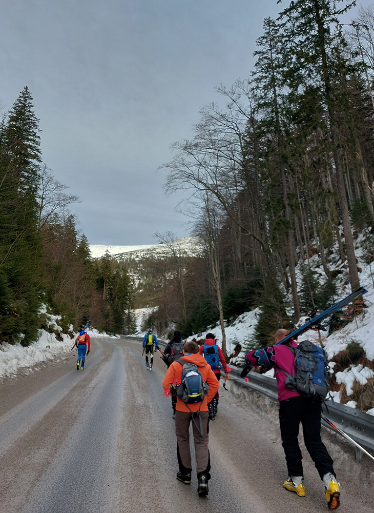 Kto prv príde, menej platí, takže na začiatok sme ešte vychytali jedno z posledných bezplatných parkovacích miest pri ceste, pri odbočke hore na Krupovú. Inak hore za rampami je to za desať. Lakomosť je tu samozrejme odmenená možnosťou prejsť sa s lyžami na chrbte tých pár stoviek metrov za snehom po ceste, kde je teraz viac posypu ako toho snehu.