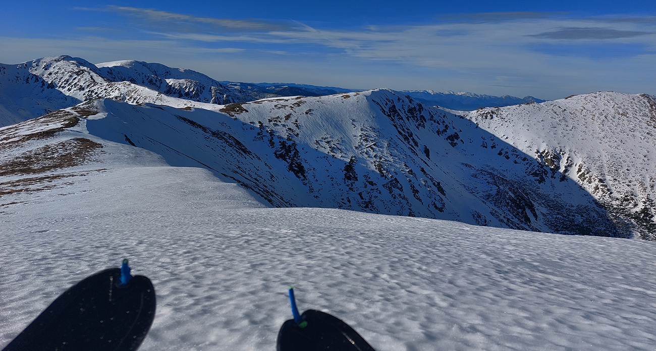 Do sedla sme ale nedošli, skončili sme pri pohľadoch k nemu z hrebeňových prevejov nad ním – len po okraji hrebeňa je to teraz relatívne pohodlné na poslednom úseku. Motali sa tam dole v tieni dvaja ľudkovia, stúpali hore, ktovie či to predtým aj zlyžovali. Dalo by sa, aj keď je tam ešte úzko a moc hlboko sa zjazdiť nedá. Povrch nič moc – kombinácia mokrého firnu a ľadovej kôrky, podľa pohľadov dole do Derešského kotla, z tých prevejov. Ale hrebeňovka smerom na Kotliská a ďalej by sa potiahnuť dala, hádam...