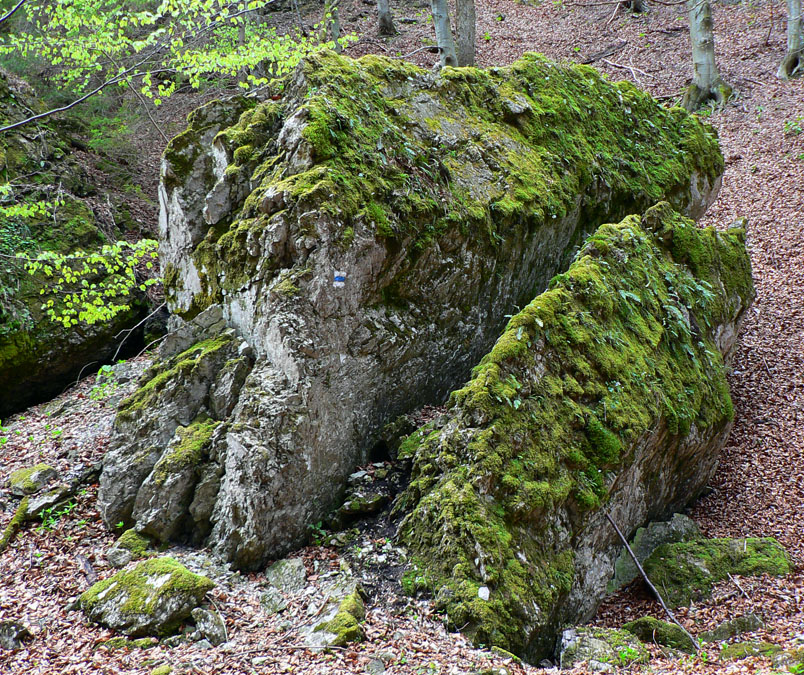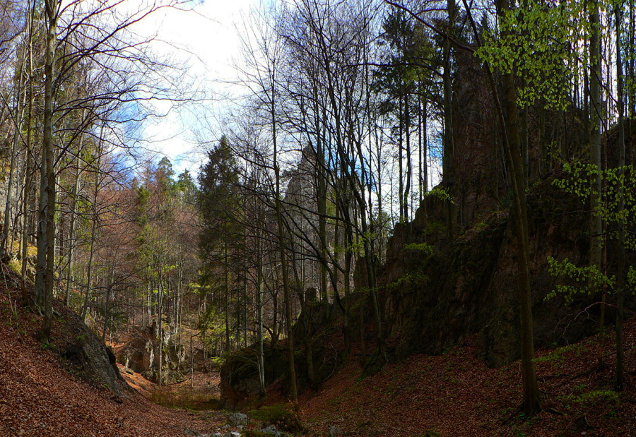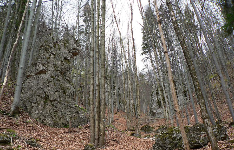 Chodník vedie jadrom NPR Veľká skalná síce dosť potkýnavo (hrubá vrstva lístia kryje konáre a skaly), napriek tomu sa oplatí často dvíhať hlavu. Pretože okolo po svahoch sú rozhodené zástupy skalných stien, veží a ihiel. Najlepšie je zájsť sem takto skoro na jar alebo neskoro na jeseň, keď nieto lístia na stromoch. Vtedy vyniknú.