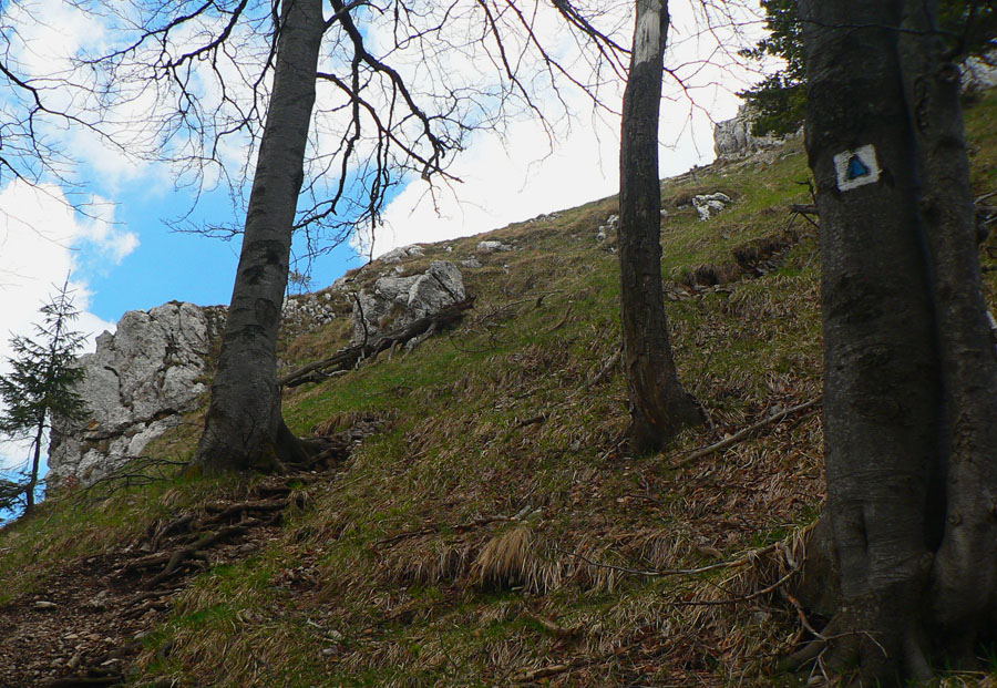 Chodník v lístí moc nevidieť, zato je čoraz strmší a najstrmší je na konci, pod hrebeňom. Hrdzavý smerovník, nepovie nič, tak valím ďalej príjemným traverzom do sedla pod Drienkom. Bukový les, sem-tam výhľady. Zo sedla na Drieňok je to vraj hodina, reálne tak 40 minút aj s vydýchaním, lebo strmé je to fest. Zato pekným, akoby parkovým lesom. Z predvrcholu je pekný pohľad dolu do doliny Rakše, ktorou sem hore ide ďalšia modrá značka.