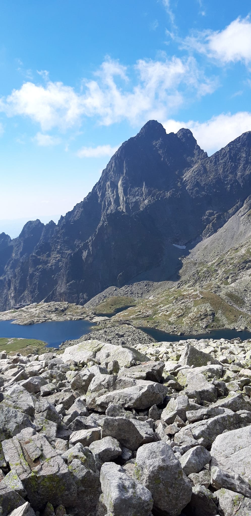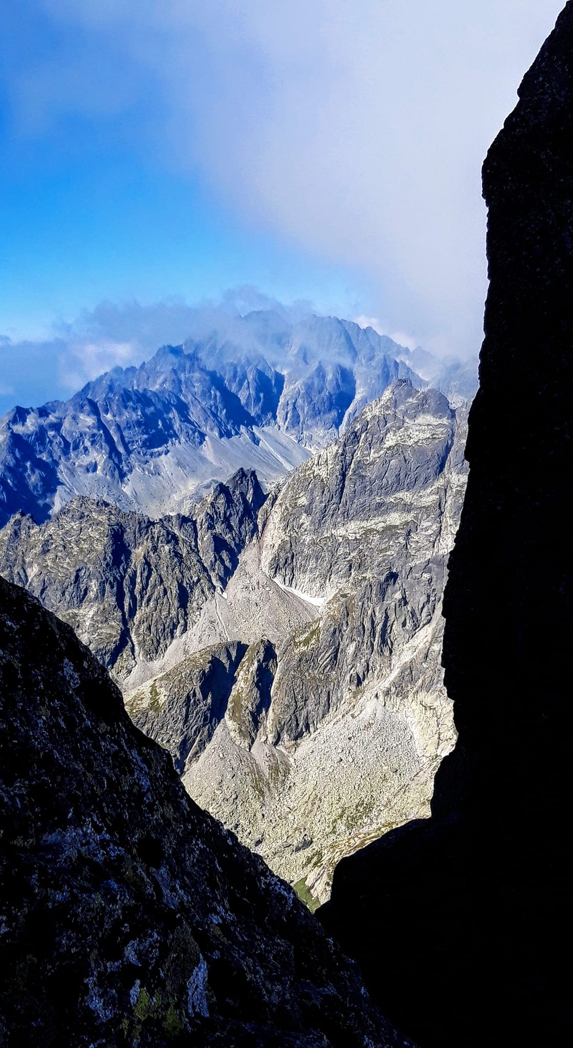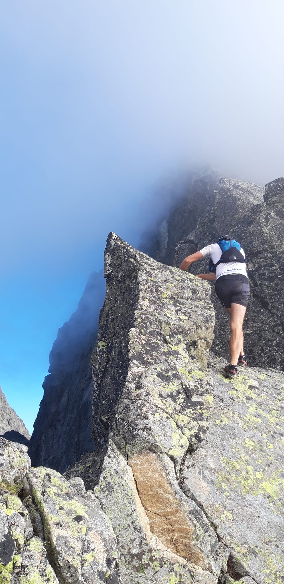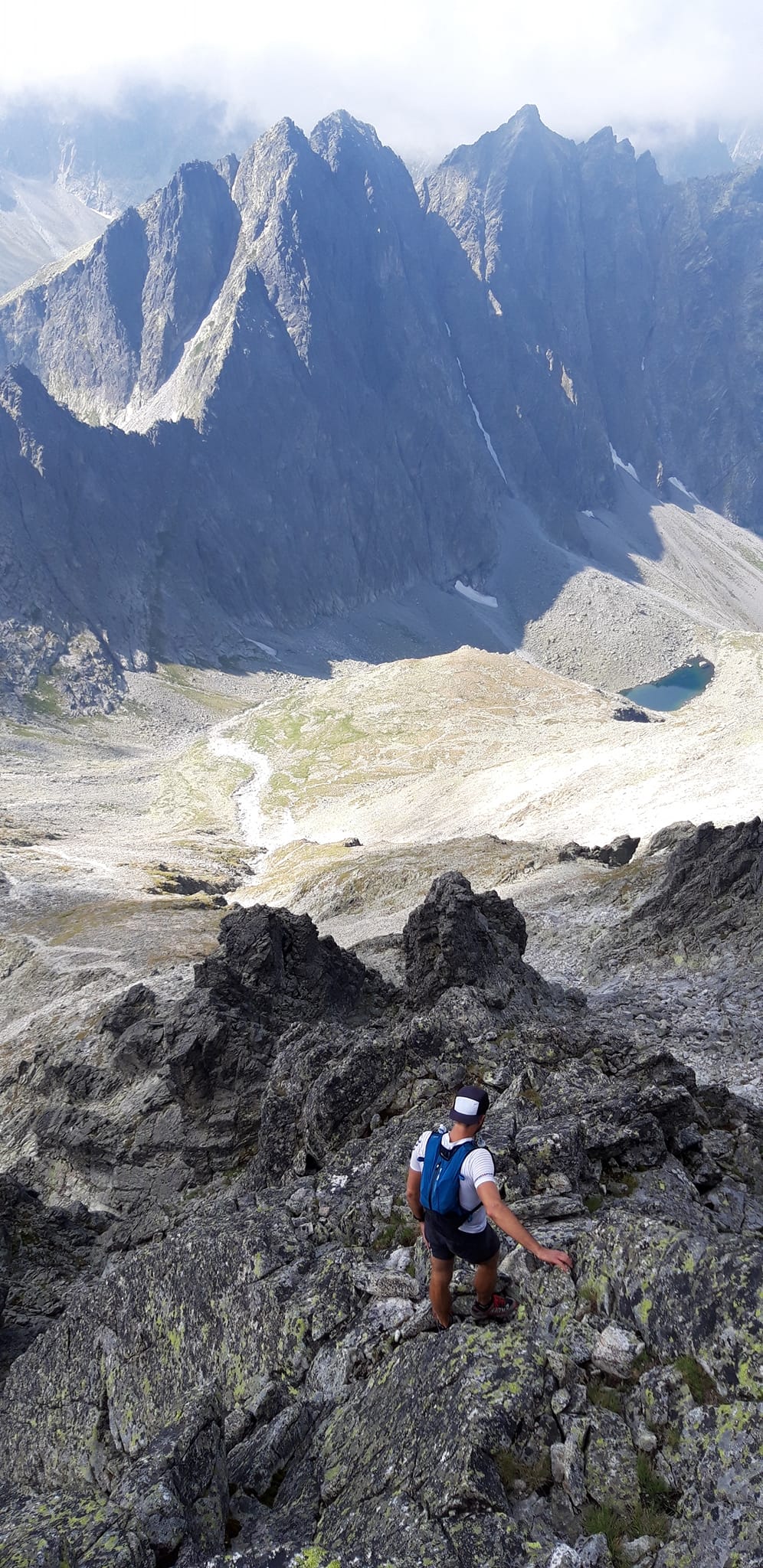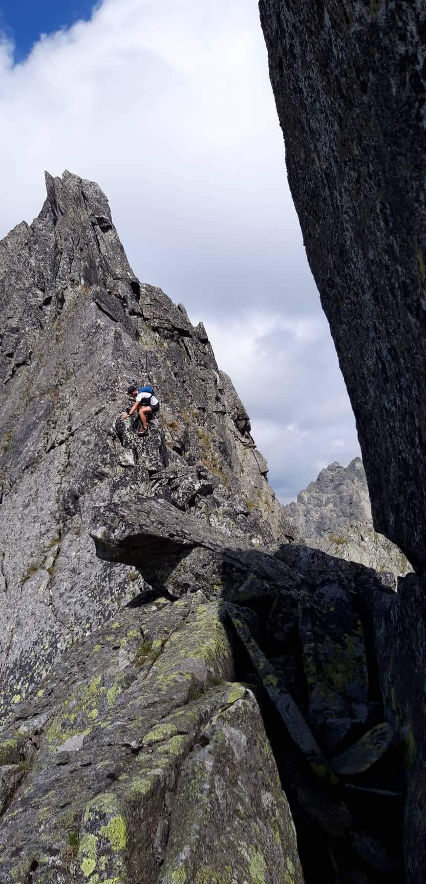 Konečne Gerlachovský štít . Kocháme sa výhľadmi . Pri pohľade na Lomničák nechápem ,ako som sa mohol odtiaľ dostať až sem . Keď však zbadám čo nás ešte čaká, prestanem sa rozplývať. Táto časť hrebeňa sa lezie veľmi málo. Musím sa nenormálne sústrediť, hlava mi už úplne vypína . Všade samé machy ,samé lokre . Stačí vybrať jeden osudový loker a čauky. Zachrániť ťa môže už len orol skalný ,ak ťa stihne zdrapiť do pazúrov pri voľnom páde. Gerlachovská veža (9) a konečne DESIATY - Kotlový štít. Tešíme sa ako malé deti .
