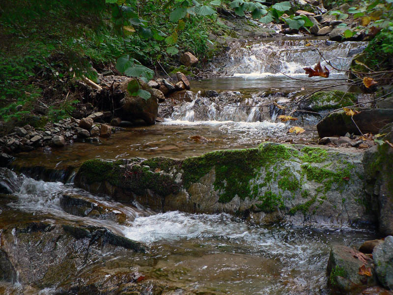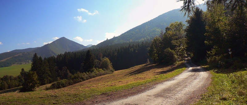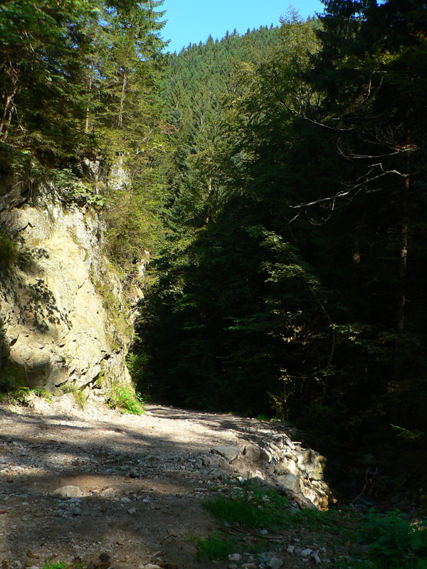 V doline stará asfaltka, potok skáče cez skalné prahy a malé pereje, v lese za každou zákrutou trčí nejaké bralo, príjemne sa šliape. Cesta sa mení na chodník korytom potoka po nejakej pol hodinke. Po chvíli sa ale dvíha nad dno doliny a naberá sklon. Prudko zahýba doľava do protismeru. Chodník akoby sa chvíľu nevedel rozhodnúť kadiaľ. Ale nakoniec znovu zákruta, tentoraz nazad do správneho smeru doprava a priamo hore, riadne strmo po spádnici. Ešte prechod cez lúku so senníkom a o chvíľu je chodník von z lesa. Zároveň sa jeho sklon zmierňuje. Tu sa otvárajú prvé výhľady – zatiaľ len na Príslopok vpredu (spoza neho trčí vrchol Malého Kriváňa) a na Stratenec a Suchý vpravo. Z malej plošiny vpravo od chodníka vidno celú dolinu aj so Žilinou v pozadí. Ideálne miesto na oddych.