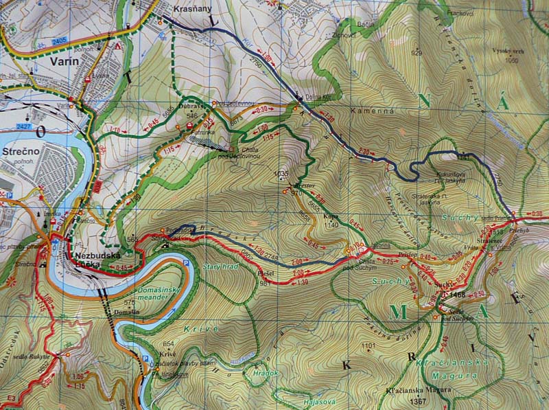 Krasňany sú pre „cezpoľných“ trochu od cesty, takže kto vyskočí z vlaku či busu na hlavnom ťahu v Strečne, môže najprv využiť žltú značku zo stanice, ktorá sa v ústí doliny na modrú pripája. Vedie najprv okolo malého zatopeného lomu nad Nezbudskou Lúčkou. Celkom pekne je tam, nebyť odpadkov všade, kam oko dovidí. Potom podhorím, striedavo lúkami a okrajom lesa, pomedzi množstvo chatiek. V lese je smer jasný, na lúkach sa chodník často stráca vo vysokej tráve a treba trocha pošpekulovať, kým človek trafí ten správny smer. Ale značky väčšinou v diaľke vidieť. Cesty vedú zdola z kotliny do hory, teda skôr krížom cez značku. Na poslednom úseku je to už cez lúky skôr intuitívne od stromu k stromu, ale ústie doliny je priamo vpredu, zablúdiť sa nedá.
