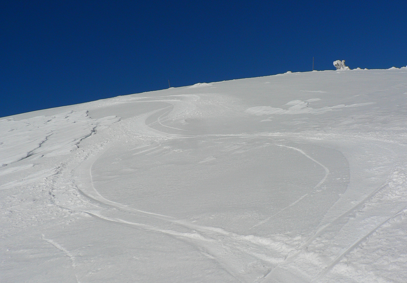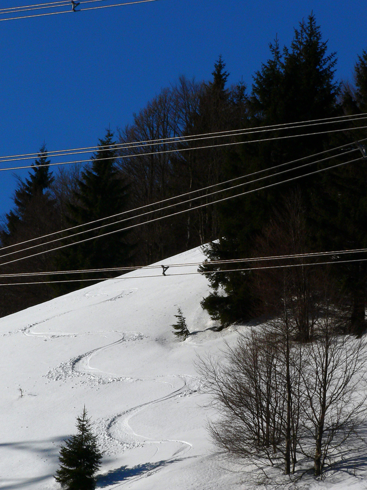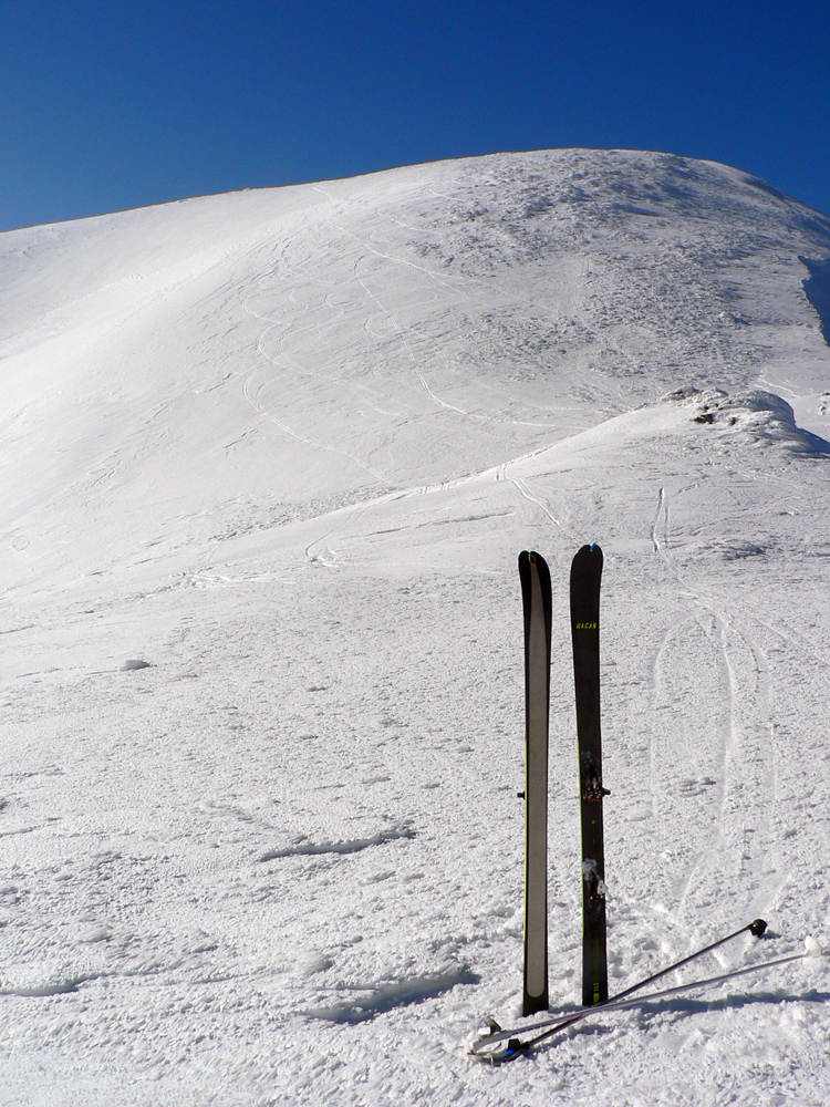 Celý masív až pod Košarisko bol síce ešte ľadový a poriadne hrkotavý, ale od Sedla pod Skalkou až na Chopok už také jarné optimum – niečo málo čerstvého, vlhkého snehu na starom, ľadovom základe. Rýchla stopa, len v prudších traverzoch sem - tam spodná lyža ustrelila smerom dole, do doliny.