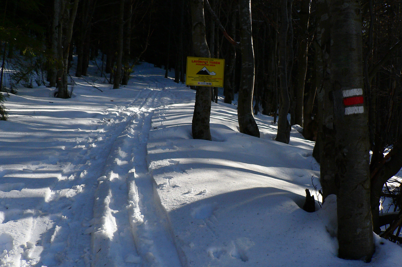 Teplota tiež príjemná jarná, jemne nad nulou, celý deň som šiel bez rukavíc, bez čapice, bez bundy. Aj keď stretol som partiu naloženú poriadne na ťažko, a pritom obalenú „v goráčoch“ aj s kapucňami. A jeden mal aj lyžiarske okuliare! Možno sa radšej potil ako opaľoval :-) Severáčik taký jemný, akurát osviežoval, bez neho by bolo prihorúco.
