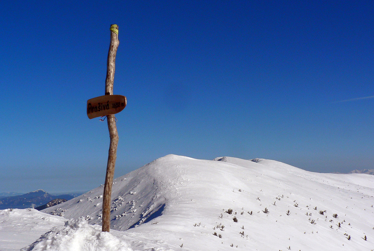V lese smerom pod Prašivú ešte sa snažil suchý sneh lepiť na mokré pásy, ale nad lesom to už bolo pred desiatou natavené akurát tak, že by sa dala stopa ťahať aj kolmo hore. Niekto to aj skúšal, predo mnou :-) Držalo to fest.