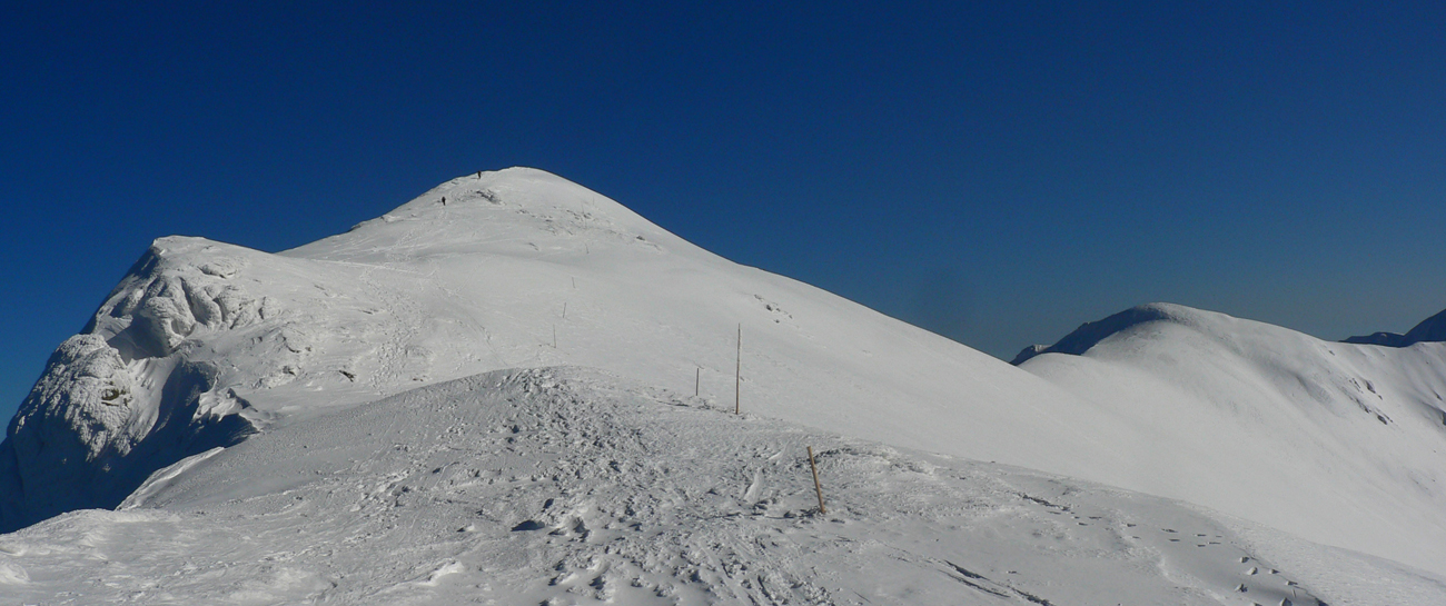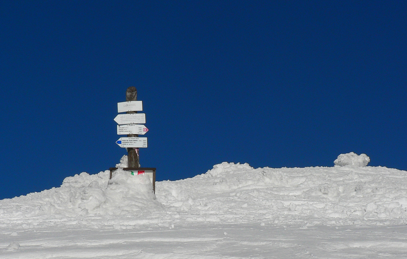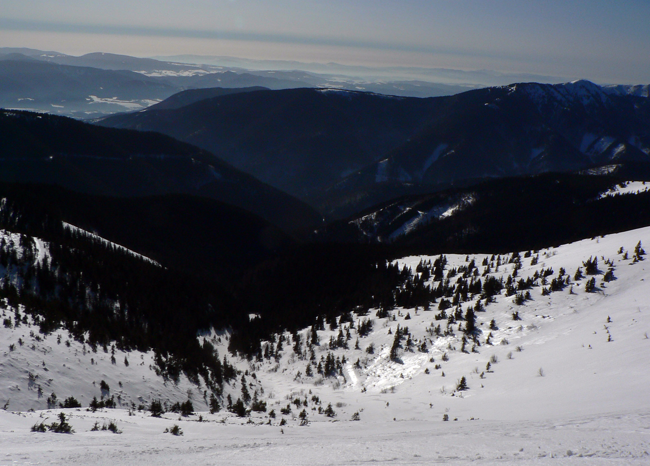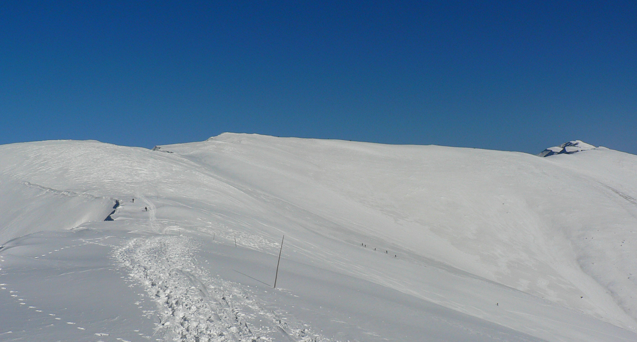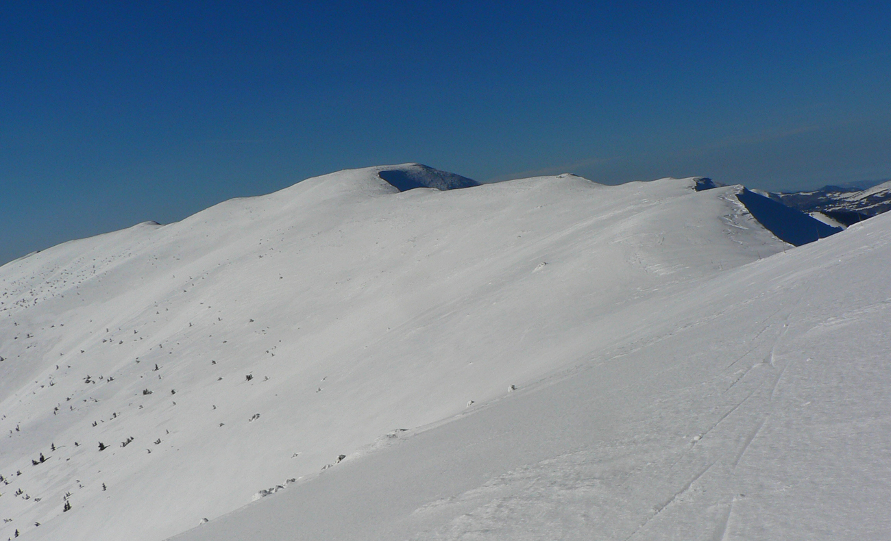 Kde to bolo pod lyžami ešte tuhé, samozrejme, že to bolo poriadne hrboľaté, vyfúkané do tvaru šindľov, žraločích zubov a podobných pásožravých patvarov. Ale chodníček vždy vydupaný pomedzi to. Pešiakmi a snežničiarmi. Ale v podstate väčšina hrebeňa je priechodná aj bez snežníc.