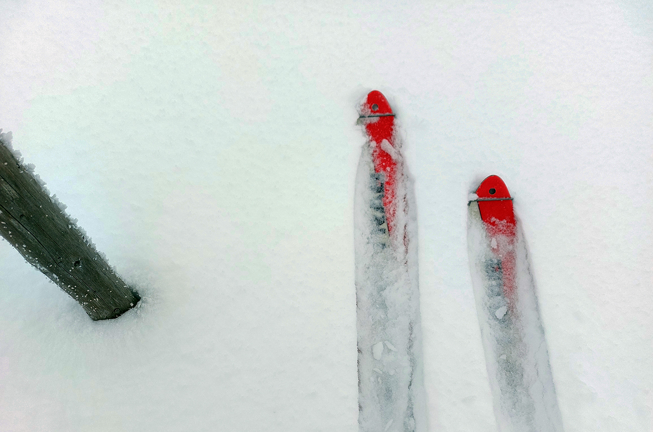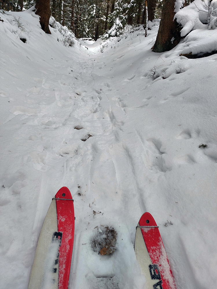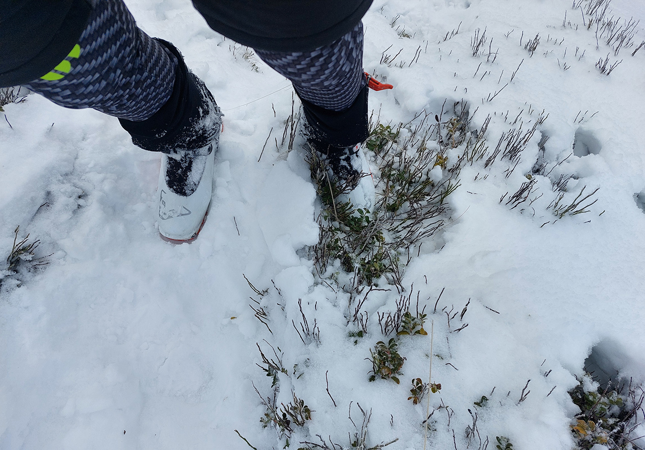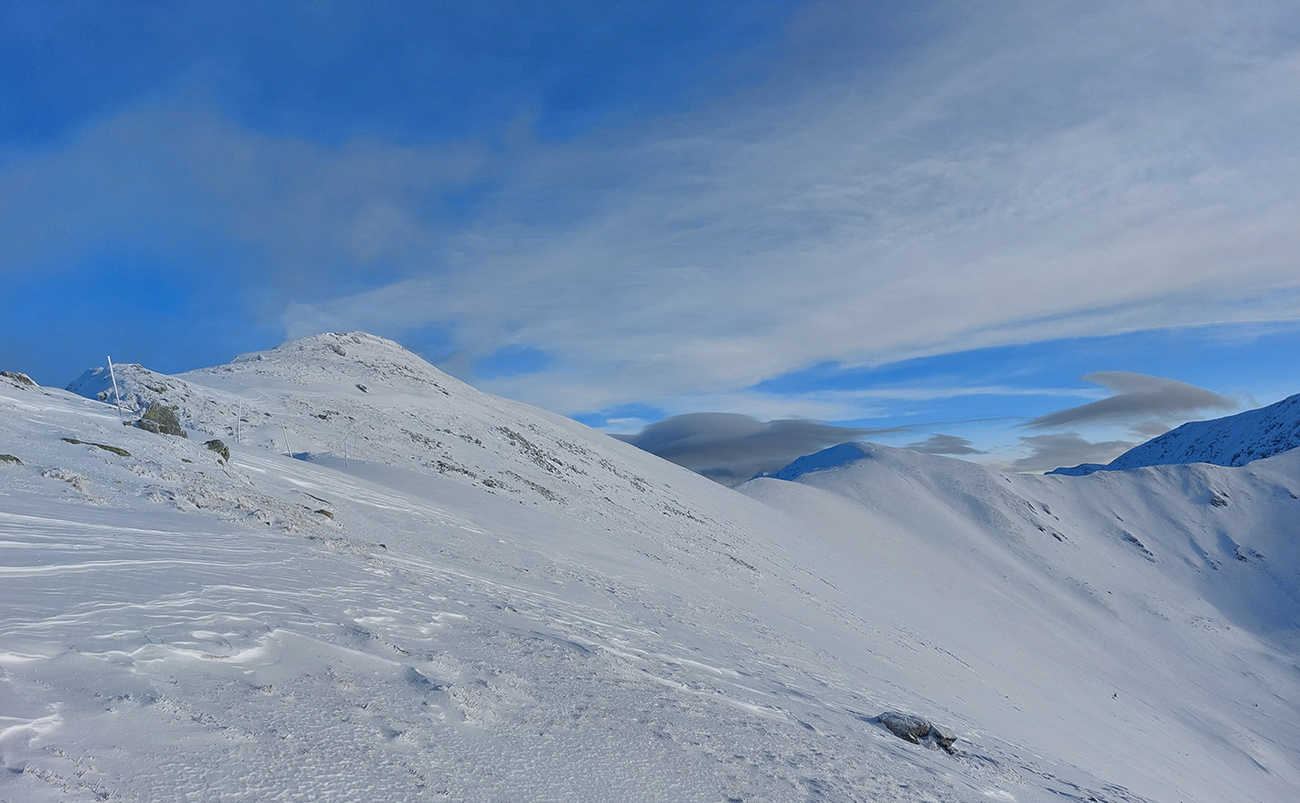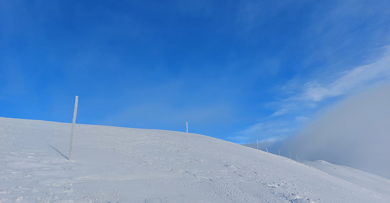 Stúpanie na Prašivú ma na pásoch bavilo len v spodnej časti, aj tam však bolo kameňov hojne. Potom lyže na batoh, inak by to ani nešlo. Aj nad lesom stopa len pre pešiakov, od pešiakov. Vďaka „predchodcom“ za komfortné schodíky a počasiu za posledné rozhľady. Do lyží som naskočil až hore v kosovke, kde sa sklon zmierňuje. Zároveň som ale vliezol do mlieka a jedovatého severáku. Pritom o kus nižšie to vyzeralo, že oblaky sú neškodne vysoko: