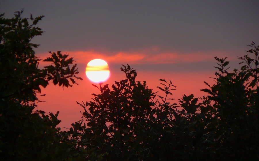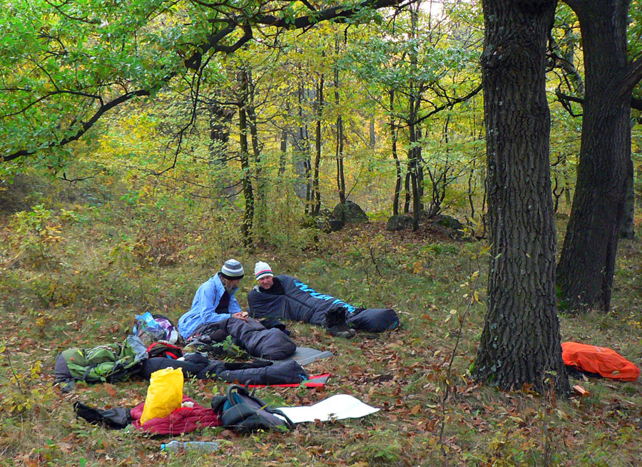 Tak už je „zajtra“, neochotne lezieme zo spacákov pod dubom, ktovie či cerovým. Lebo ráno je dáke zatiahnuté, to čo? Pred hodinou ešte hviezdy svietili... Expedícia pokračuje druhým, teda posledným dňom. Prestavujem hodinky na zimný čas a aby som sa zahrial, klušem na vyhliadku na Pohanskom vrchu loviť východ slnka. Vyšlo – z hmly v doline, celé červené. A o chvíľu hneď aj zašlo do mraku nad kopcom. No, medzera to nebola ktovieaká, ale stihli sme. Tak raňajky, zbaliť a preč. Ale Pohanský hrad sa nás tak rýchlo nezbaví!