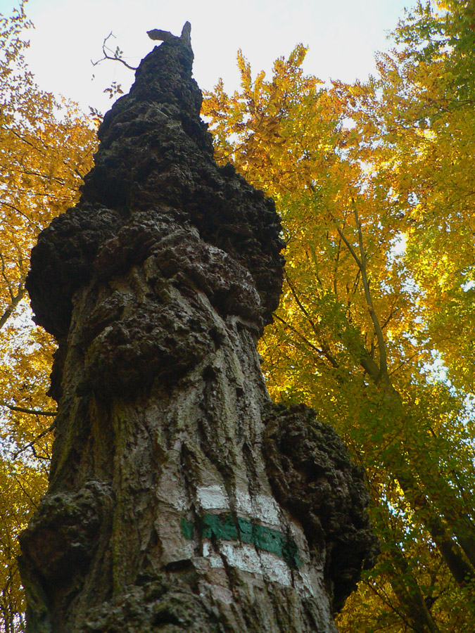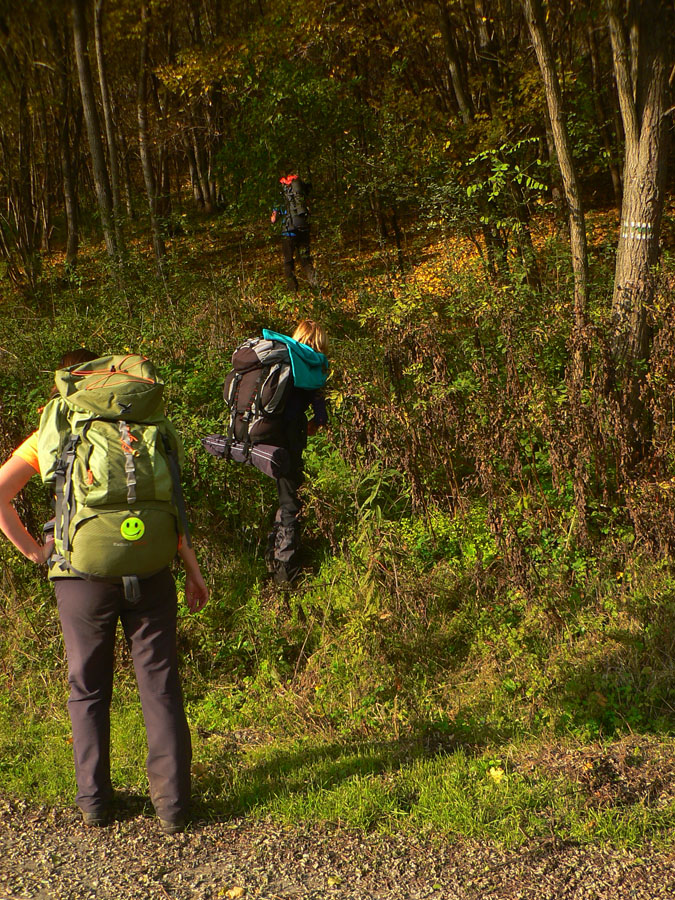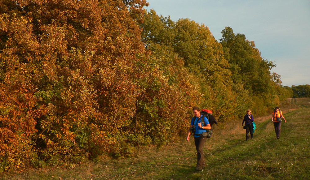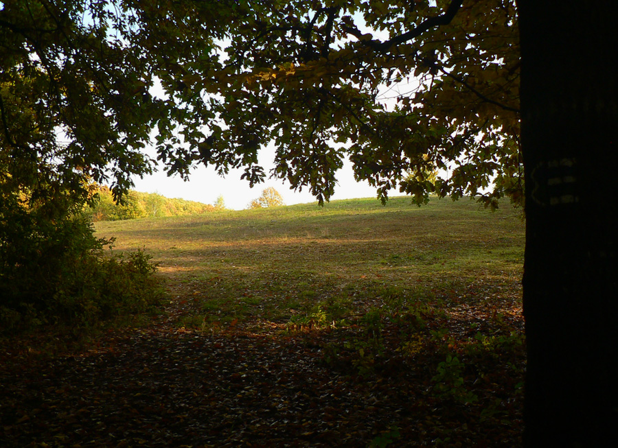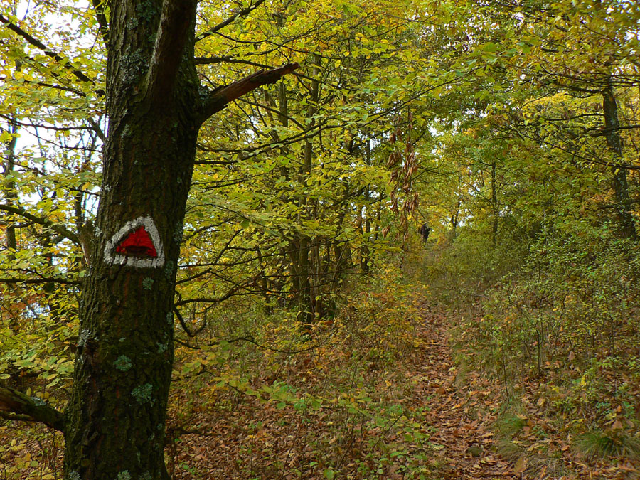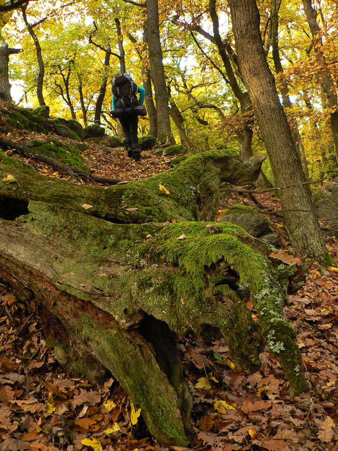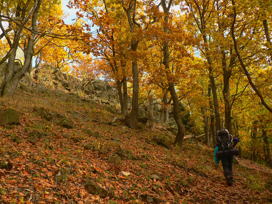 Začíname rátať hodiny do odchodu vlaku z Hodejova, tam sa musíme prepracovať popod Zabodu a cez Steblovú skalu. Obe vidno na severe. Zatiaľ máme tak hodinu rezervu, pome radšej... Strmóóó dole, riedkym lesom, celým do žlta. Akonáhle sa sklon zmierni, už sú tu zvážnice a blato a koľaje traktorové. Ešte že tie farby...