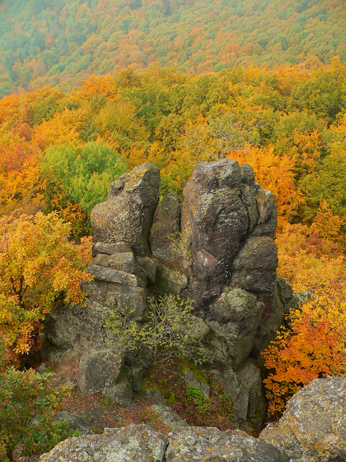 Lebo sa ešte raz vraciame kus nazad, k vyhliadke na okraji tejto lávovej plošiny, loviť ešte dáke zábery. Útržky hmiel sa dvíhajú z farebného lesa, pod skalným zrázom skalné mesto obrastené machom, no rozprávka - aj v tej sivote.