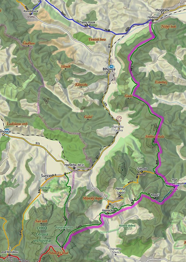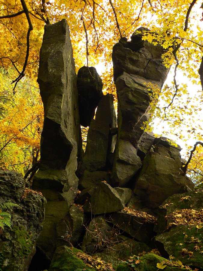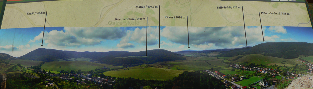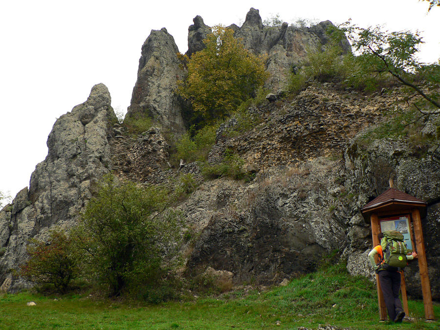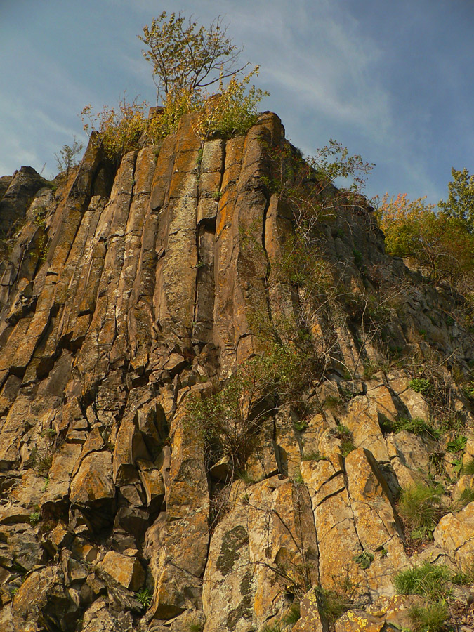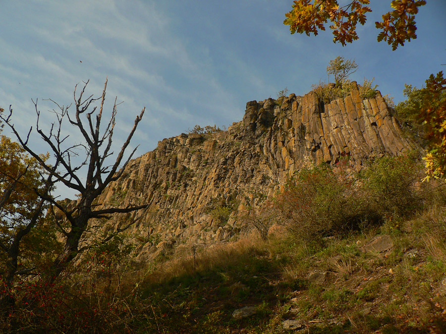 A zas hľadáme značku, lietame zo zvážnice na zvážnicu a nikde nič. Rezerva sa stenčuje, aj keď ešte stále žije. Nakoniec dáko intuitívne tú Steblovú skalu (486m) triafame. Keď už zas lezieme takmer po štyroch, vieme, že ideme správne. Hlava hore: nádherné čadičové stĺpy stoja v rade ako píšťaly organu. Nad nimi na plošinke smerovník a výhľad do doliny Gortvy, kade sa (dúfam) budeme o dve hoďky viezť vlakom.