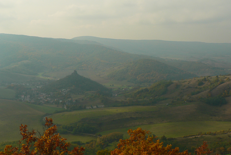 Potom už husací pochod dole zo „stolovej hory“. Les je bez slnka zatiaľ trochu všedný, ale to sa isto spraví. Našťastie nad stromy trčí plešatý Tilič (475m) s majestátnym výhľadom od juhu cez východ k severu. Presne tam, kam máme namierené. Najbližšie je Hajnáčka. Zas skúšame, čo sme schopní odfotiť pomedzi hmly a mraky, konkurujeme miestnemu fotoamatérovi, ktorý si musel ráno isto dobre privstať, aby sem dotiahol svoju strojovňu až z Fiľakova, na bajku. A vrtí sa po kopci hore-dolu, usilujem sa odkukať aspoň to, kam mieri objektívom.