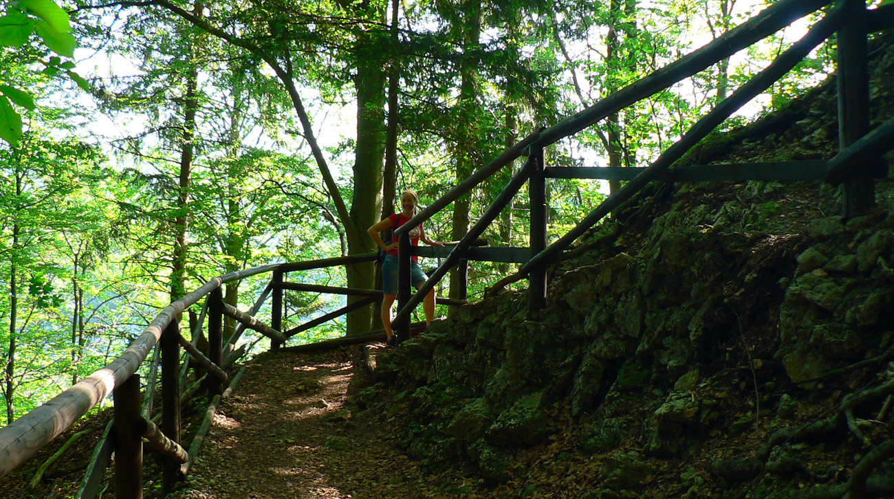 Výhľady cestou nie sú, až hore: krásne vidieť trávnatý hrebeň medzi Líškou a Krížnou. Ich „ikonické stavby“ (ruina lanovky a vojenský vysielač) sú nezameniteľné. Nižšie, nad neviditeľnou, ale hučiacou cestou, sa vypína jedno z brál Harmaneckej doliny, ktorého majestátnosť sa práve pri pohľade z cesty dá len vytušiť. A to je tak všetko, treba obrátiť pozornosť na druhú stranu, k jaskyni.