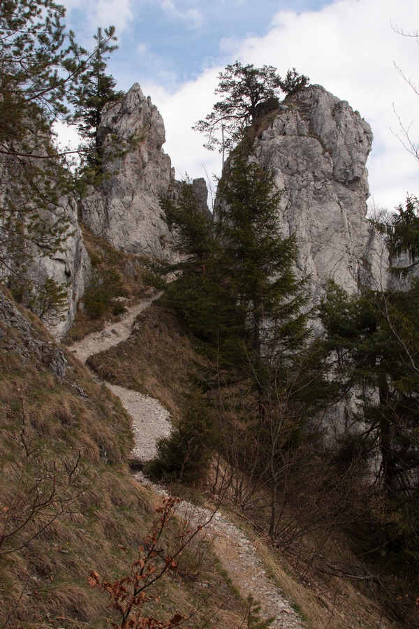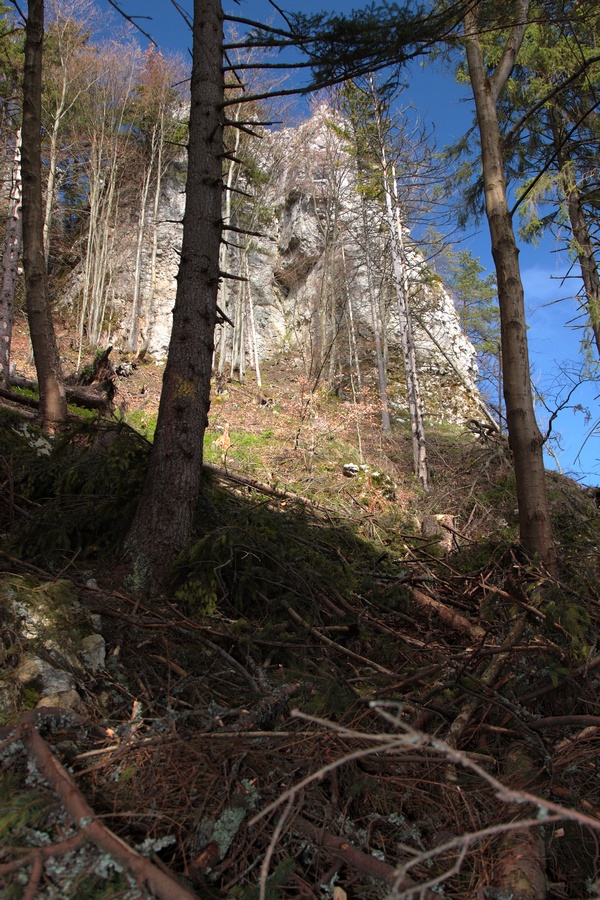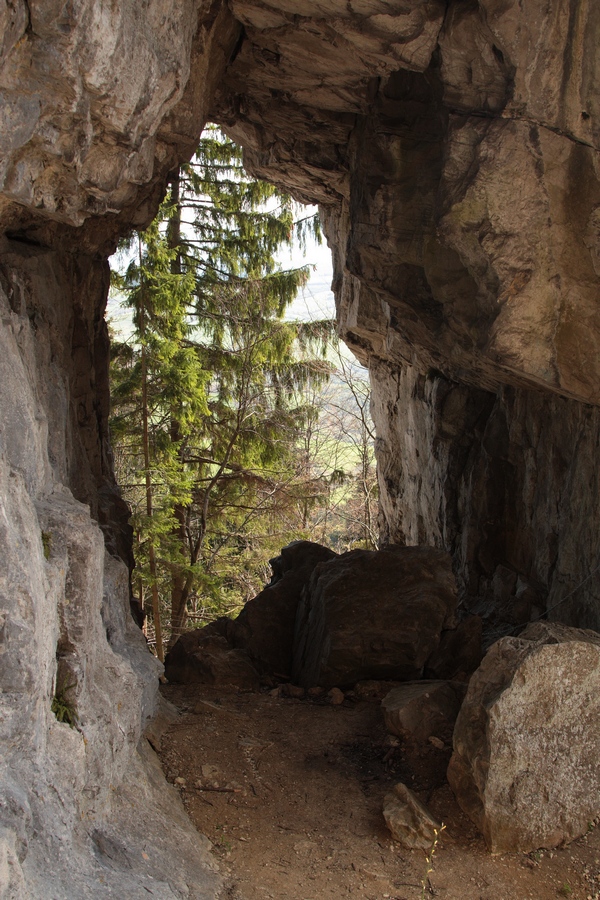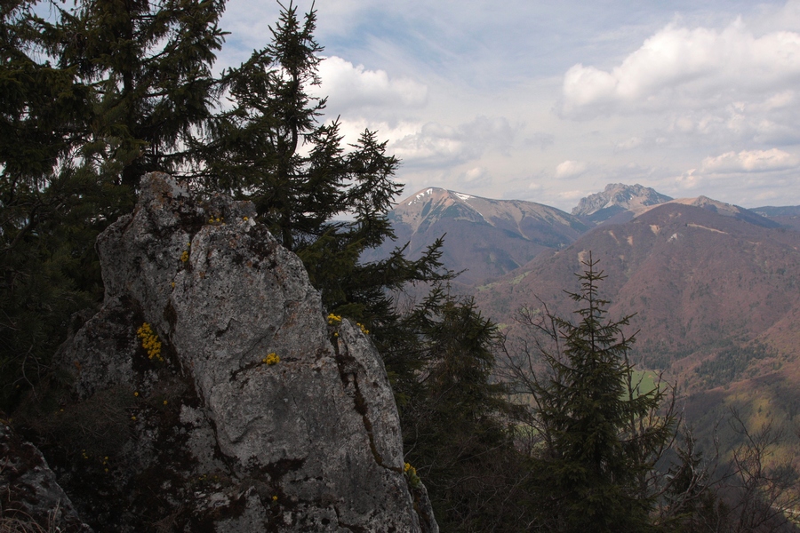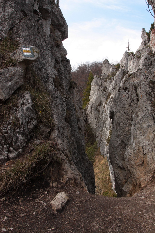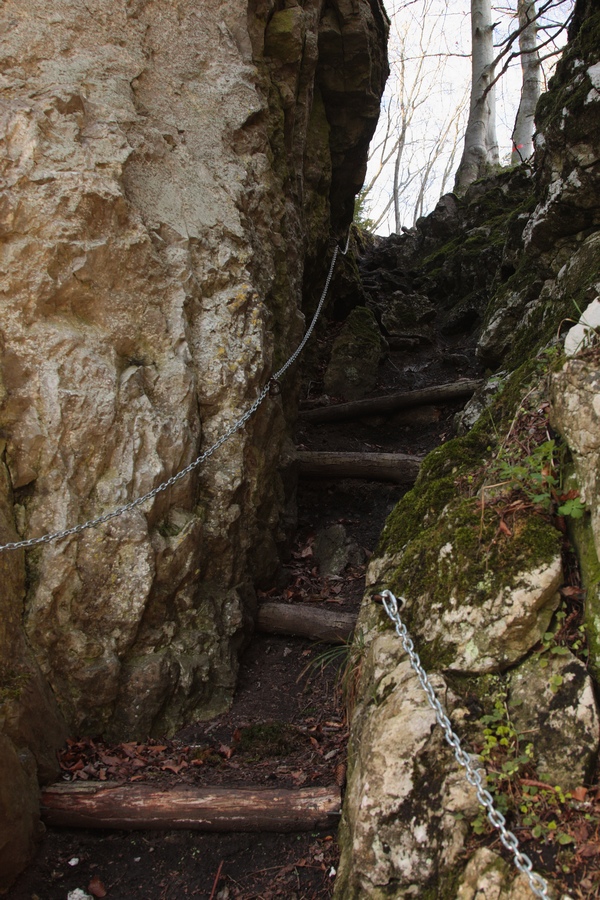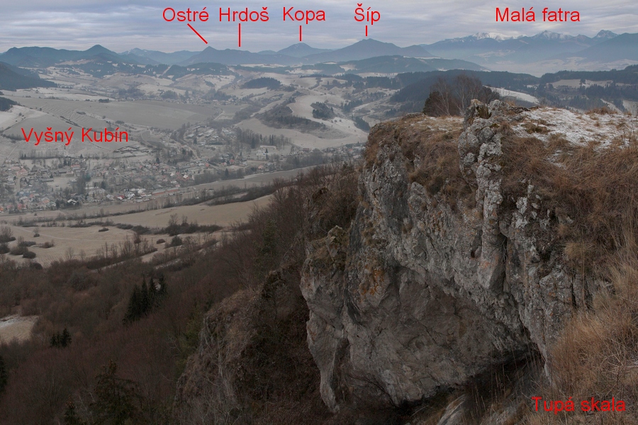 Ešte kúsok dedinou, potom poľnou cestou do sedla smerom na Žaškov. Široké lúky bývajú v zime rajom pre bežkárov. V sedle sa cesta stáča do lesa a začína prudšie stúpať. Najstrmšie je to až tesne pod skalou, kde nad serpentínami v lese jasne svieti veľké skalné okno. Prístup do okna je uľahčený reťazami z jednej aj z druhej strany, za oknom sa nachádza vstup do Žaškovskej jaskyne. Škoda, že opäť raz nemám so sebou čelovku, jaskyňa je údajne dlhá až 120 metrov. Od okna vedie chodník strmo hore na hrebeň cez skalnú puklinu. Aj tu sú reťaze a pomocné schodíky, ale po daždi to musí byť celkom slušný hardcore. Na hrebeni sa sklon zmierni a po pár minútach prichádzam na vrchol Hrdošnej skaly (902m). Výhľad z nej je najmä na sever a východ, dominuje Choč, Západné Tatry a kúsok naľavo Kubínska hoľa. Ďalej na Hrdoš (Skríželnú skalu, 954m) je to len 15 minút pohodlne lesom. Tentokrát sa otvárajú výhľady hlavne na západ na Kopu, Šíp a hrebeň Malej Fatry.