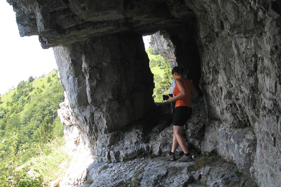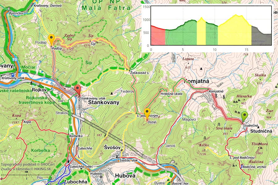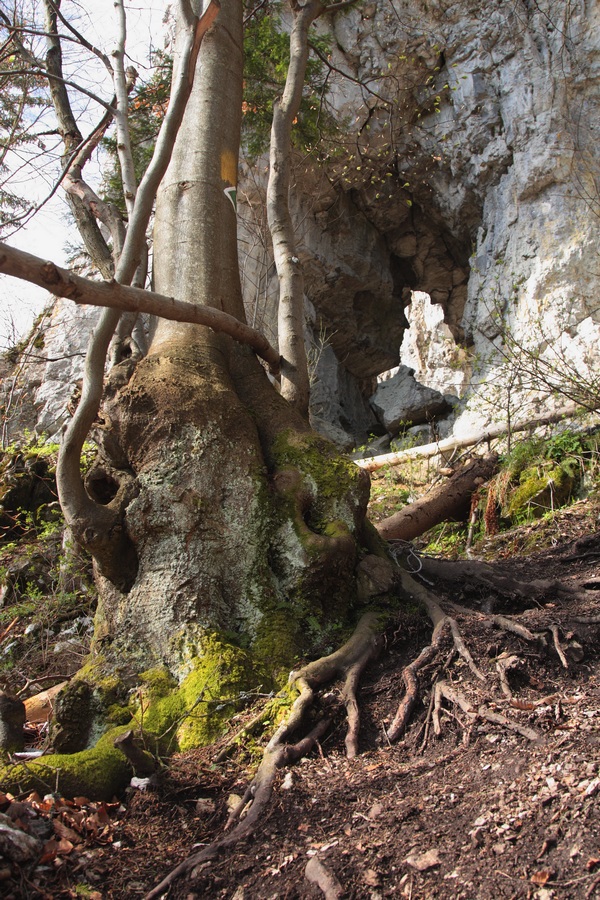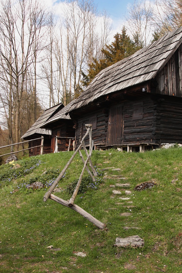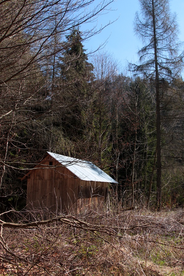 Ďalej je to už klasický výstup. Pod vrcholom si neodpustím návštevu jaskyne s jazierkom a oknom s výhľadom na hlavný vrchol Šípu (1170m). Ten je každú jar obsypaný poniklecmi. Teraz už končia, no aj tak ma potešia. Skalné mesto a Zadný Šíp (1143m) s obrovským krížom ma však lákajú ďalej. Tu už stretám kopu ľudí, no výhľady sa vďaka oblakom kazia. Rýchlo zbehnem strmým chodníčkom k osade Podšíp, prvá čiara k fajnovému prameňu. Nemám sa už kam ponáhľať, dávam si šlofíka pri minulosťou nasiaknutých dreveniciach. Pokoj, aký tu vládne, ma nabíja energiou. Túru plánujem ukončiť v Stankovanoch. Lávka v Dierovej je síce už spojazdnená, ale odrádza ma záver frekventovanou asfaltkou. Do Stankovian sa vydávam intuitívne vyšlapaným chodníčkom, občas sa na strome zjaví značka cyklotrasy. Dosť sa čudujem, lebo terén je miestami hodne nepríjemný aj pre pešiakov, pre výšlap na bicykli absolútne nepoužiteľný. A možno tomu len nerozumiem :o)