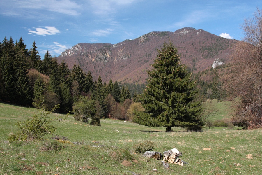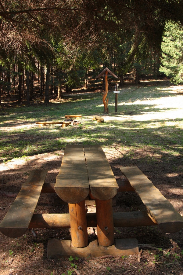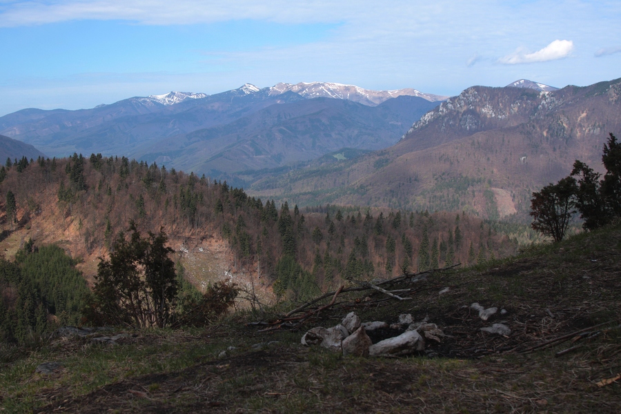 Tou istou trasou sa musím vrátiť do sedla pod Ostrým a ďalej do Žaškovského sedla. Traverz lesom je dosť nezáživný. Kúsok pod sedlom nachádzam slušný bivak blízko prameňa, no tiež zisťujem, že v tomto neprívetivo vyzerajúcom lese nie som sama. Stopy jasne hovoria o dobrých 300kg nie tak dávno sa presúvajúcej živej hmoty. Ej, veru si aj hvízdnem, ťapnem, podskočím, len nech som čo najskôr na lúkach. Sponad Žaškovského sedla mám už ako na dlani môj posledný dnešný cieľ - Šíp s obidvomi jeho vrcholmi.